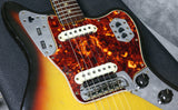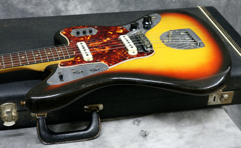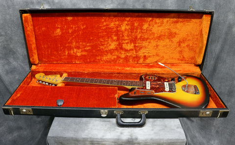 1965 L series Fender Jaguar, serial L64680, Sunburst finish in good condition. It has a tortoise pickguard and a rosewood fingerboard with an unbound neck. It comes with a period correct case.