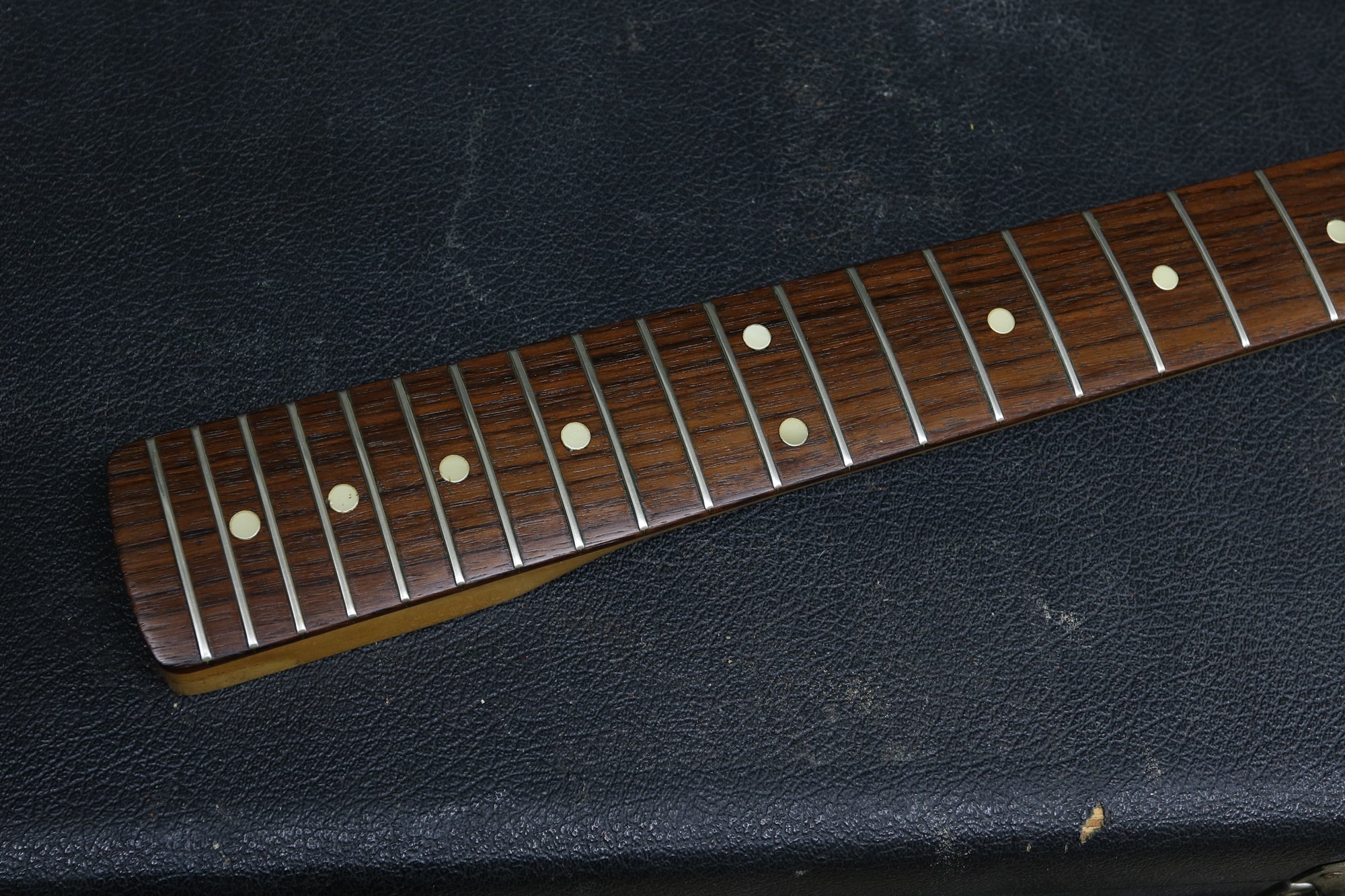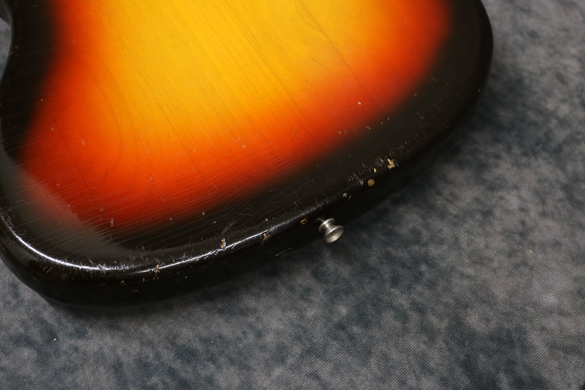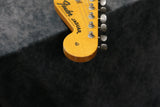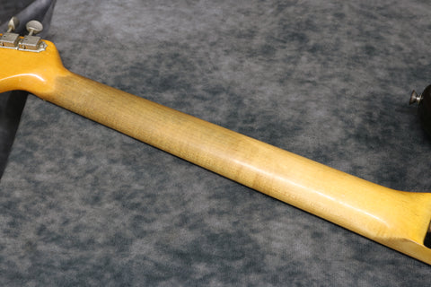 This is a lovely guitar with plenty of mojo. It has moderate play-wear throughout with lacquer checking and small scuffs and dings in the finish. The back of the neck has some play-wear through the finish hut no big dings or scuffs. The headstock is fairly clean with only minor wear and small scuffs. All hardware works perfectly, including the trem arm and truss rod. The frets are in great shape.