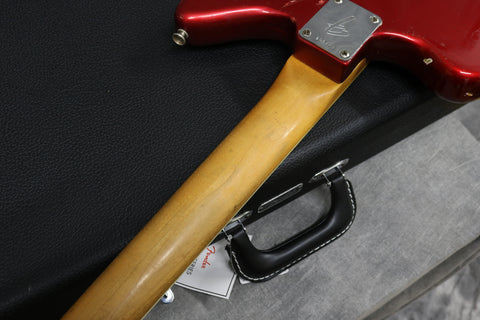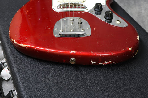 1966 Fender Jaguar, Candy Apple Red custom finish with matching headstock in fair-good cosmetic condition. It has a 3-ply white pickguard and rosewood fingerboard with pearl dots. There are extra screw holes under the tuners for Klusons, given that the type of closed back F stamped tuners currently fitted are period correct, i'm not sure if these were on there originally and changed for klusons or vice-versa. (either way, its had Klusons on at some point) There are also screw holes either side of the tail-piece, for what purpose i'm not sure. (possibly some kind of metal cover?) Everything else is original to the guitar. It's supplied in a brand-new Fender case and comes with 3-months warranty and a 7-day returns policy.
