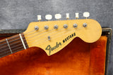 A classic short-scale Fender offset guitar showing general wear from use and age with mainly light scuffs, dings and lacquer checking on the body, neck and headstock. There is a larger ding along the bottom edge of the body. It plays very well and has a comfortable medium-C neck profile and is a great sounding guitar with the original single-coil pickups delivering a bright and jangly Fender tone with lots of detailed clarity.