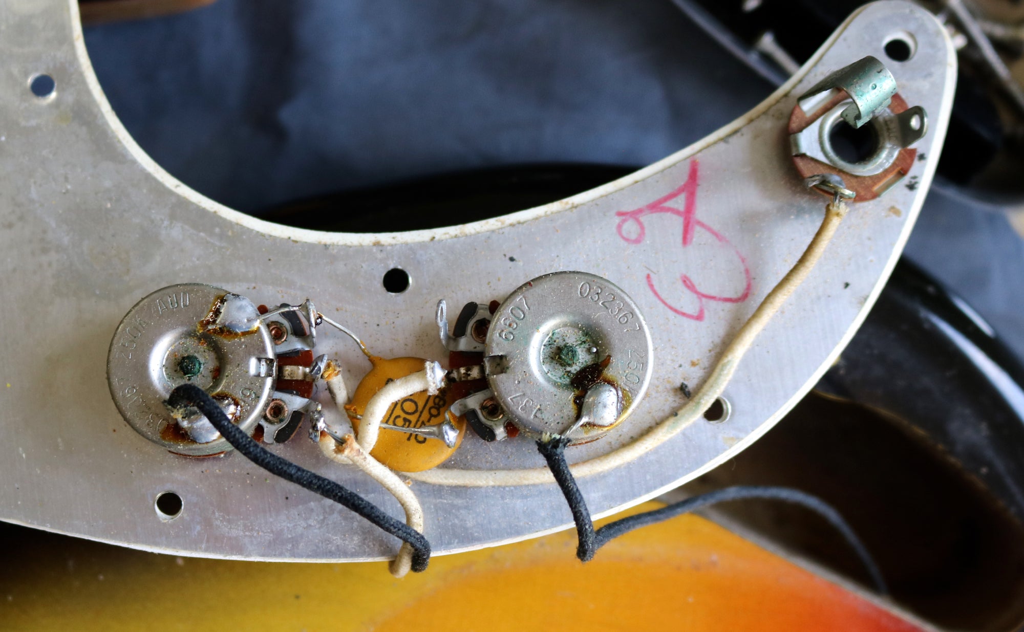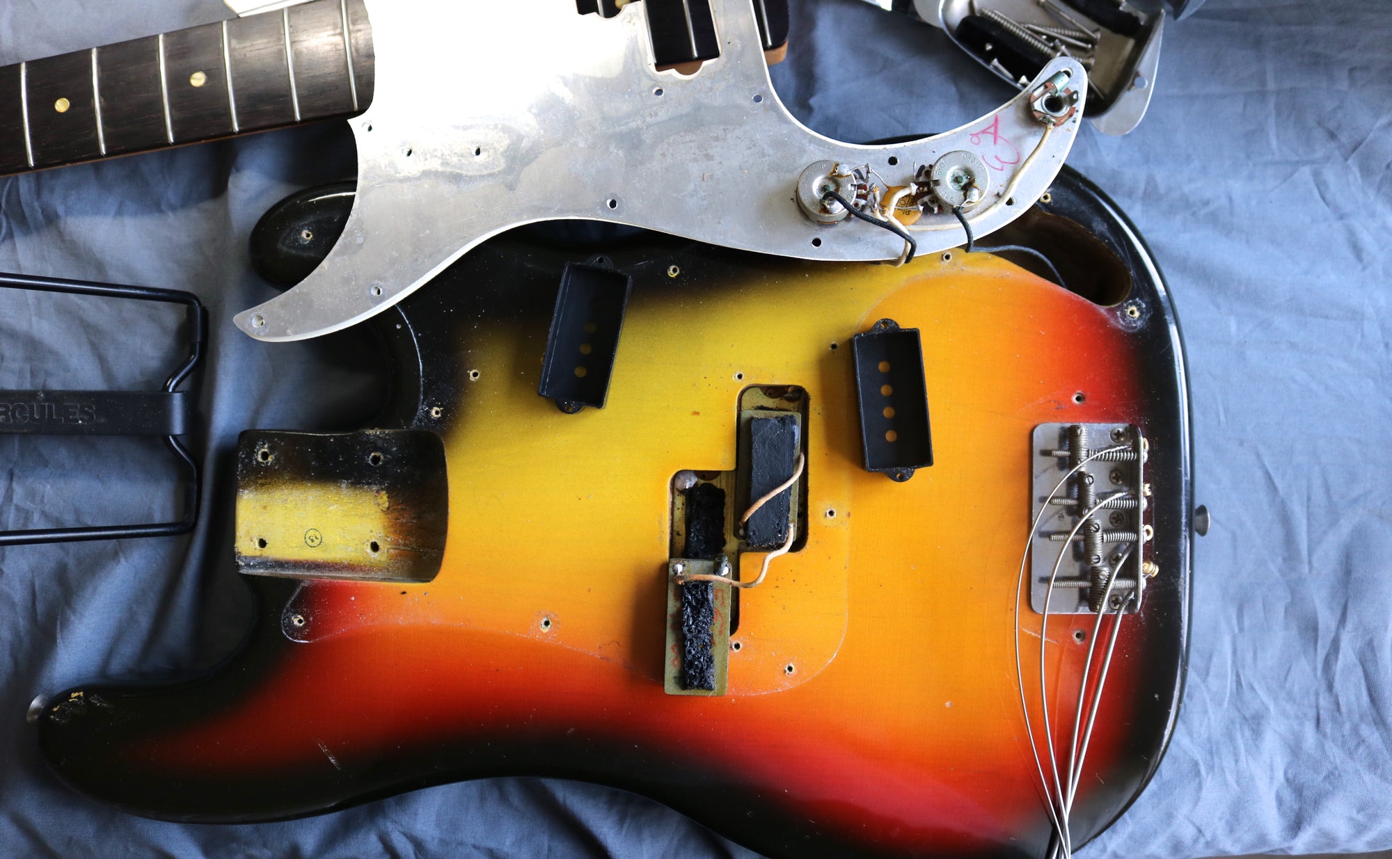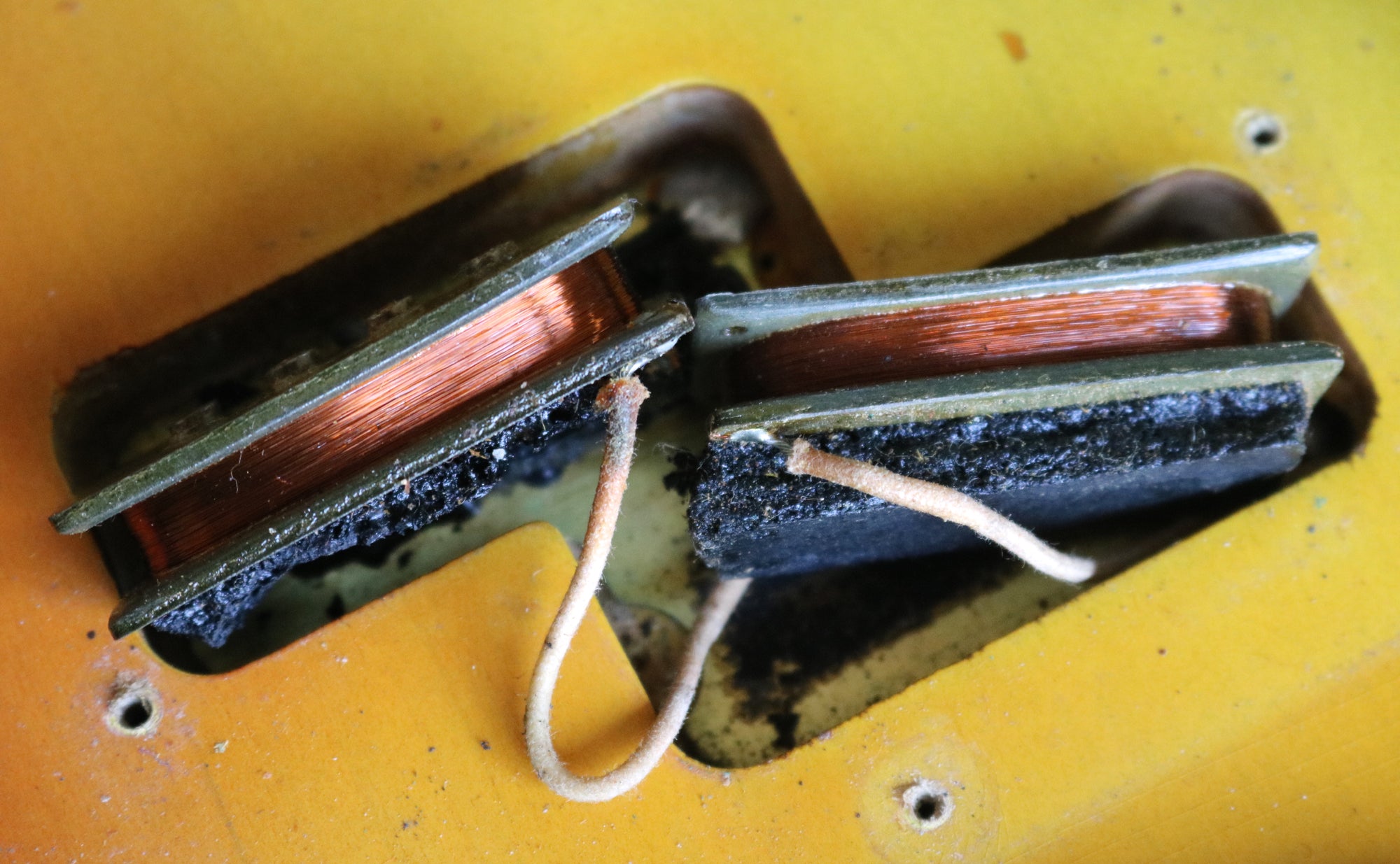 It's been fully set up in our workshop with a fresh set of round-wound strings and has a straight neck and a great action. Serial:121751. The neck stamp reads FEB 66 C. Both pots are dated to 1966, only one shows the week of manufacture as the other is covered in solder. The visible pot date in full is 6607 (7th week of 66) The solder is untouched on the pots and pickups. Only one half of the pickup has a visible date as the other is covered in sponge which has gone hard and I didn't want to disturb it. The visible pickup date appears to read 3-16-66 (March 16th 1966). Nut width: 44mm. Depth at 1st fret: 21.25 mm. Weight: 8lbs 4oz.