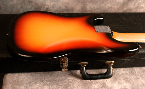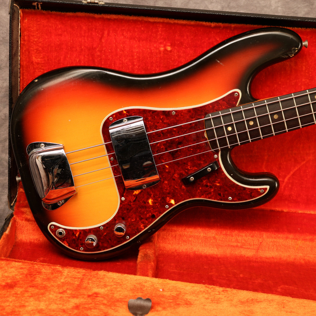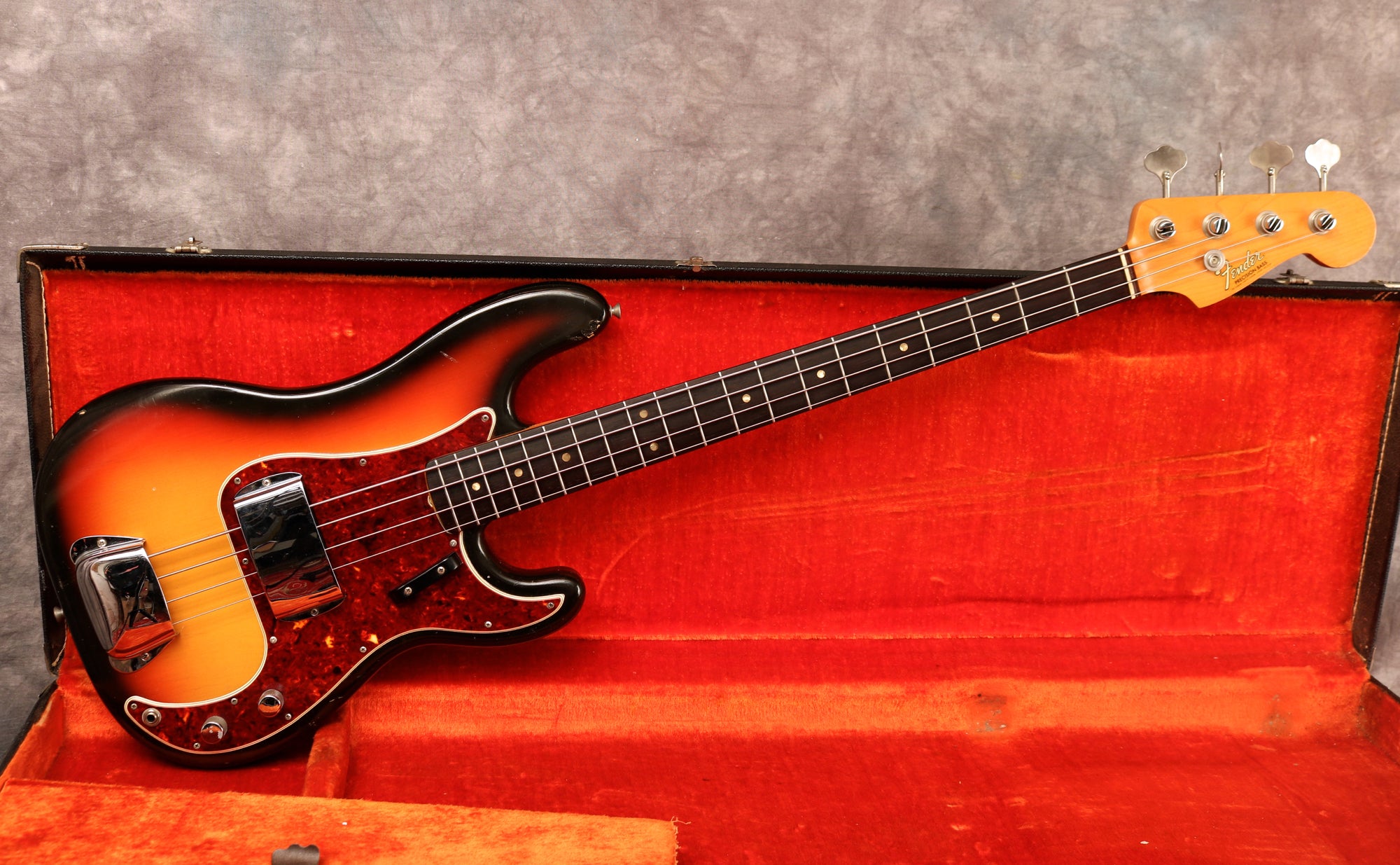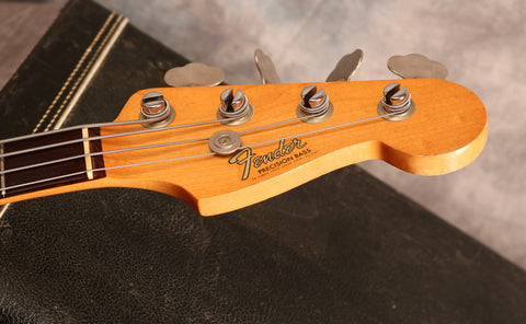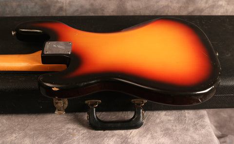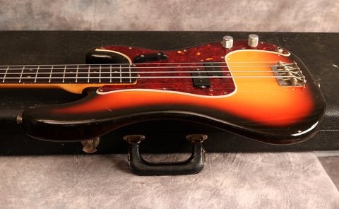 1966 Fender Precision Bass in excellent condition. Sunburst finish, Tortoise guard and a rosewood fingerboard. This is one of the cleanest mid-'60s Precision I have had in stock and an absolute joy to play. It's an amazing player with an incredible neck. The body has a few small patches of wear mainly around the edges and some light lacquer checking but is remarkably clean for a bass of this age and the Sunburst is still very vibrant. The finish on the back of the neck has worn from frets 3-7 but is overall very clean as is the headstock. There's very little wear to the frets, the hardware is all clean and the truss rod is fully functioning with no issues. Overall this bass is in fantastic condition.