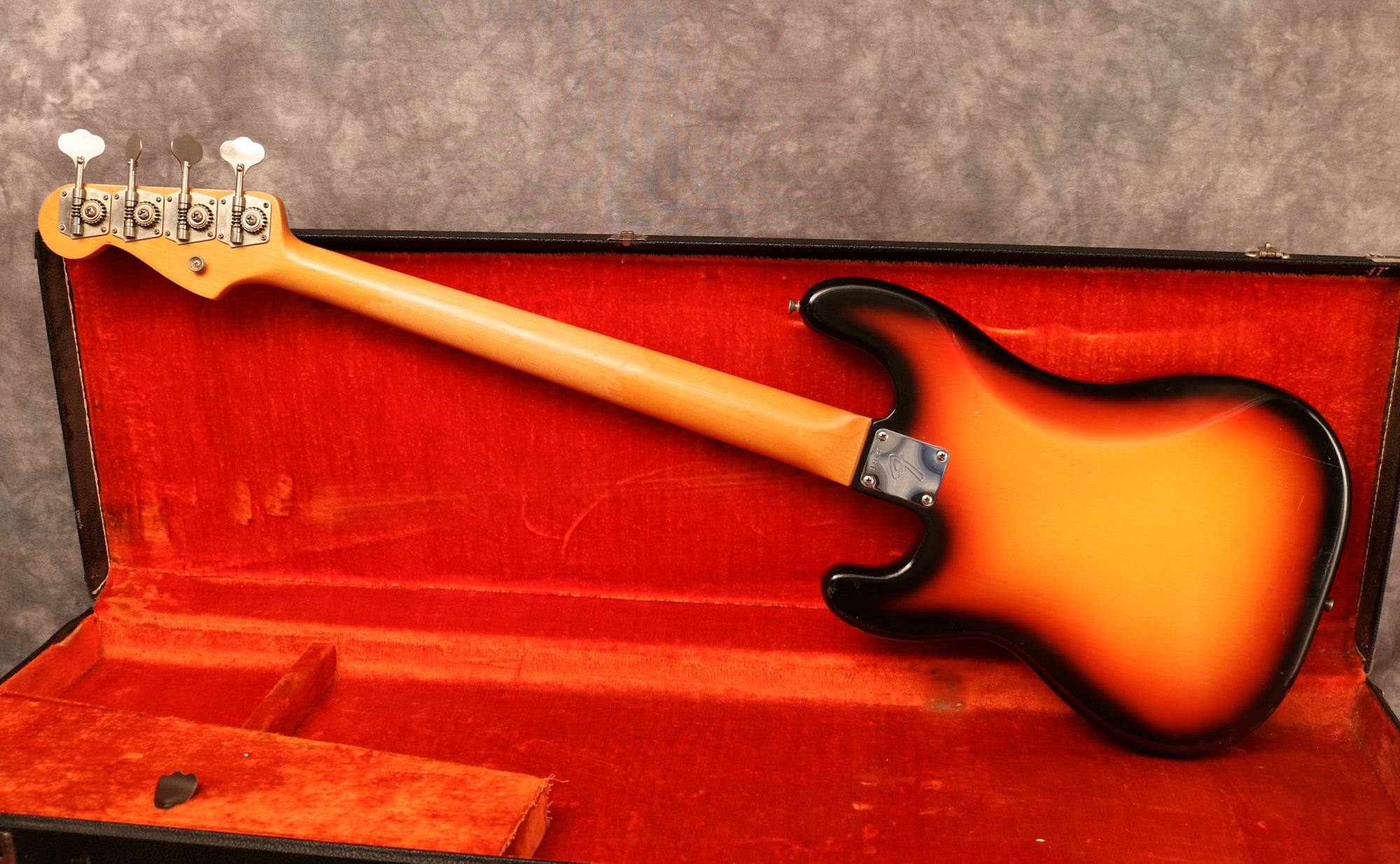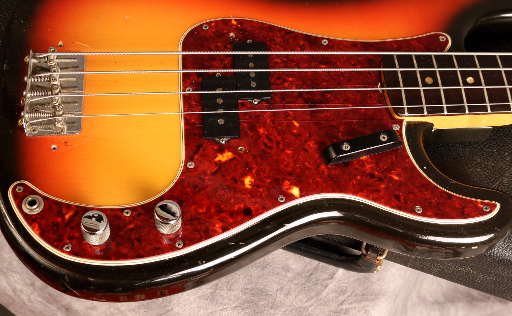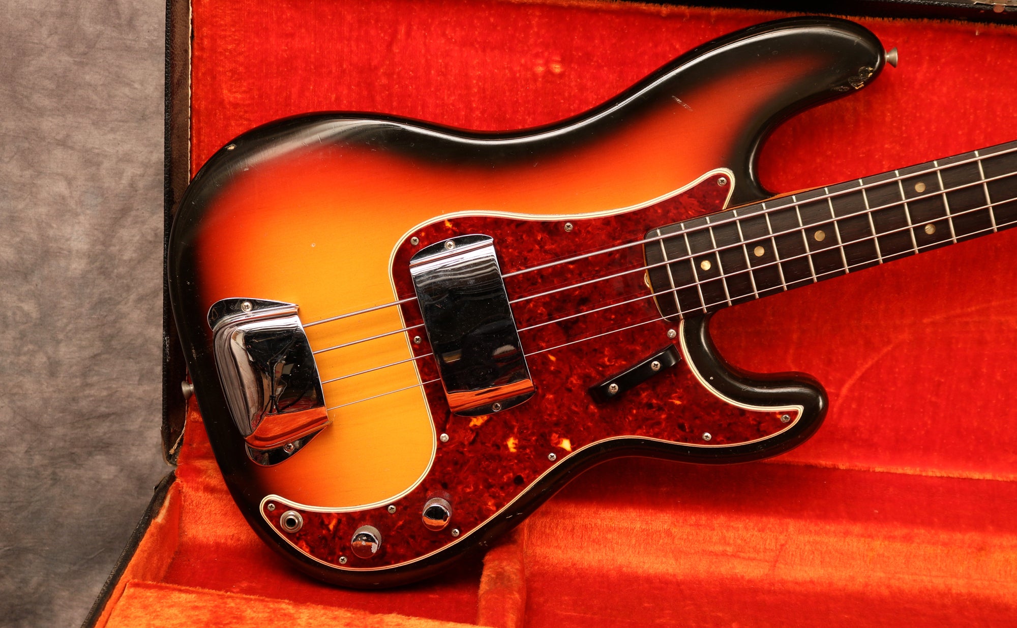 1966 Fender Precision Bass in excellent condition. Sunburst finish, Tortoise guard and a rosewood fingerboard. This is one of the cleanest mid-'60s Precision I have had in stock and an absolute joy to play. It's an amazing player with an incredible neck. The body has a few small patches of wear mainly around the edges and some light lacquer checking but is remarkably clean for a bass of this age and the Sunburst is still very vibrant. The finish on the back of the neck has worn from frets 3-7 but is overall very clean as is the headstock. There's very little wear to the frets, the hardware is all clean and the truss rod is fully functioning with no issues. Overall this bass is in fantastic condition.