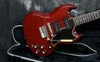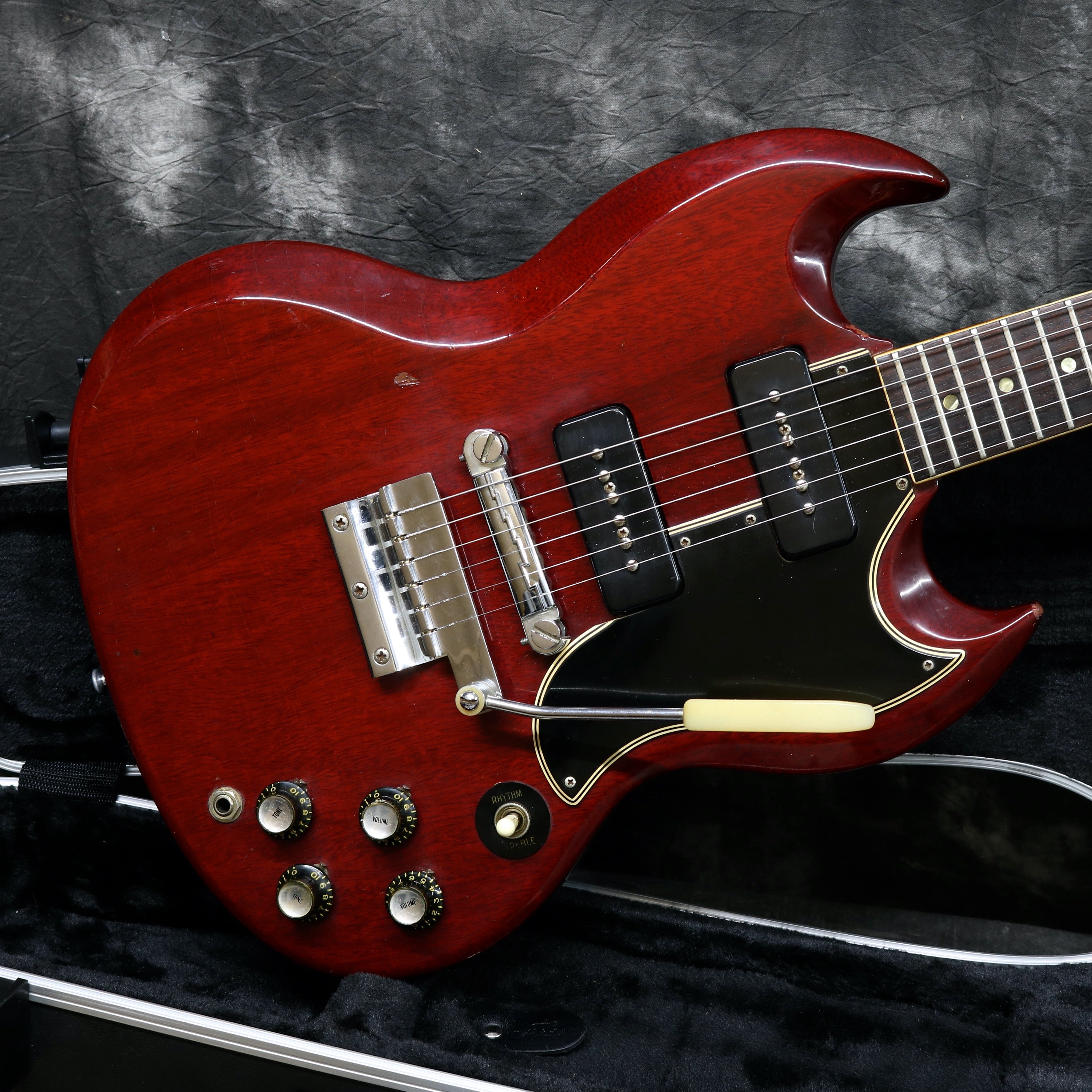 1966 Gibson SG Special, Cherry finish with Vibrola. All original guitar in good  condition. It comes supplied in a new SKG hard case. These specials have hot, P-90 pickups, on a lightweight mahogany body. This Guitar has numerous but small scuffs and dings in the finish, mainly around the edges of the body and headstock. The back of the neck is relatively clean with only a couple of small dings. The frets have been dressed but still have plenty of life left in them. Fully set up in our workshop with a fresh set of strings. Serial number: 550579. Weight: 7 lbs. Nut width: 40mm. Depth at the 1st fret: 20.8 mm. Depth at 12th 24.5 mm.