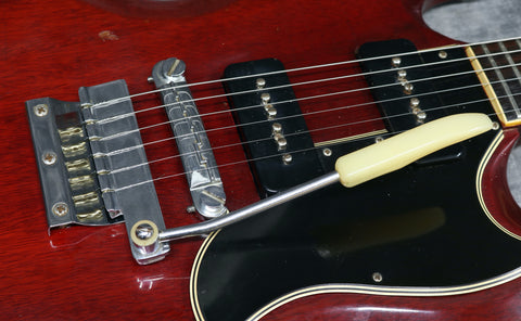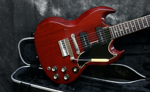 The Gibson SG Special was introduced in 1961 as a "mid-level" guitar. This set-neck mahogany guitar was a step up from the SG Junior with a pair of P-90 pickups, three-way switching, individual volume and tone controls, and a bound neck with dot inlays. 1966 saw a slight redesign of the SG Special, introducing a larger pickguard that went across the pickups and mid-way through the upper bout. 1966 also saw this model get the Vibrola tailpiece as standard, though stoptail models trickled out until early 1967.