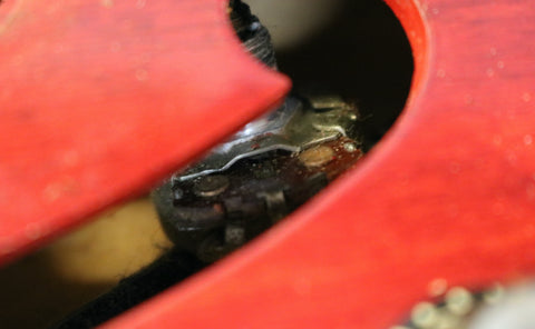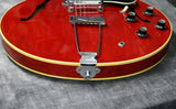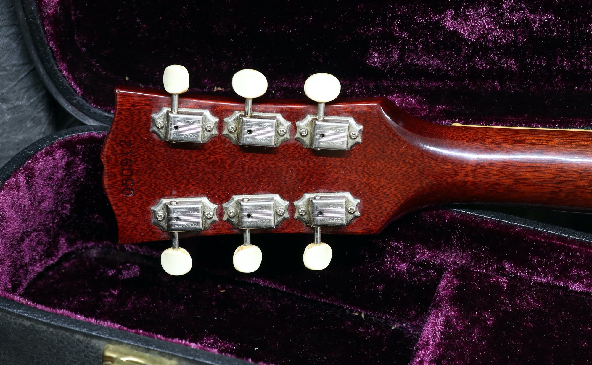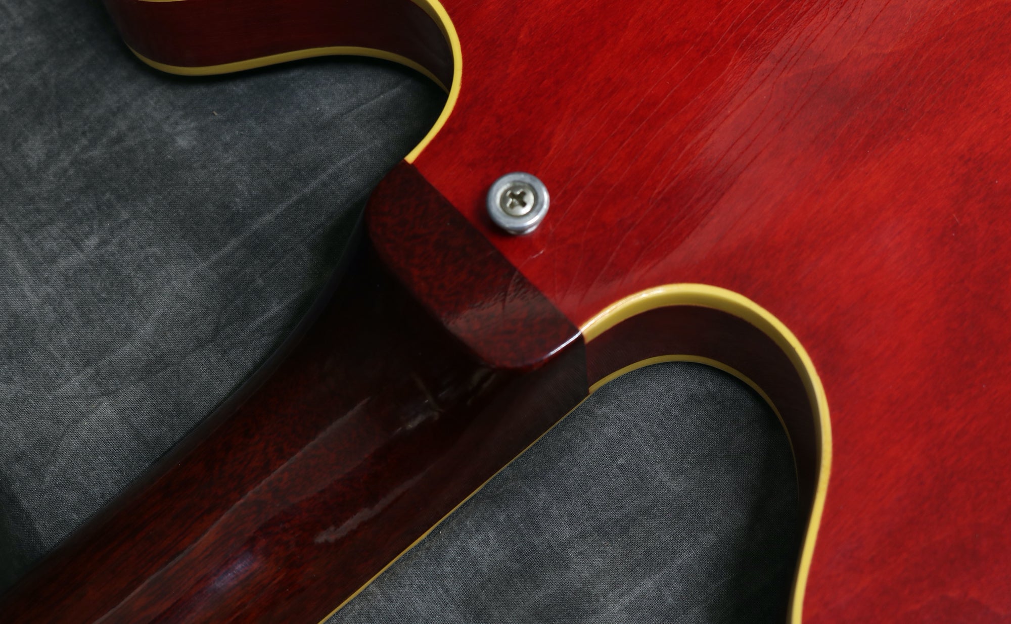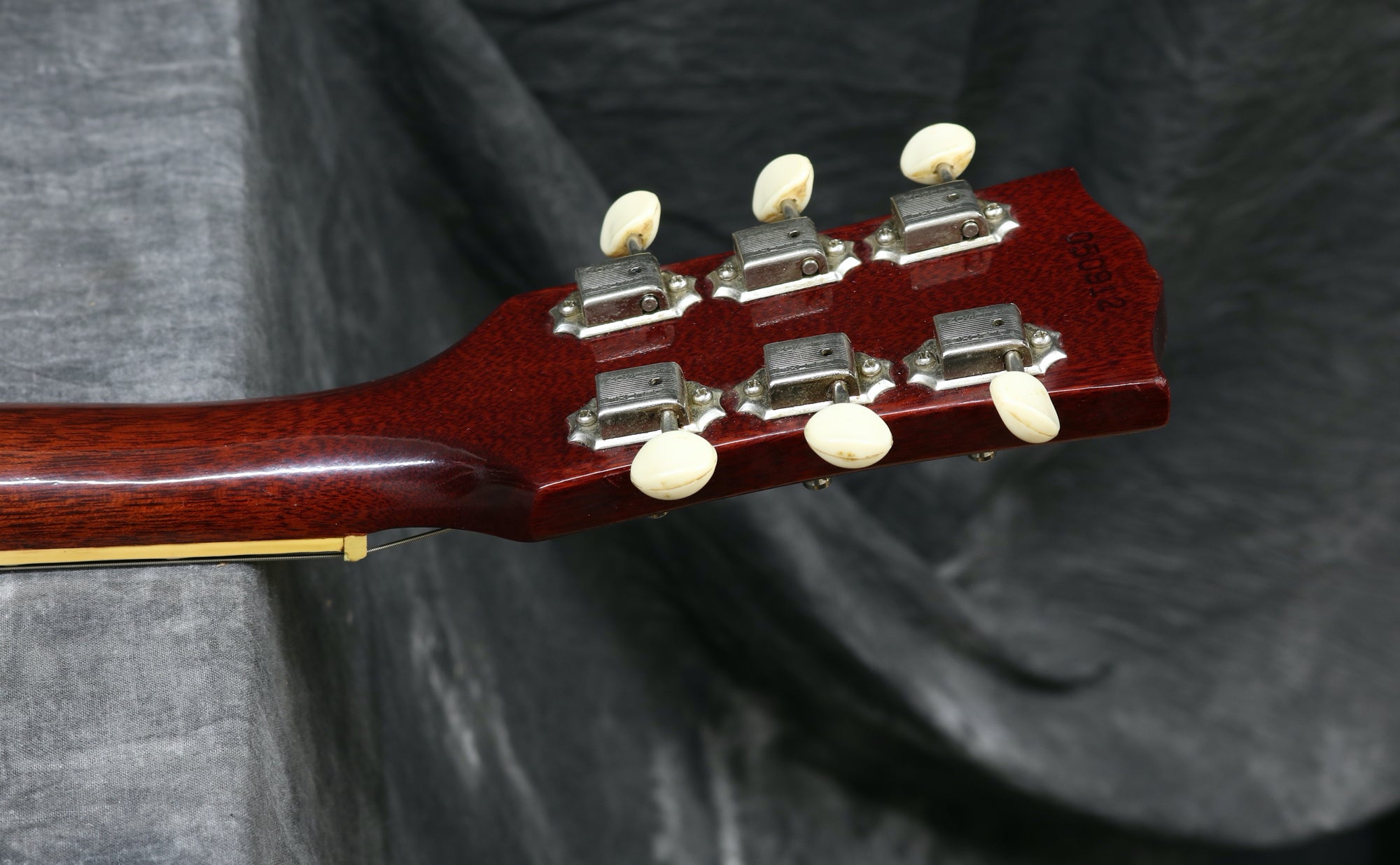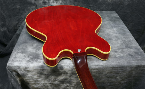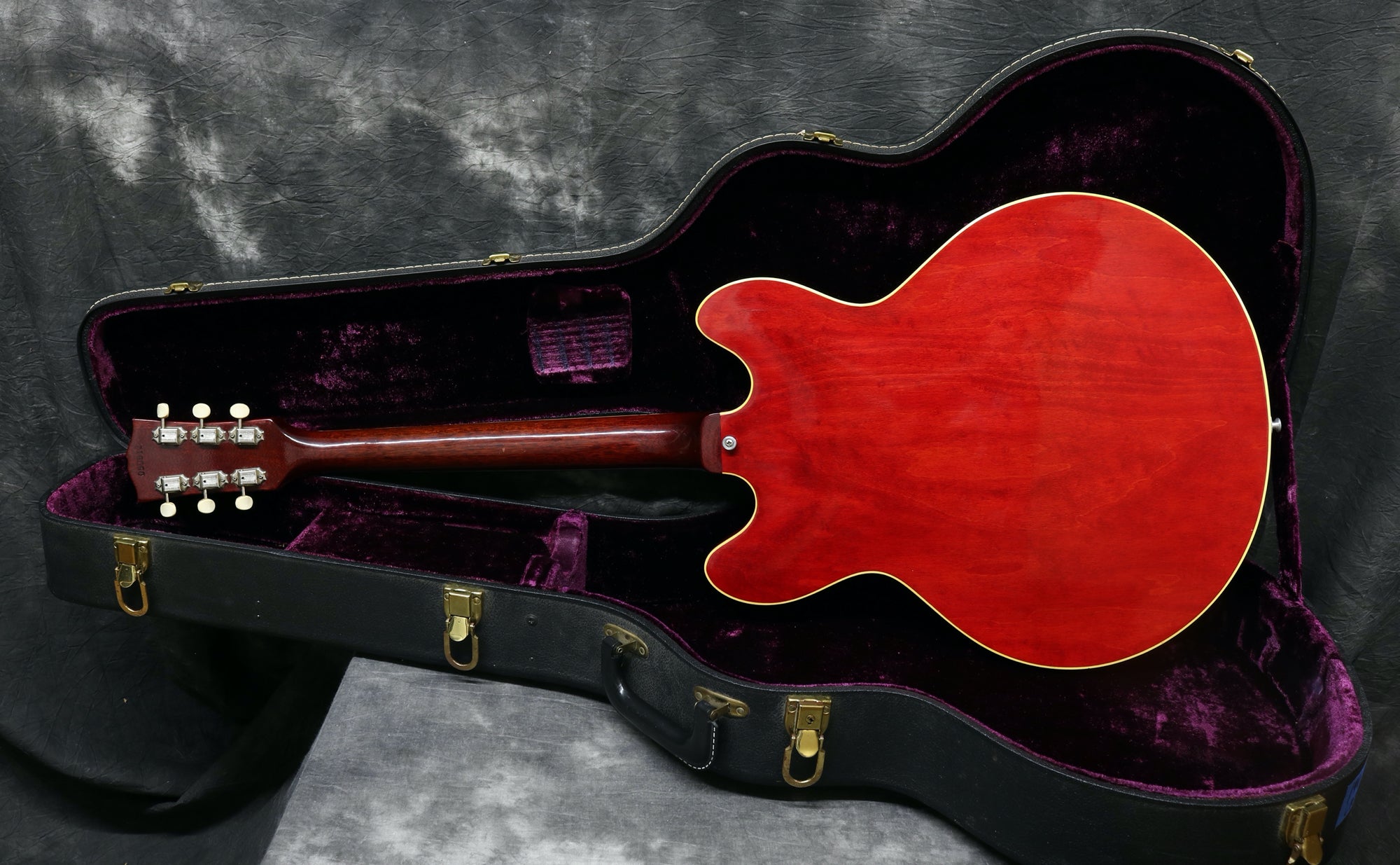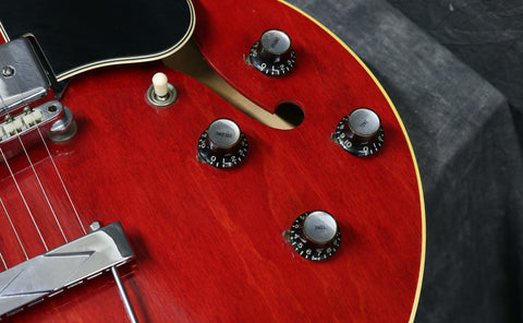 The ES-330 shares the body shape of the ES-335, ES-345 and ES-355 and is a lightweight, lively sounding guitar when played acoustically or plugged in. It's fitted with powerful P-90 single coil pick-ups which are nicely balanced. This example has very little wear at all, with only a few tiny dings and scuffs. The frets are in excellent condition having been cleaned and dressed in the workshop. There is a slight dip in the top between the neck and bridge pickups which has been compensated for by a rosewood shim under the bridge pickup. This is reflected in the price.