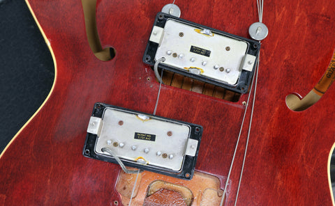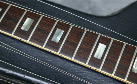 The body features a beautiful rich cherry red finish stain and the cream binding is in very good shape front and back. You have to look very closely to find any imperfections at all on this guitar. Upon close inspection there are some extremely small marks along the top edge of the headstock and extremely light play wear to the body finish along with some faint lacquer checking. There are no breaks/cracks or repairs and everything remains structurally sound. The frets are in excellent condition having been cleaned and dressed in our workshop. All hardware & electronics are in excellent working order and the metalwork is still shiny. The binding is all intact.