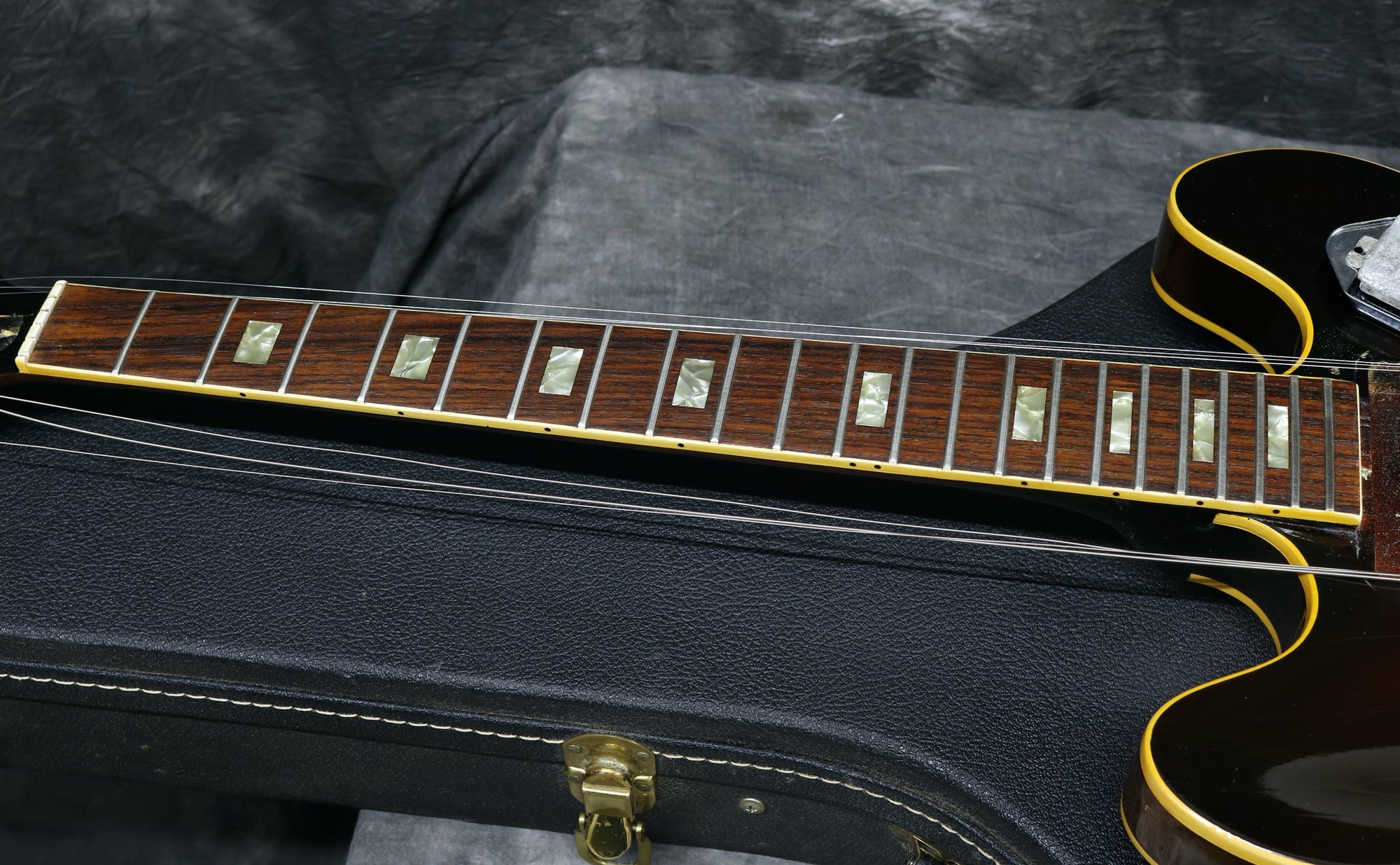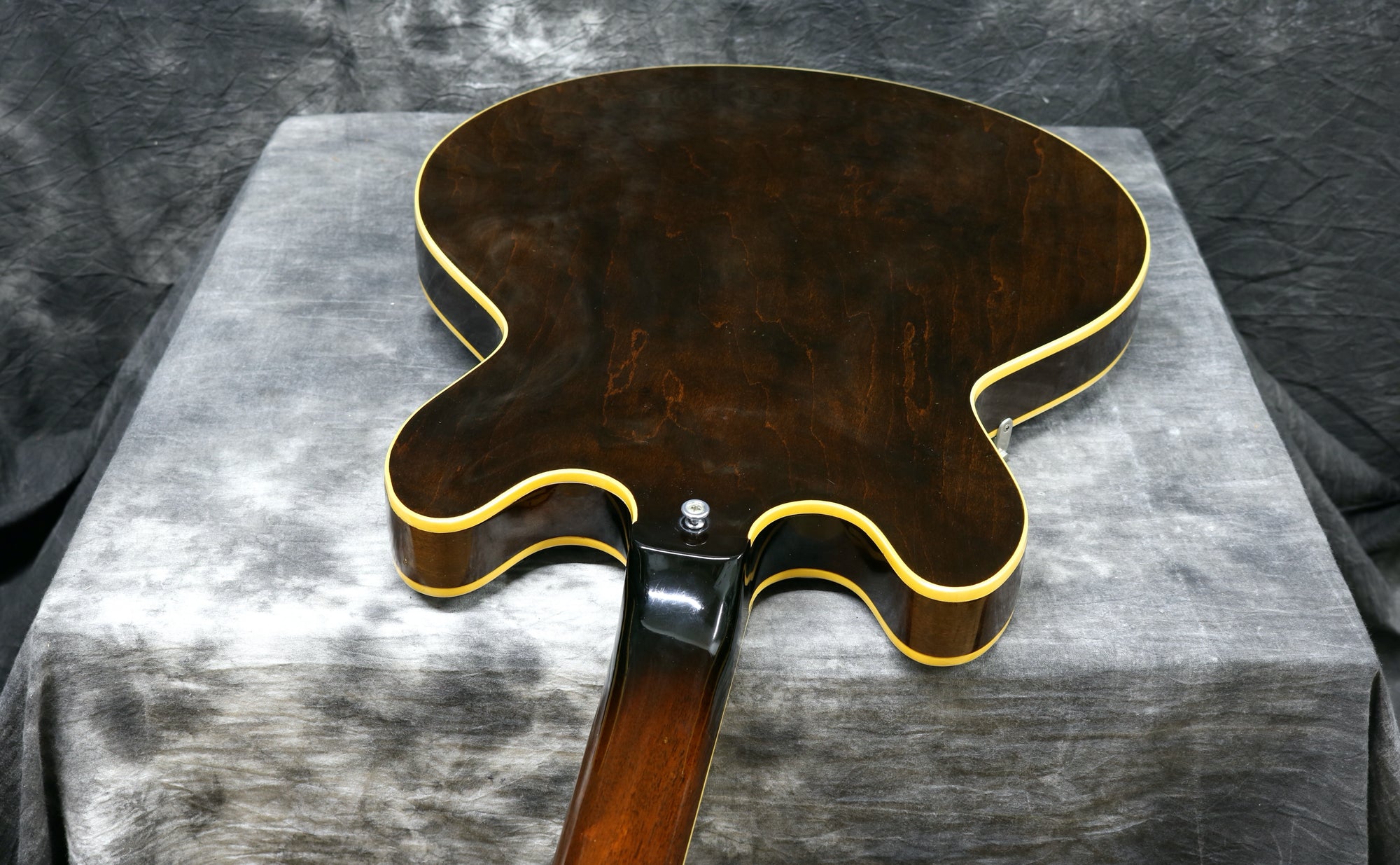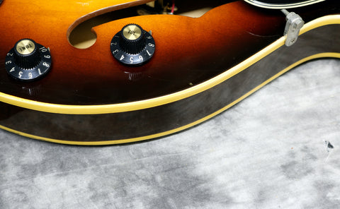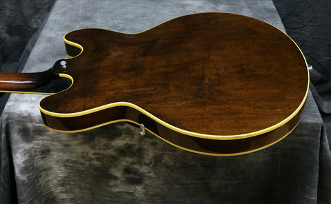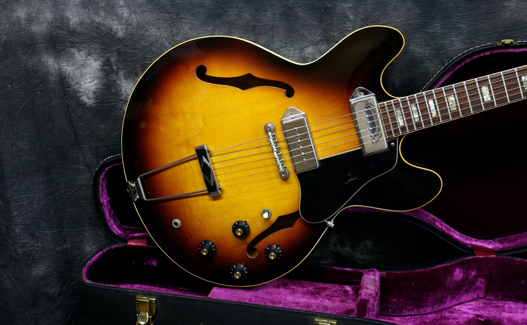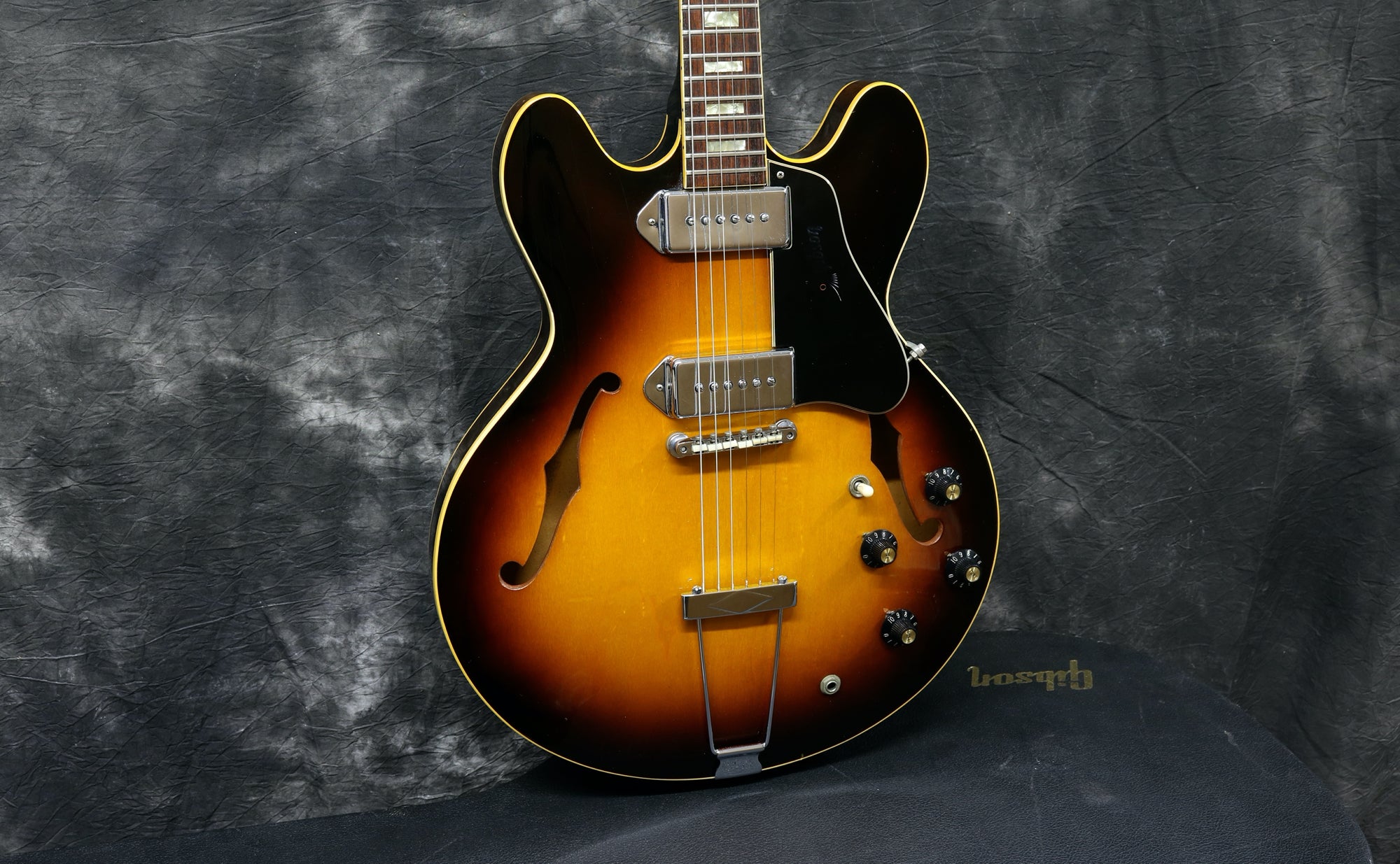The ES-330 shares the body shape of the ES-335, ES-345 and ES-355 and is a lightweight, lively sounding guitar when played acoustically or plugged in. It's fitted with powerful P-90 single coil pick-ups which are nicely balanced. This example has a few small dings and scuffs on the back of the neck and headstock but nothing major and everything remains structurally sound with no breaks/repairs. The body finish is in great shape with only a few tiny dings and some light lacquer checking. The frets are in excellent condition having been cleaned and dressed in the workshop.