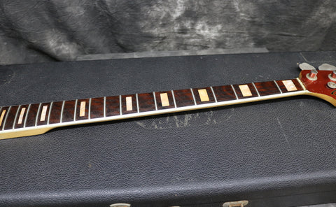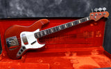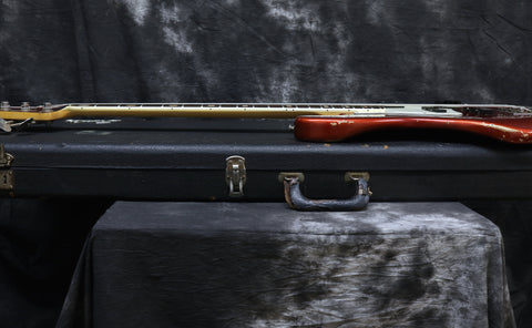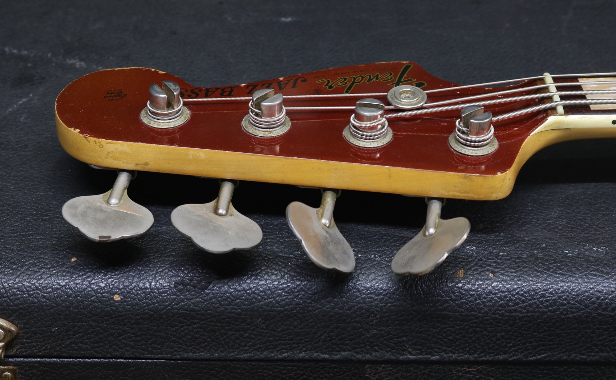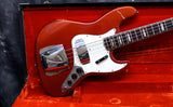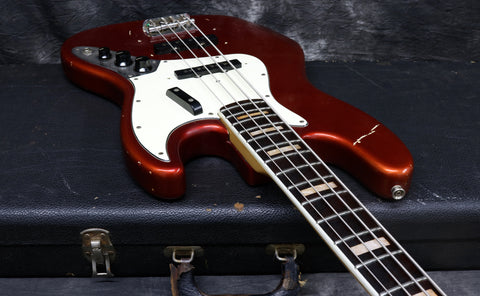 1969 Fender Jazz Bass, Candy Apple Red finish, matching headstock in very good condition and supplied in the original case. The serial number is 258867. It has a white 3-ply guard, a very clean maple neck and a dark Rosewood fingerboard with pearl blocks & white binding. It's been re-fretted but otherwise original pickguard, hardware, pickups, pots and finish. This bass is a great player with a superb tone. There are a few Scuffs and scrapes to the finish, mainly around the edge of the body and headstock The frets are in great shape. All electronics and hardware are in good working order.