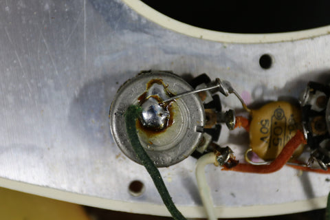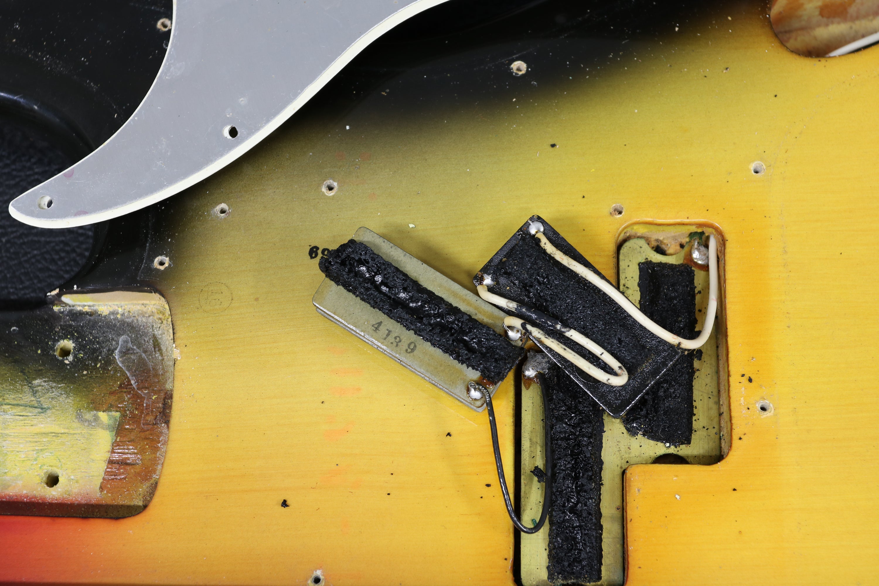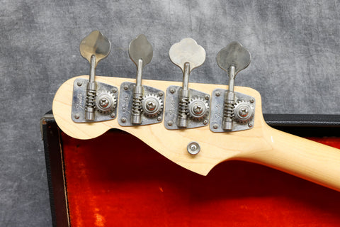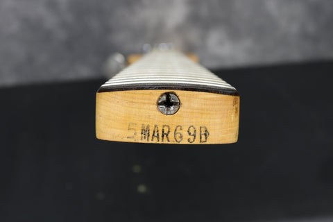 It's been fully set up in our workshop with the strings it came in with, which I believe, are D'Addario 45-105. The truss works correctly and it has a straight neck and a great action. Serial:226374. The neck stamp reads Mar 69 B. Even though the bass was made in 1969 the pots date to the 31st week of 1966 which is common during this period. Also common for the period was the using up of black bobbins for the pickups. One half of the pickup has black bobbins and the other has the light gray/green bobbins and is date stamped to '69. Nut width: 41.4mm. Depth at 1st fret: 21 mm. Weight: 8lbs 8oz.
