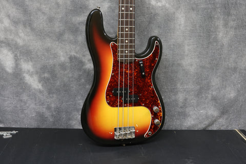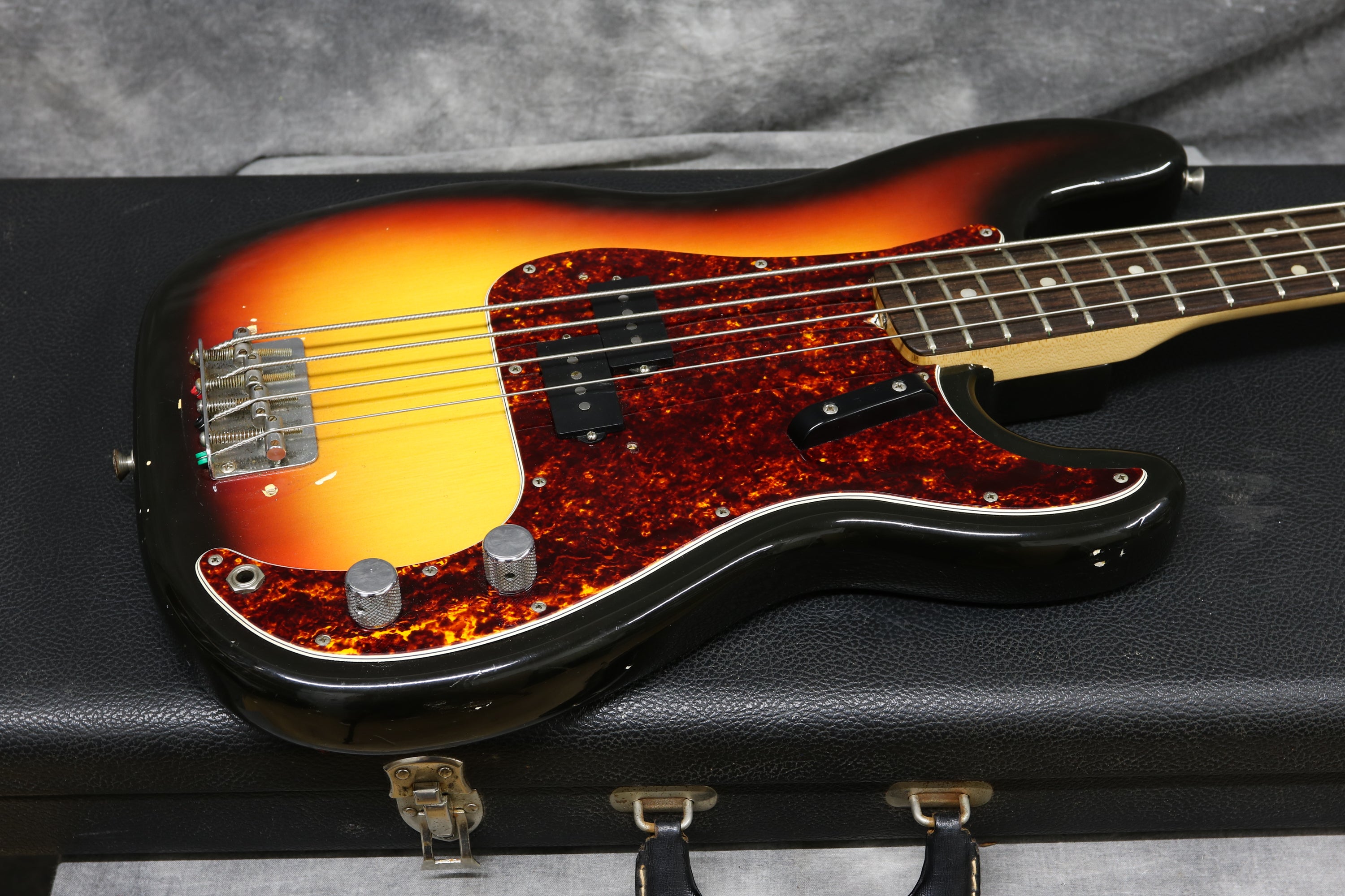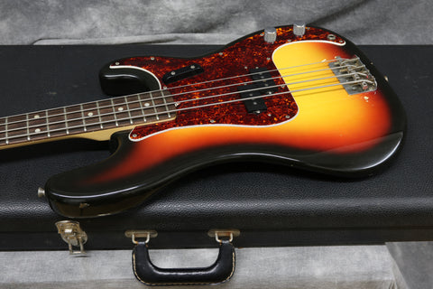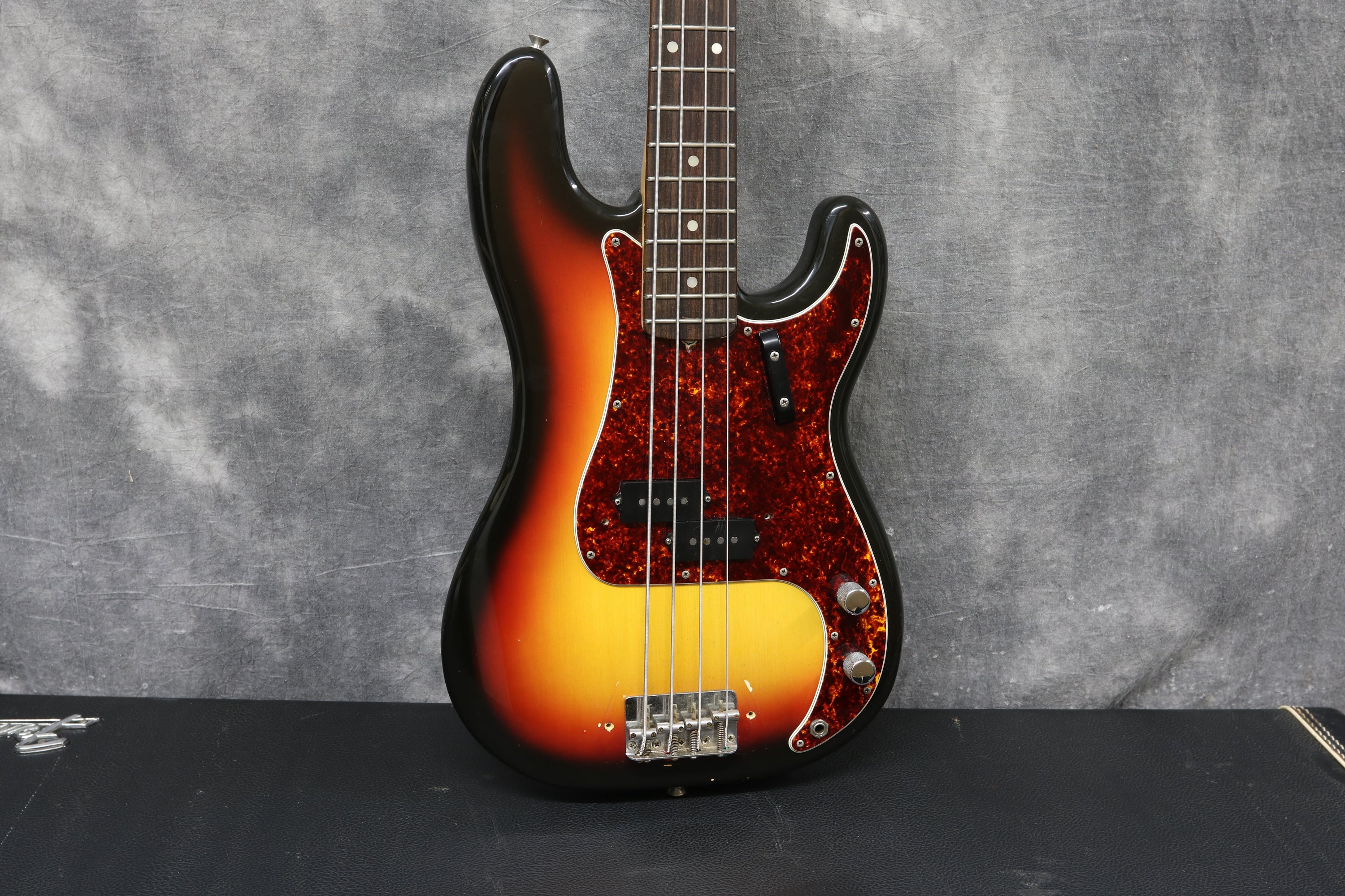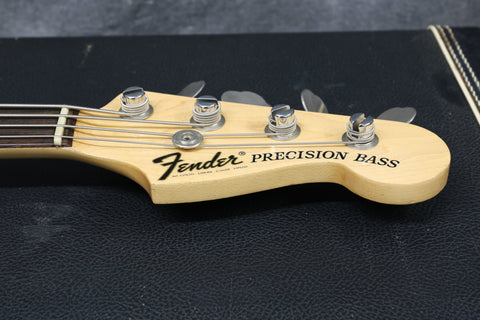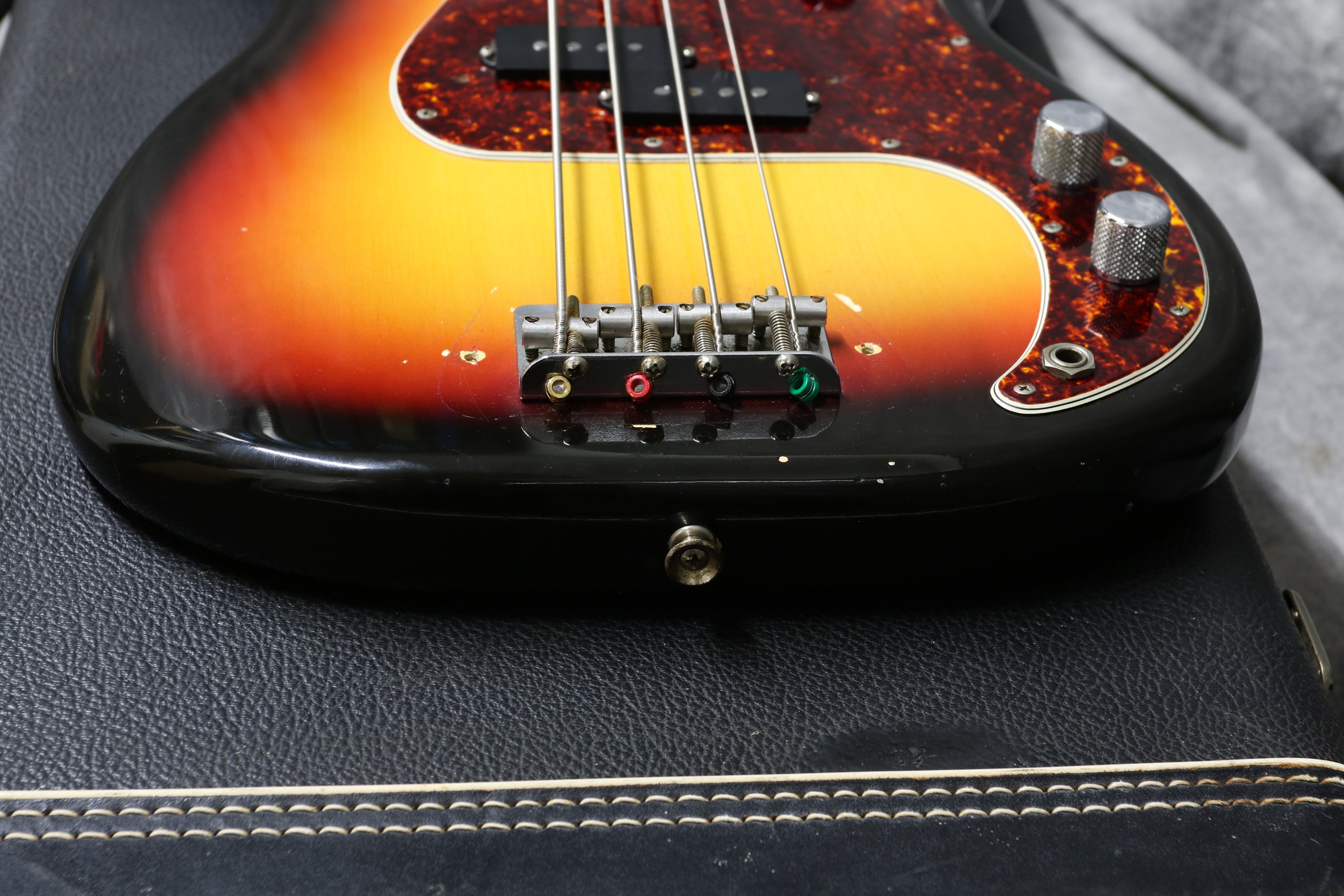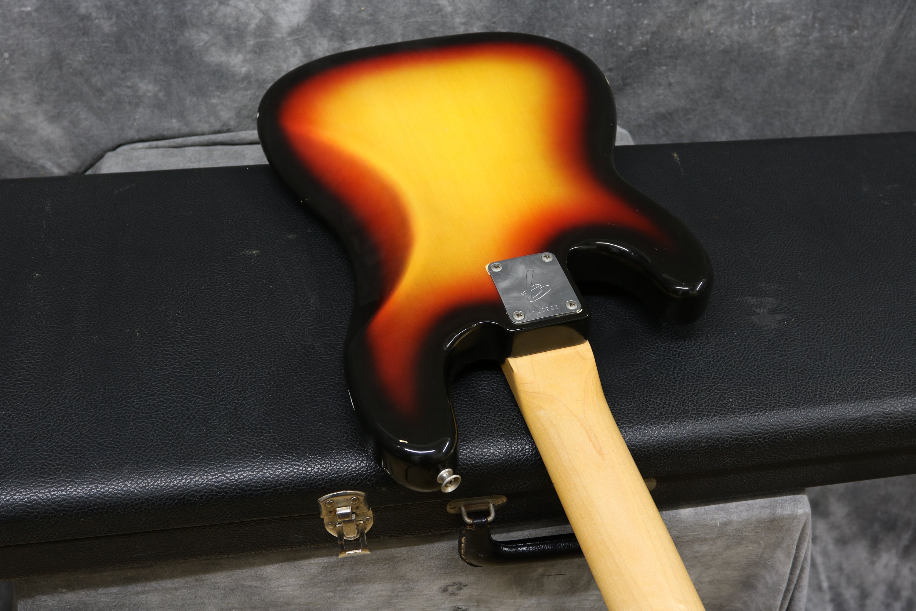 1969 Fender Precision Bass in excellent condition with a sunburst finish, tortoise-shell guard and a rosewood fingerboard. It's a superb bass to play with fantastic tone and nice and light weighing in at 8 lbs 6 oz. The nut has been changed and I suspect a refret although it's difficult to tell as theres no disturbance to the board. If it has been, its excellent work. It's missing the metal pickup and bridge covers. Otherwise original, including the case.