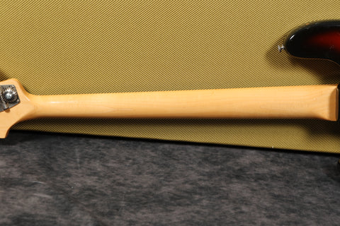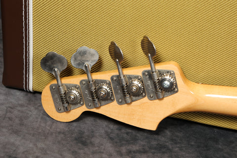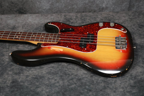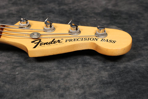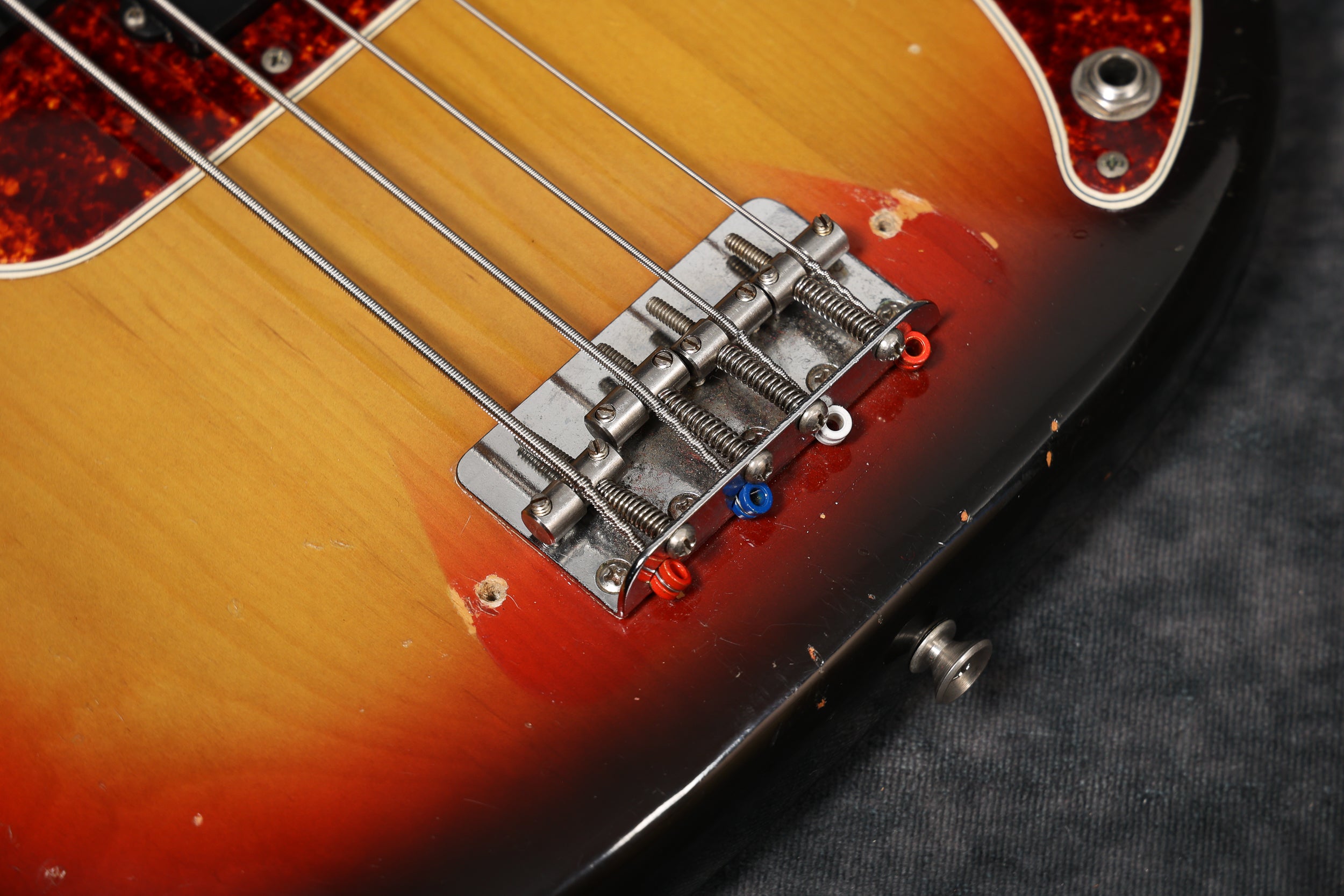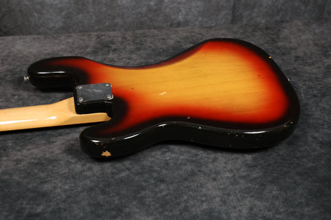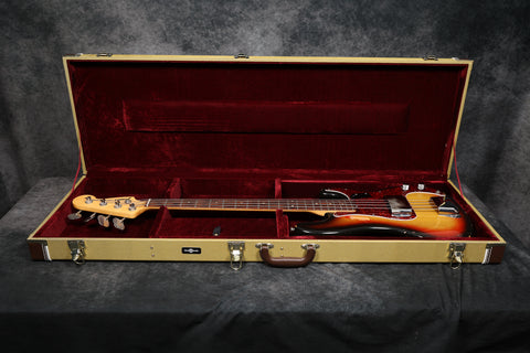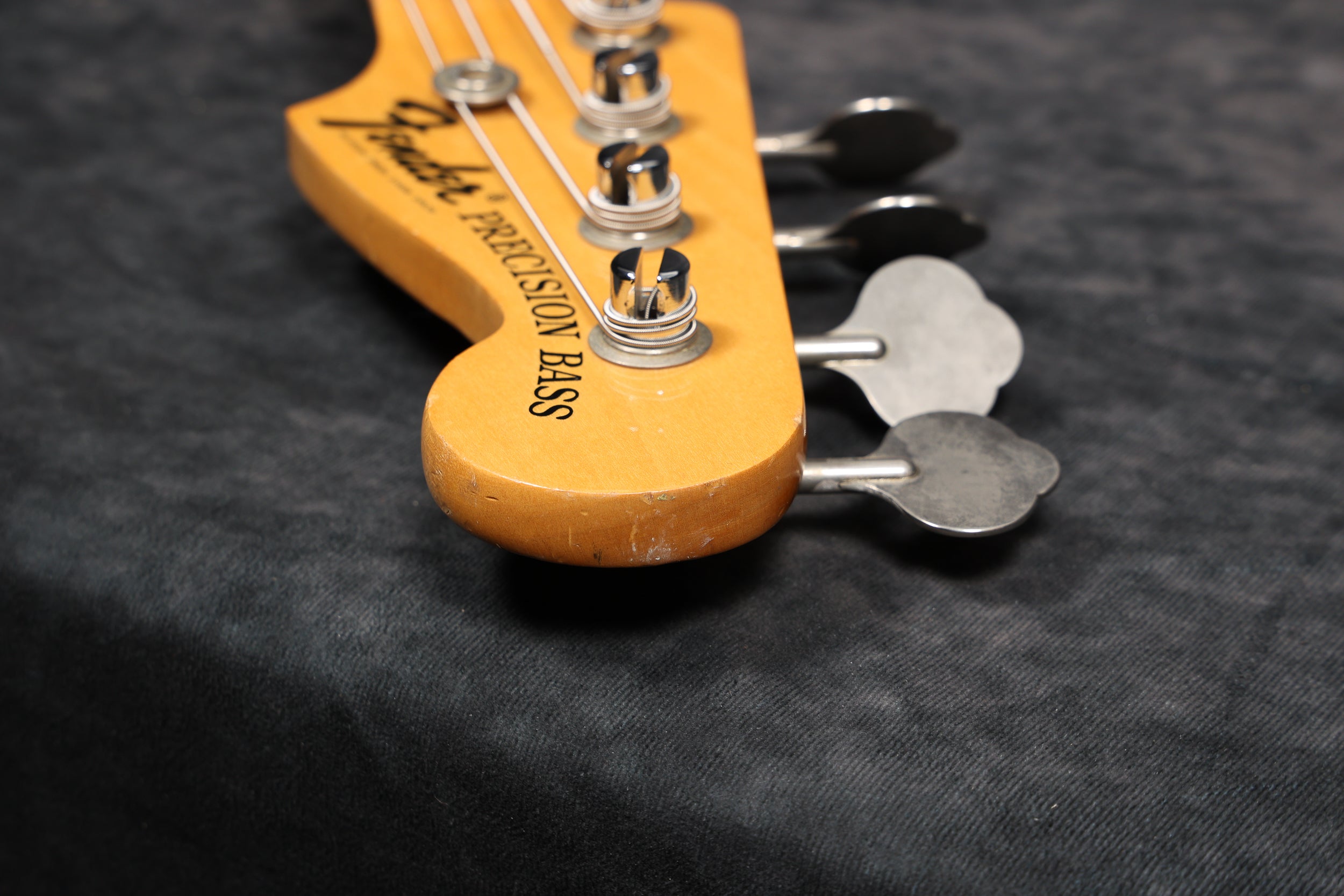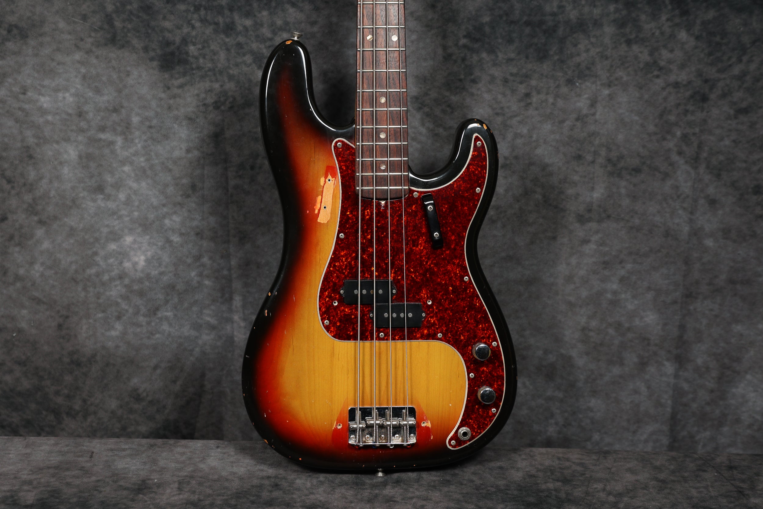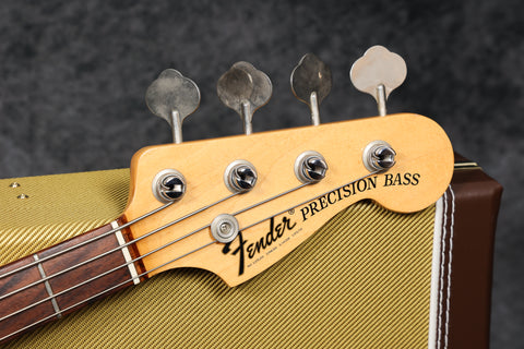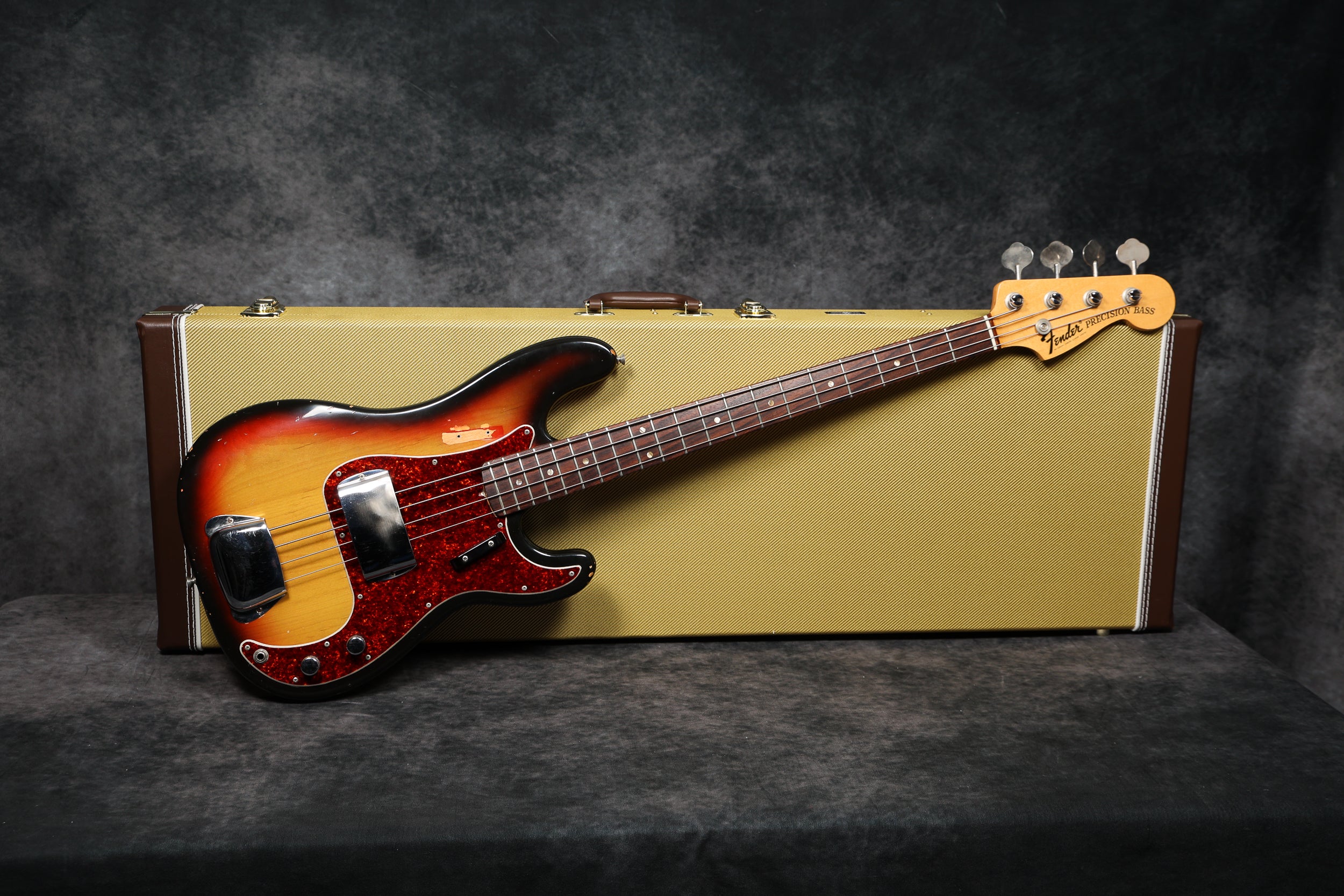 1969 Fender Precision Bass in very good condition with a sunburst finish, tortoise-shell guard and a rosewood fingerboard. It's a superb bass to play with a fantastic tone and a good weight. (8 lbs 9 oz) There are a couple of added wires in the control harness and the thumb rest was previously moved just above the pickguard. (which has left an imprint and 2 holes) Otherwise original. Supplied in a new tweed hard case.
