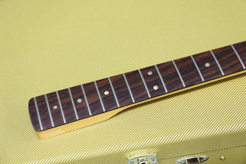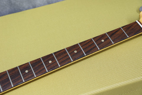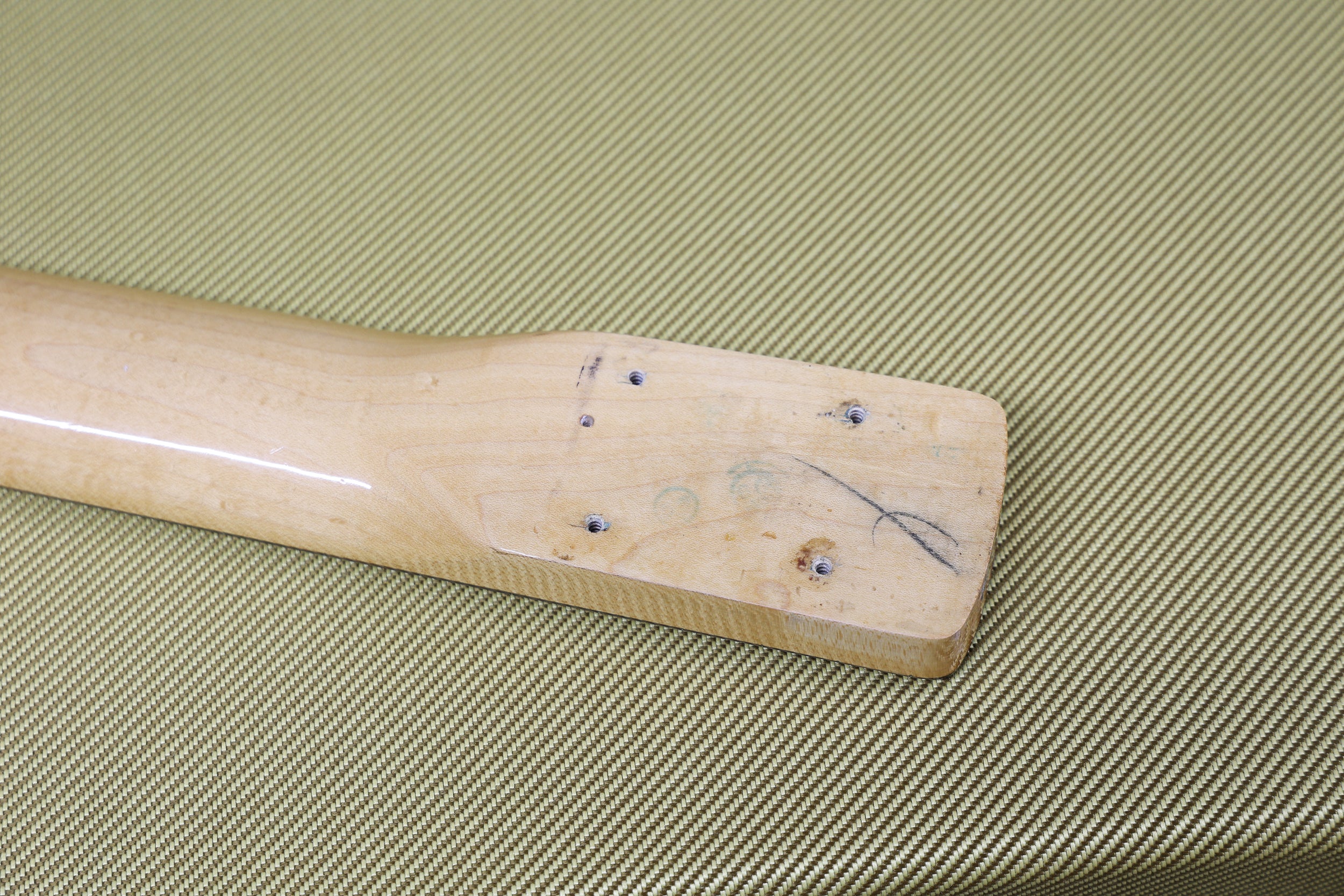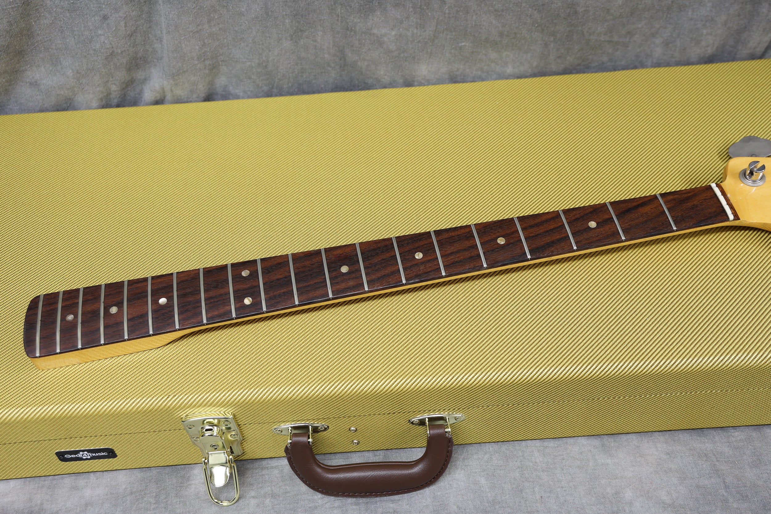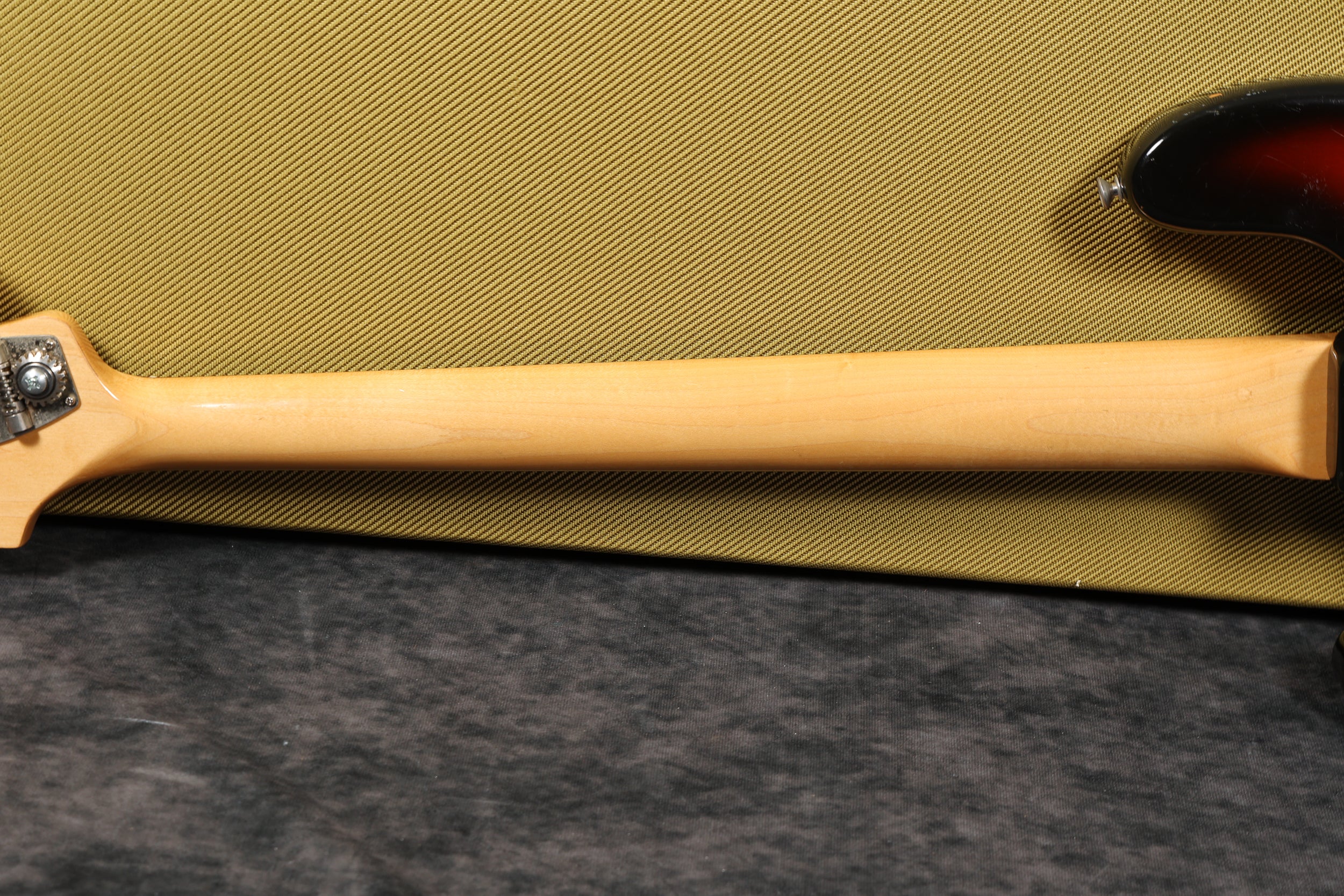 The body finish has a few scuffs and dings, mainly around the edges, as well as a small patch of buckle rash on the back, but overall it's pretty clean. The finish on the back of the neck is relatively free from wear. The headstock has only light wear with just a couple of small scuffs around the top edge. The frets are in excellent condition and have plenty of life left in them.