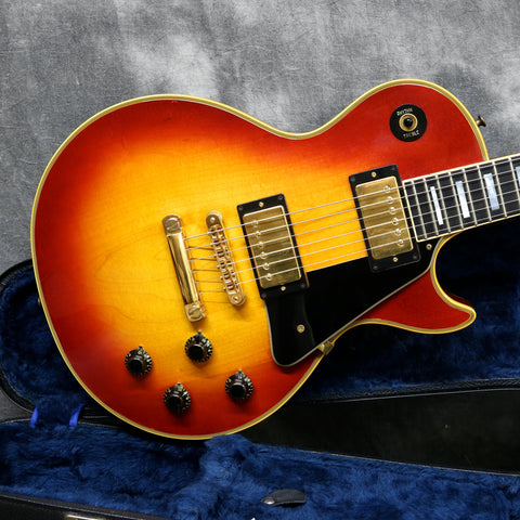 1972 Gibson Les Paul Custom in excellent + condition with a cherry sunburst finish. 3-piece mahogany neck, with ebony fingerboard "Pancake" Mahogany body with maple top. The tuners (Kluson), bridge, tailpiece and pickup covers are all changed for correct replacement parts, the control knobs have also been changed. In addition its been professionally re-fretted at some point. Supplied in a later Gibson blue lined case. It plays very well with a straight neck / low action and the truss rod works correctly. Original patent sticker pickups have that classic vintage Les Paul Custom tone. Tons of sustain....go and have a bite and you will still be hearing it!