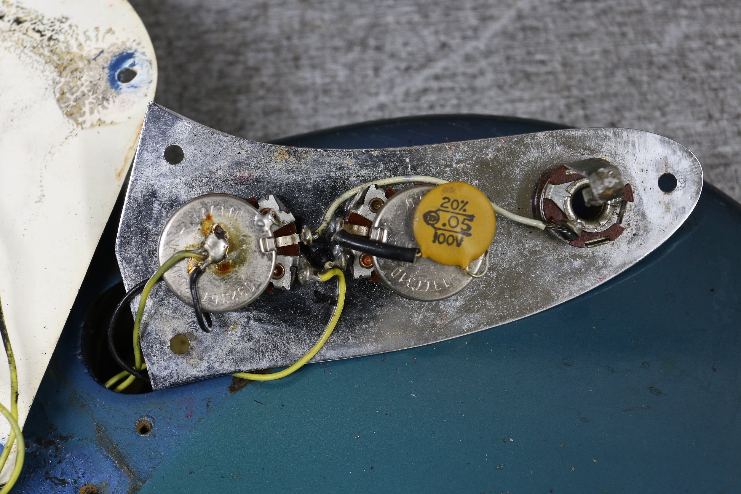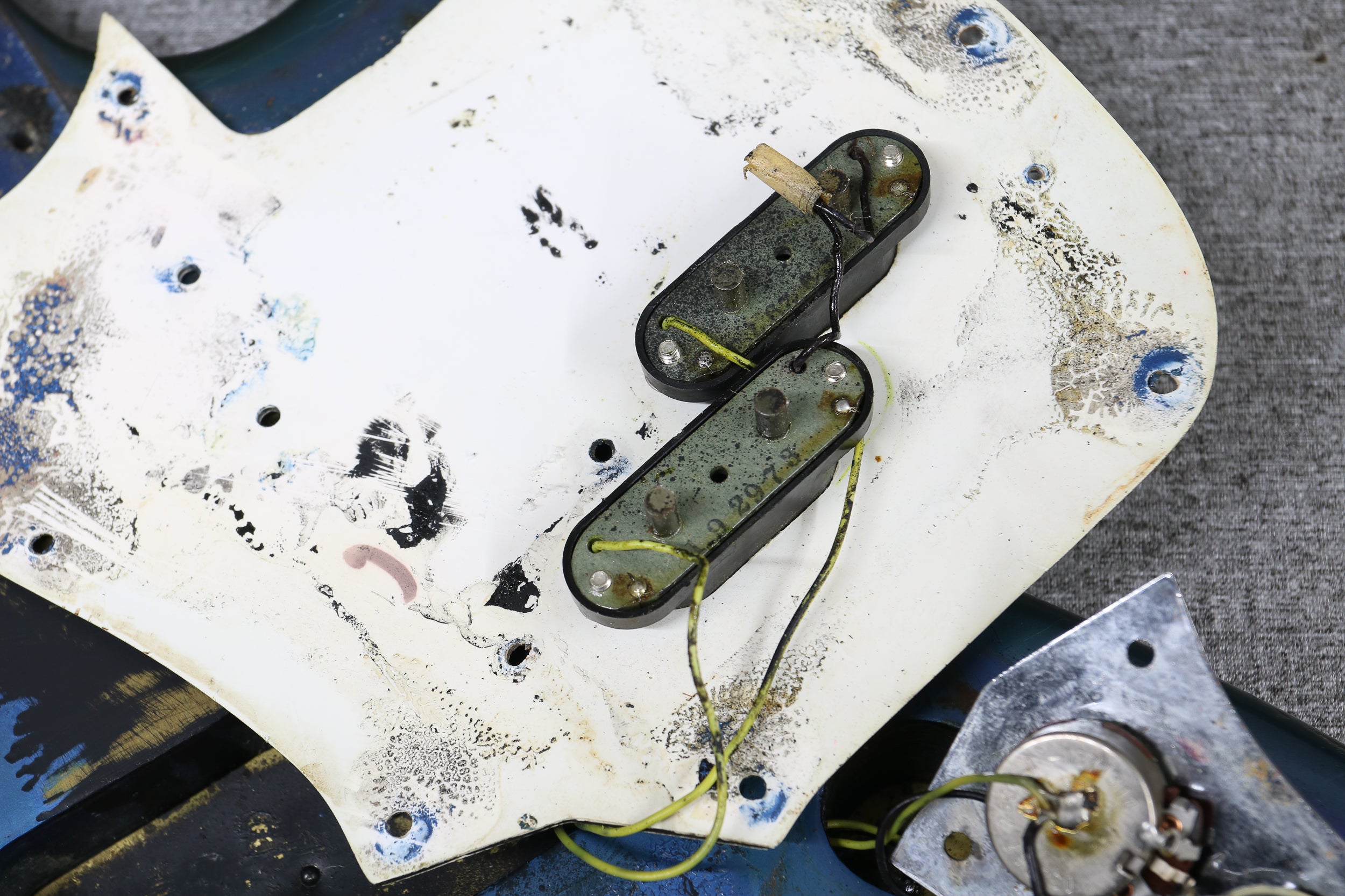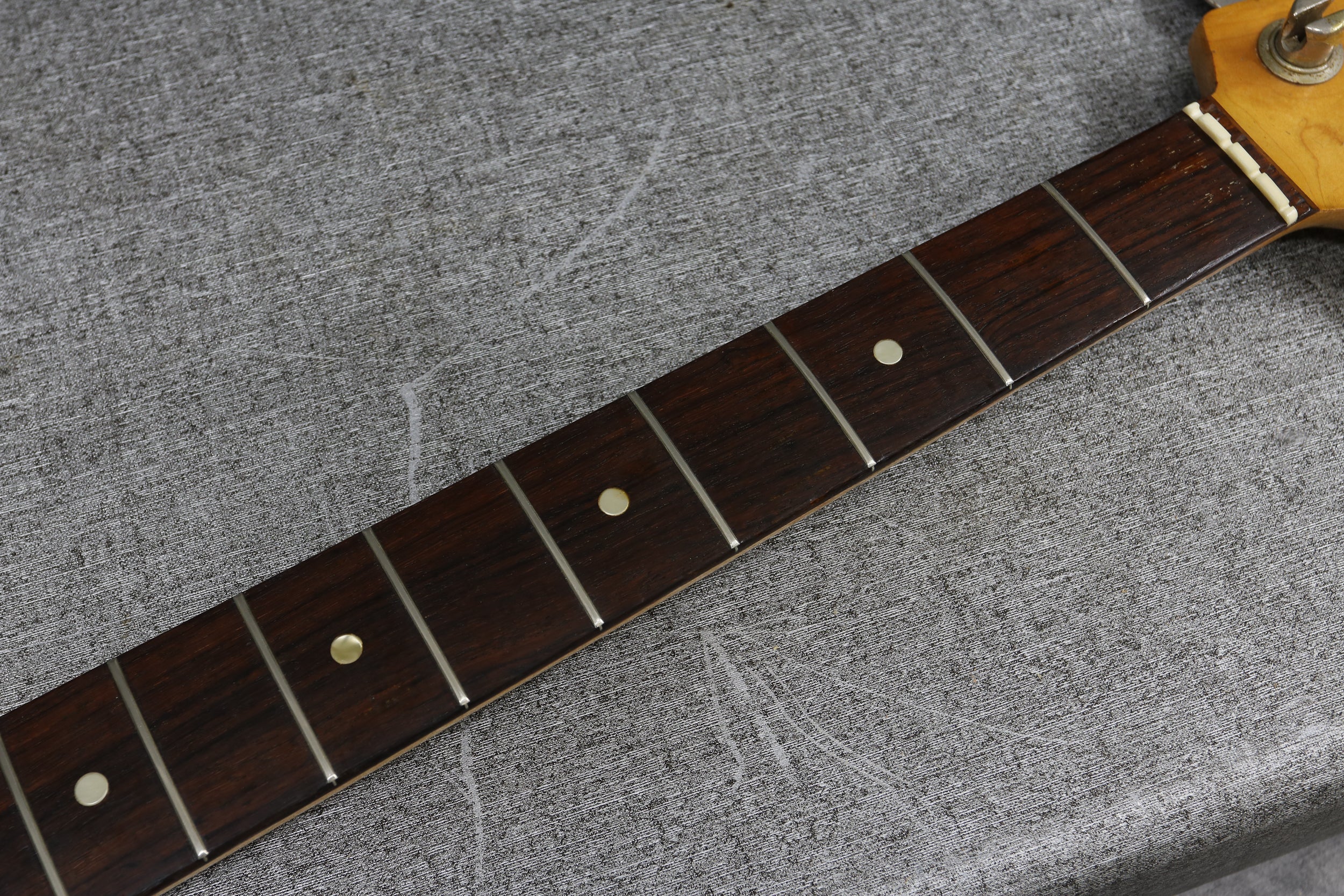 It has a great playing straight neck and the frets are in very good condition. The body, neck and headstock have numerous small scuffs and dings but everything remains structurally sound with no breaks or repairs. The truss rod works correctly without issue. All electronics work and sound great. Under the guard there is a patch of finish removed and what looks like black shielding paint in and around the pickup cavity.