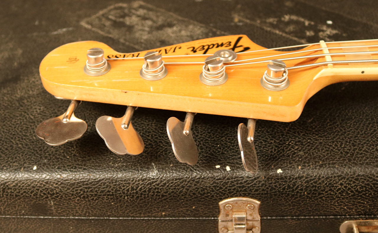 1974 Fender Jazz Bass with a see through Blonde finish over an Ash body. It's in very good condition and has a Maple fingerboard with pearl block inlays and Black binding. With the exception of a rewound back pickup its all original including the case and metal covers.