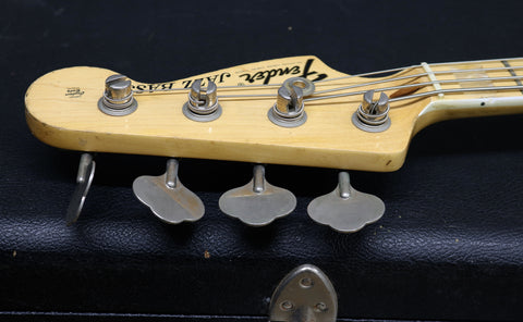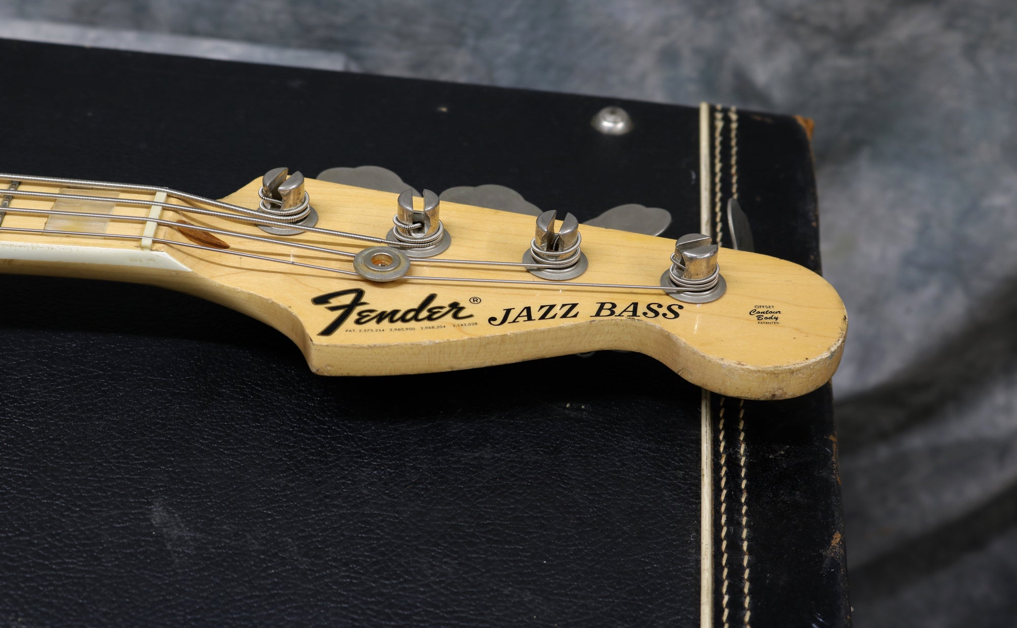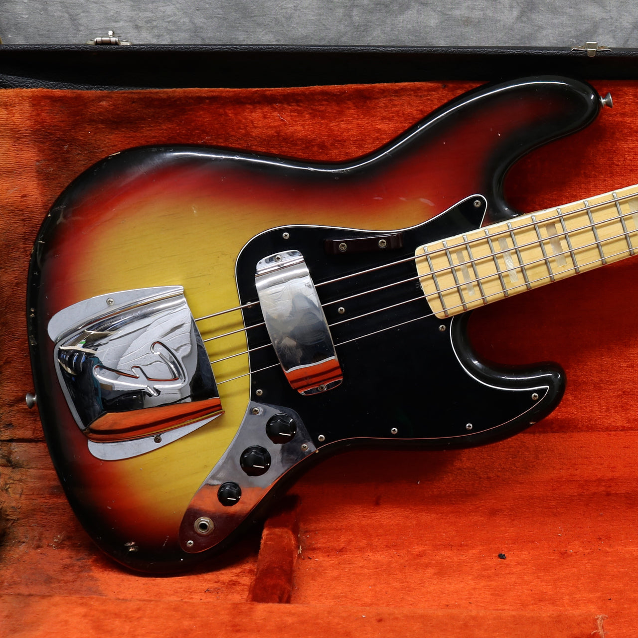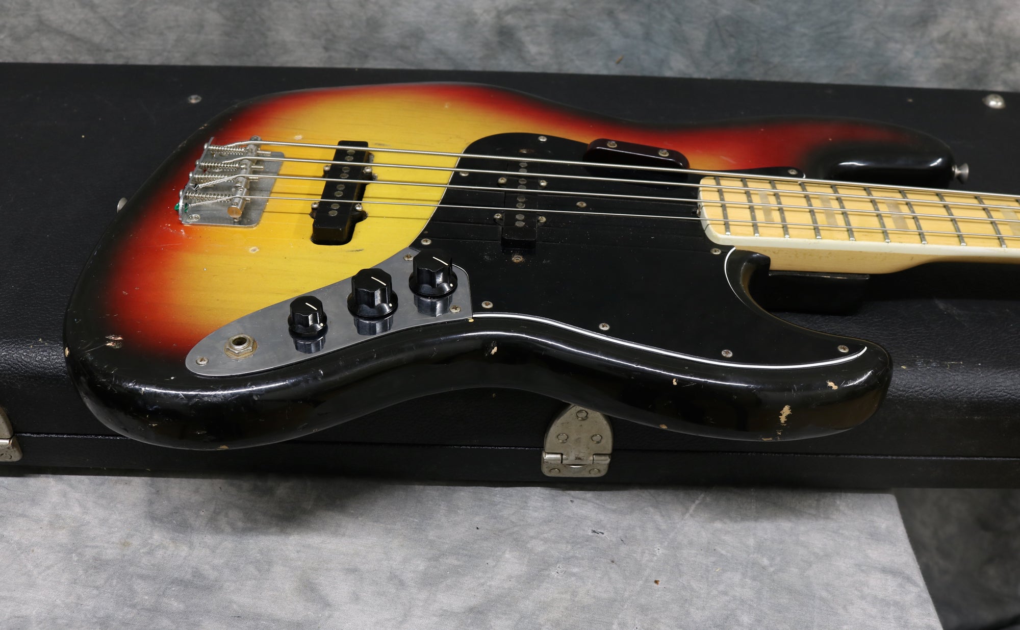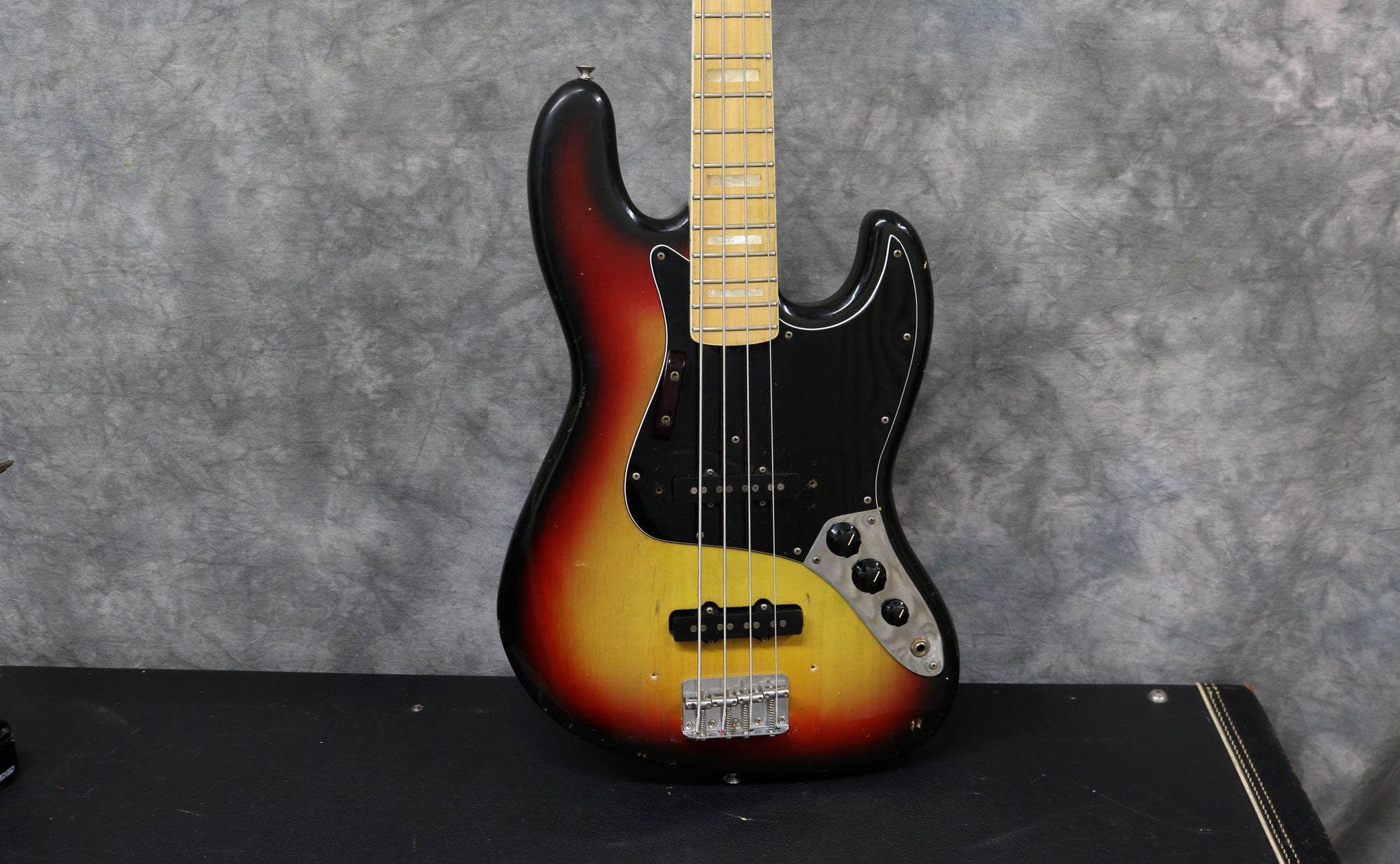 1974 Fender Jazz Bass with a Sunburst finish in good condition. Maple neck and fingerboard, pearl block inlays and white binding. All original and complete with the exception of the new chrome pickup cover, the solder on the volume pots and a rewound bridge pickup.