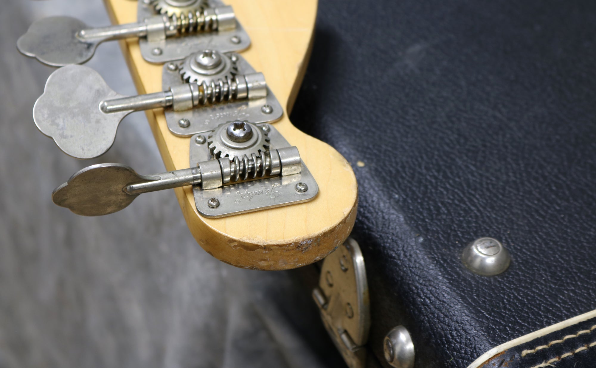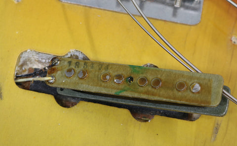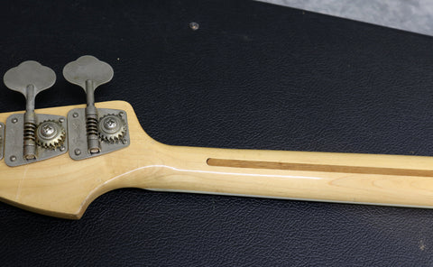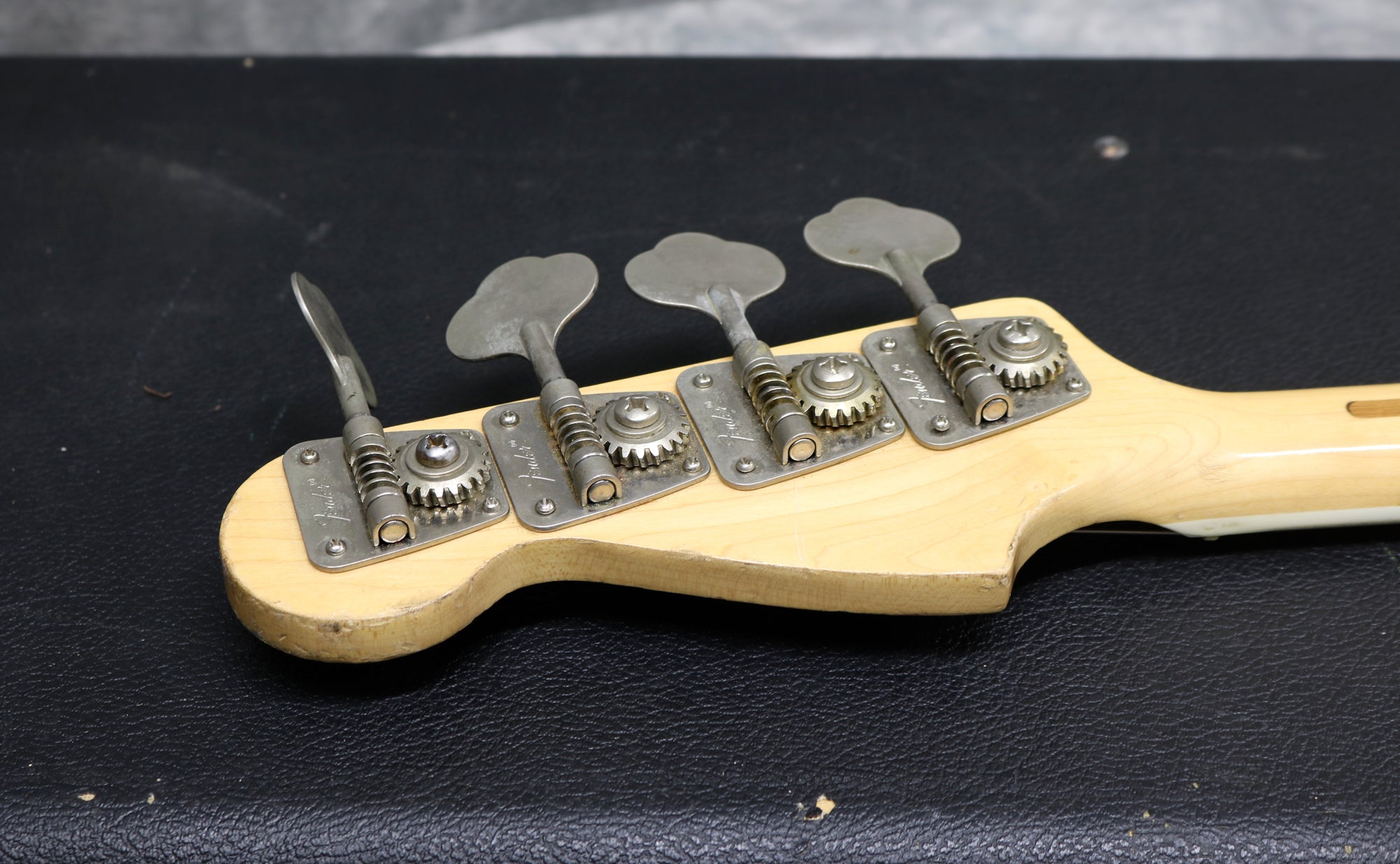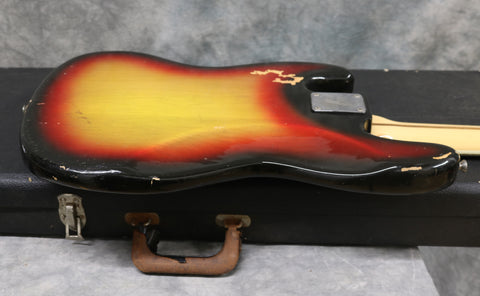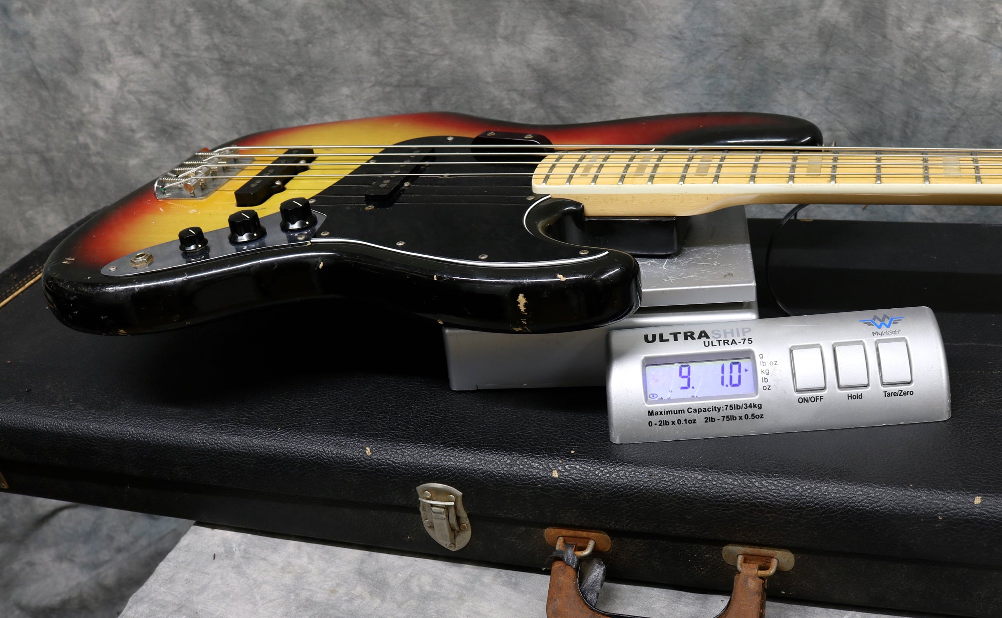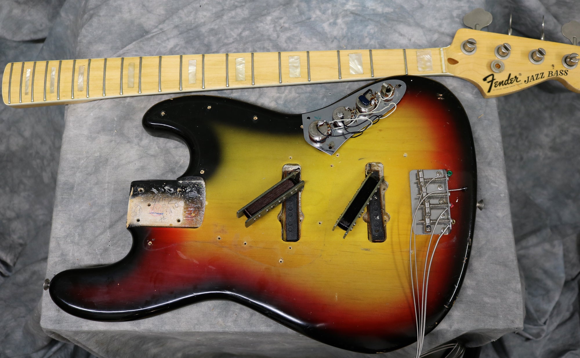 1974 Fender Jazz Bass with a Sunburst finish in good condition. Maple neck and fingerboard, pearl block inlays and white binding. All original and complete with the exception of the new chrome pickup cover, the solder on the volume pots and a rewound bridge pickup.