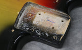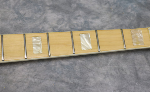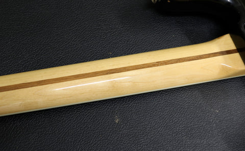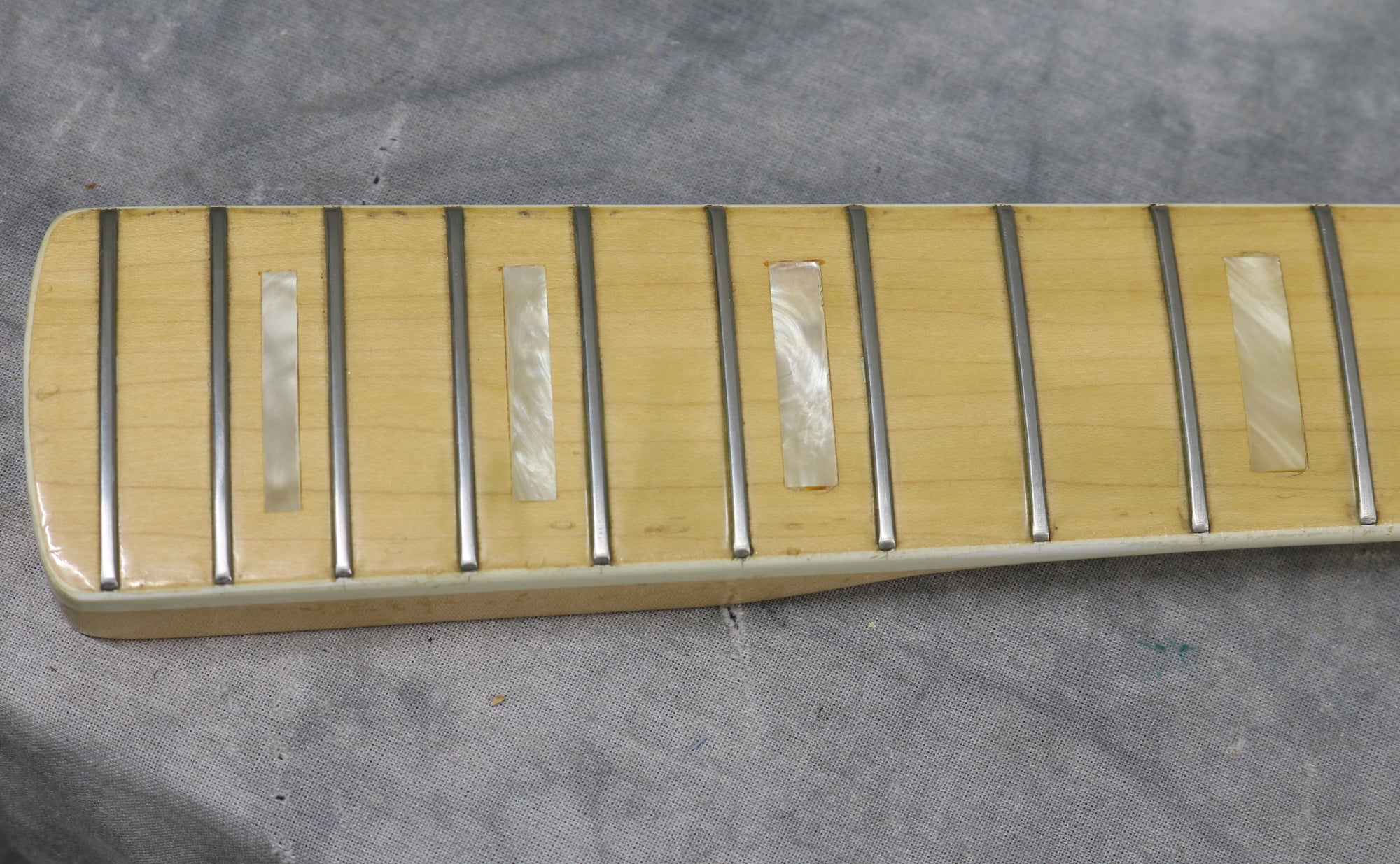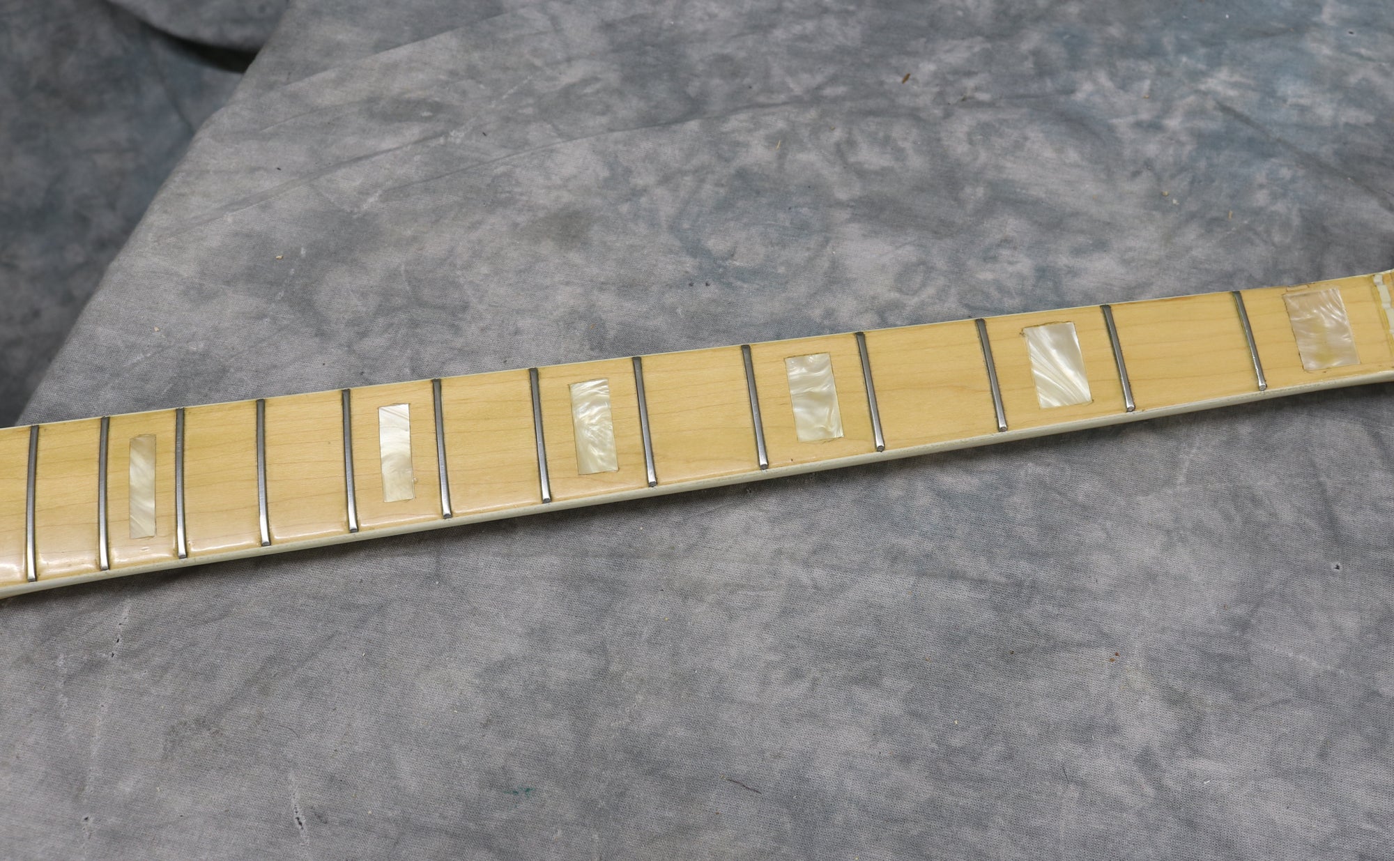 The finish has a fair amount of playwear with quite a few scuffs and dings to the body finish, mainly around the edges. The headstock also has a few scuffs around the edges. There is a small ding on the edge of the fingerboard binding (between the nut and the 1st fret) otherwise the binding is all intact. The frets have very little wear. The truss rod works as it should and the neck is straight.