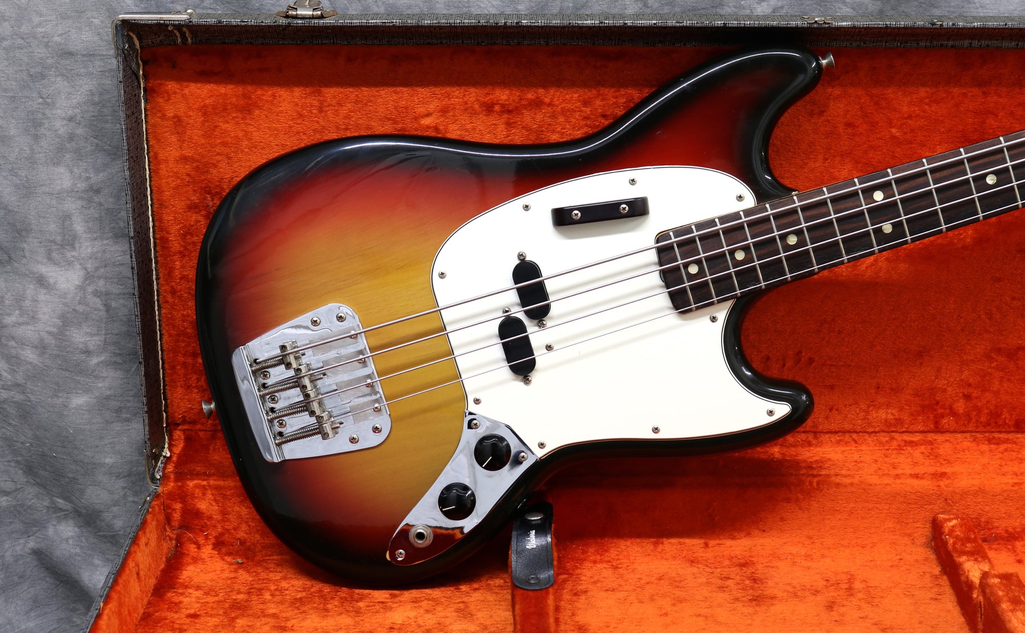 1974 Fender Mustang Bass in excellent condition. It has a beautiful sunburst finish which is still very vibrant and a Rosewood fingerboard. It's all original including the case, which is also in great condition.