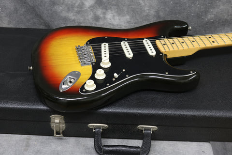 Mild play wear with a few very small nicks/scuffs & dings. Overall the guitar looks super cool & has a great vibe to it. Ash body finished in 3-tone sunburst. Tremolo bridge with adjustable saddles. 4-ply black pickguard & 3-ply black trem cover. It has a medium-profile maple neck with black dot inlays. The Frets have very little wear and have plenty of life in them. Large headstock with bullet truss rod & double string trees. F tuners are in perfect working condition. The neck is straight & the truss rod works as it should.
