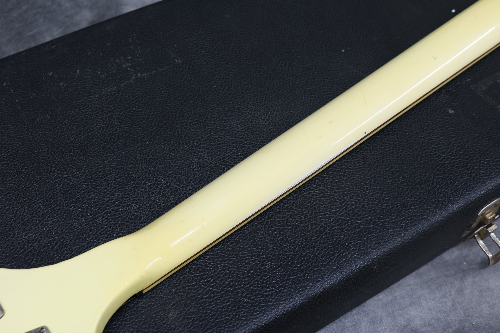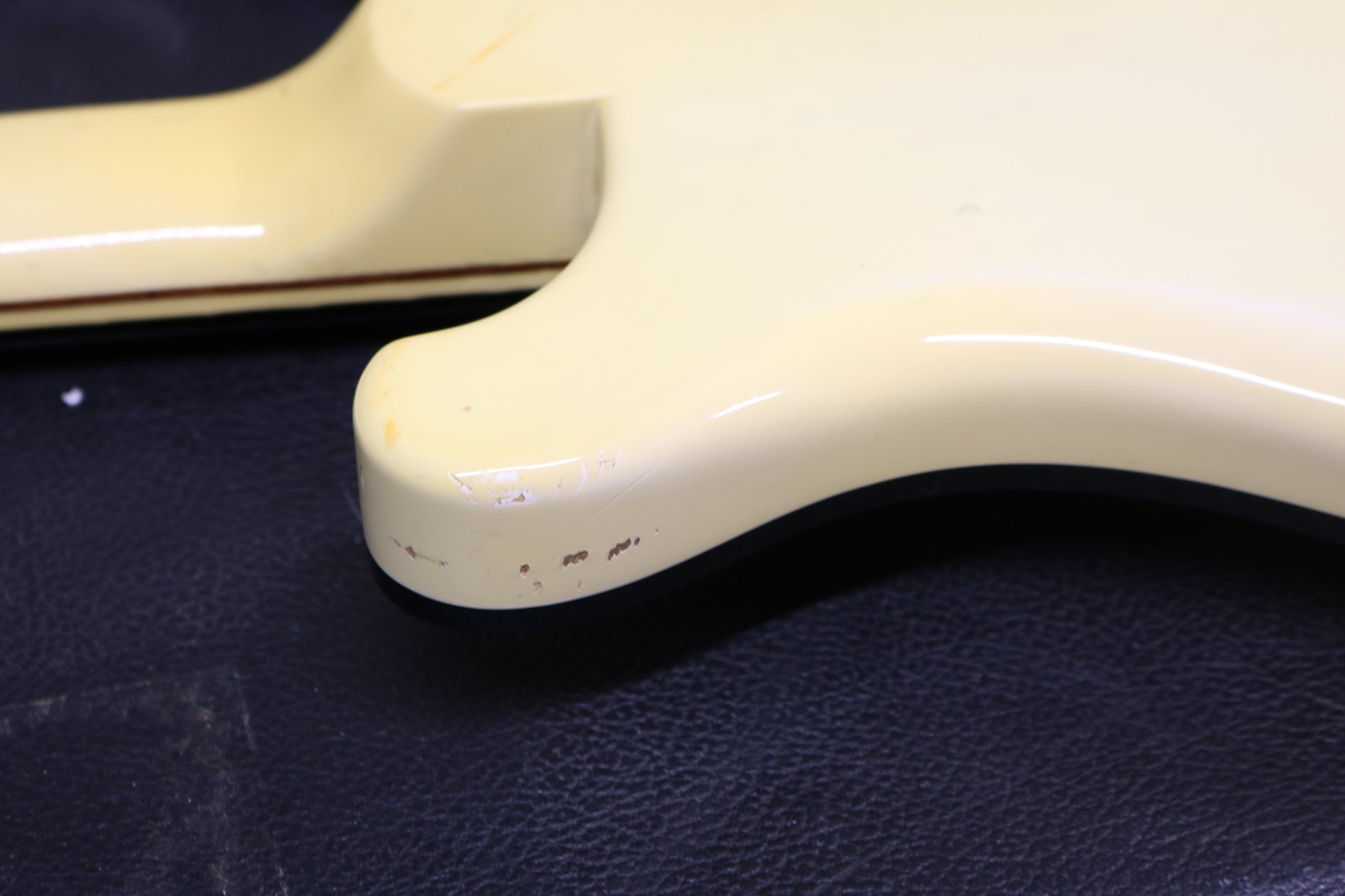 It's missing the pickup cover and has a newer pickguard. Original case included. The finish has some wear in a couple of spots to the front face and dings around the edges. It has also yellowed quite a bit in places.