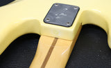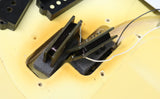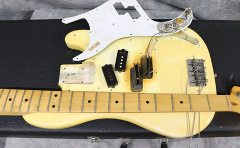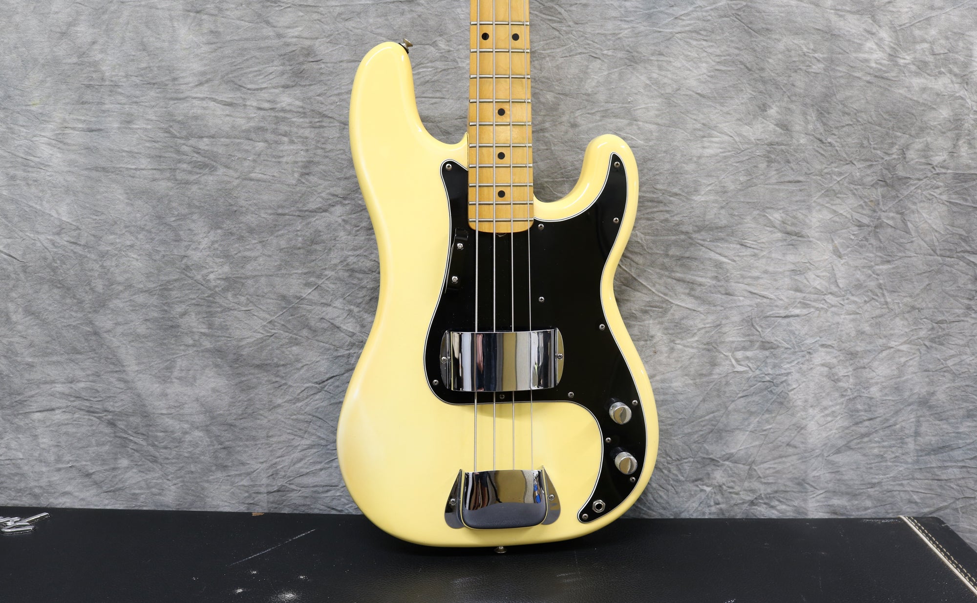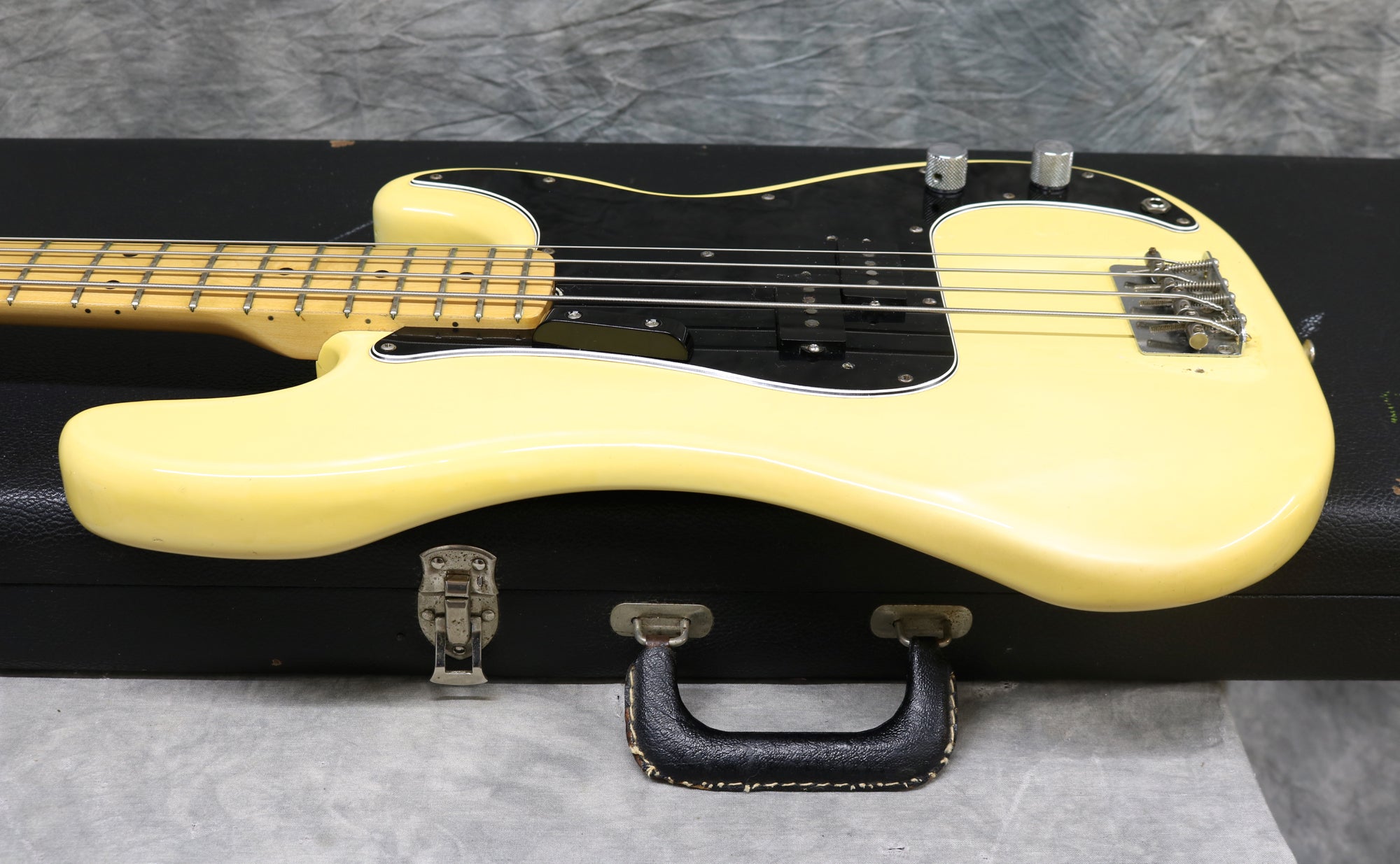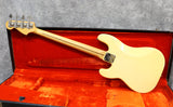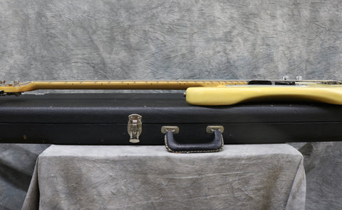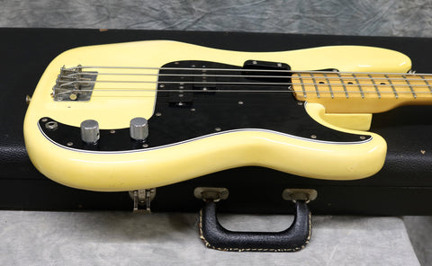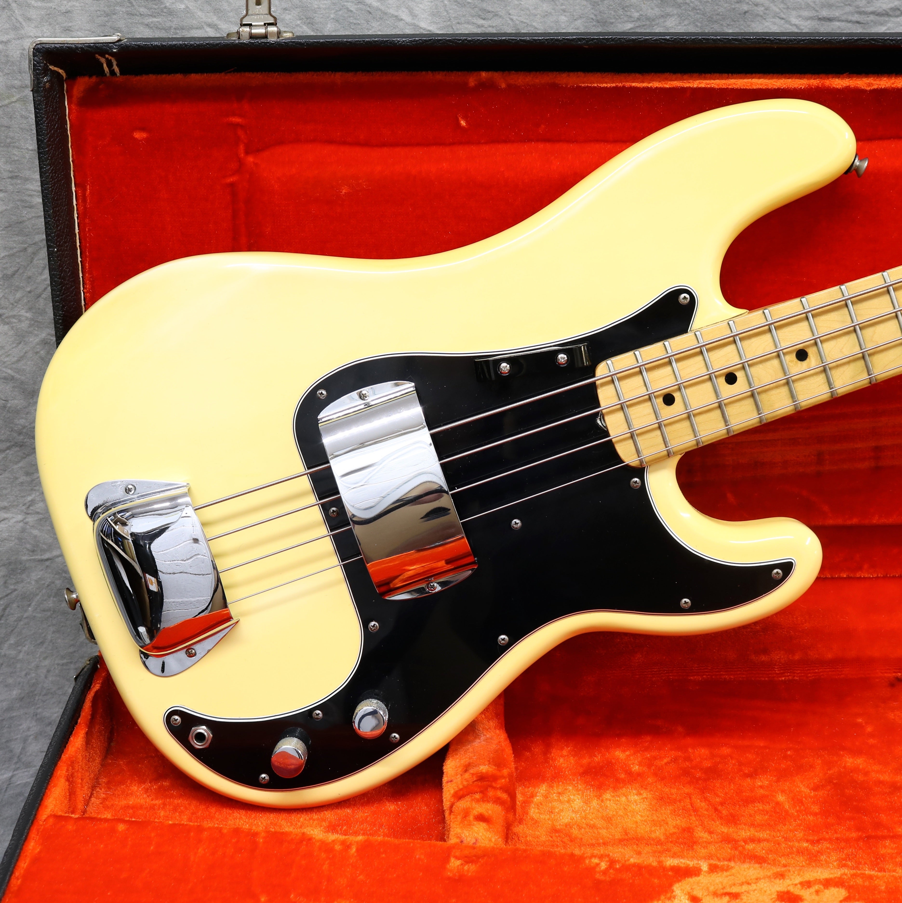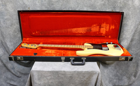 1977 Fender Precision Bass in excellent condition. Olympic White finish with a black pickguard and a maple fingerboard. Original Fender hard case included. It has original pots, pickups, hardware and frets. The only changes seem to be one of the strap buttons, the metal pickup cover and 2 extra holes that have since been filled and touched up from someone re-positioning the strap button. (one on the heel of the body and one on the tip of the lower horn)