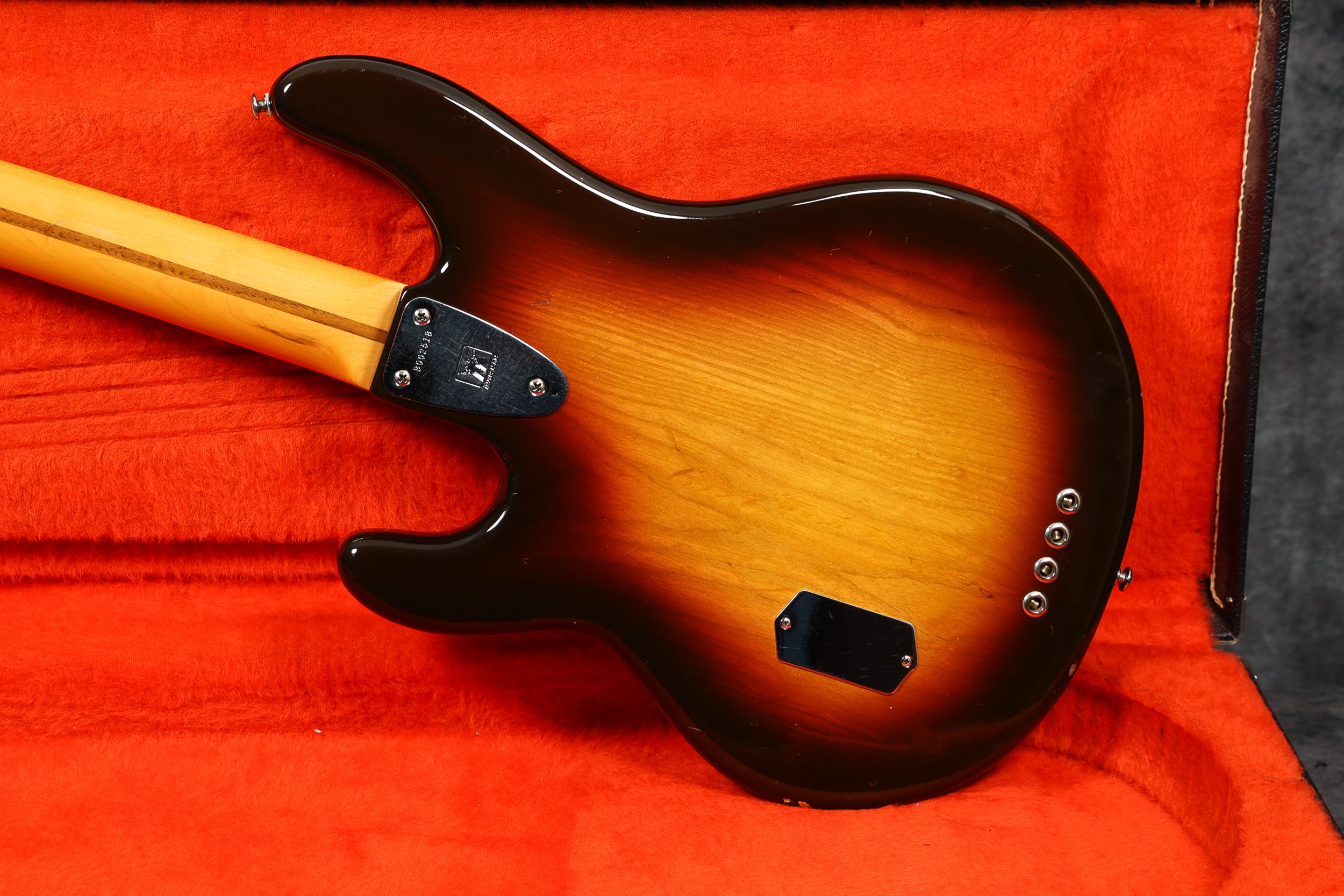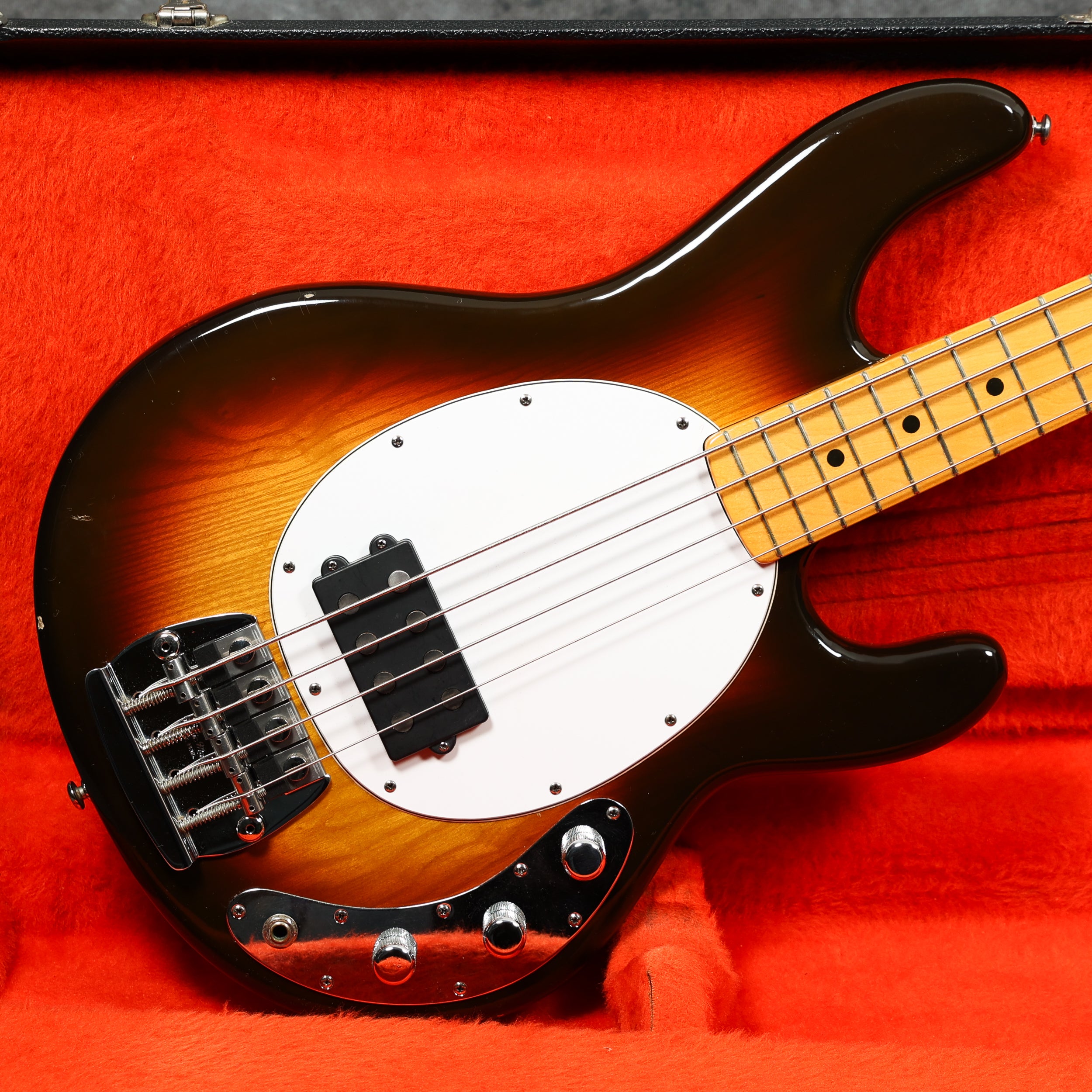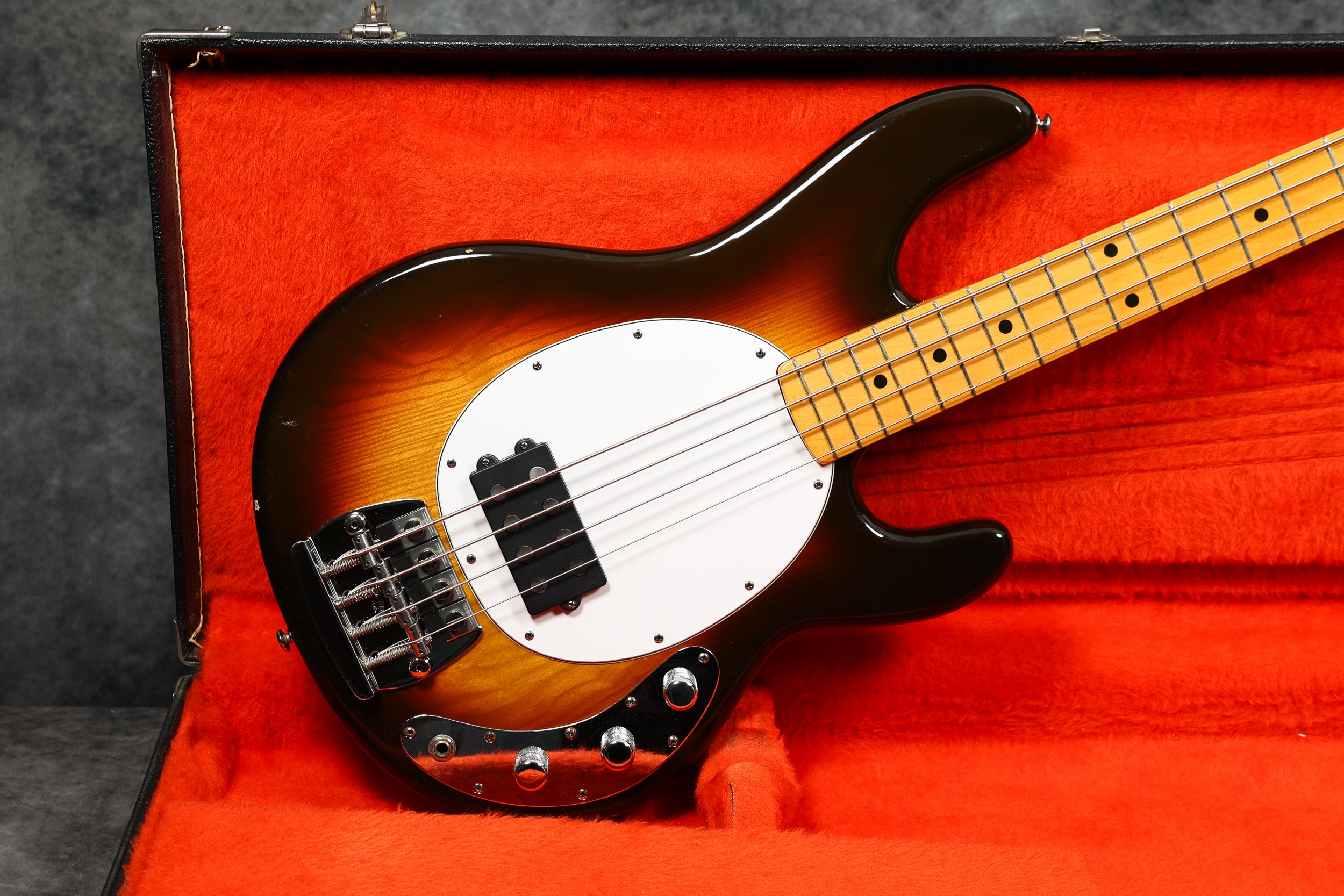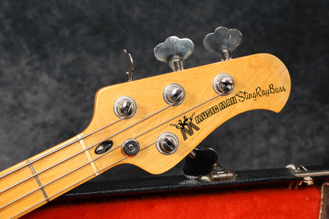 1977 Music Man Stingray in excellent condition. Sunburst finish, black pickguard, maple neck & fretboard. Equipped with a 2-band EQ, epoxy-coated preamp, long pole piece pickups and through-body stringing. Aside from the new mute sponge, it's all original, including the hard case.