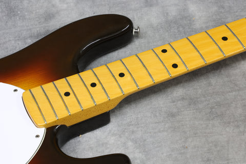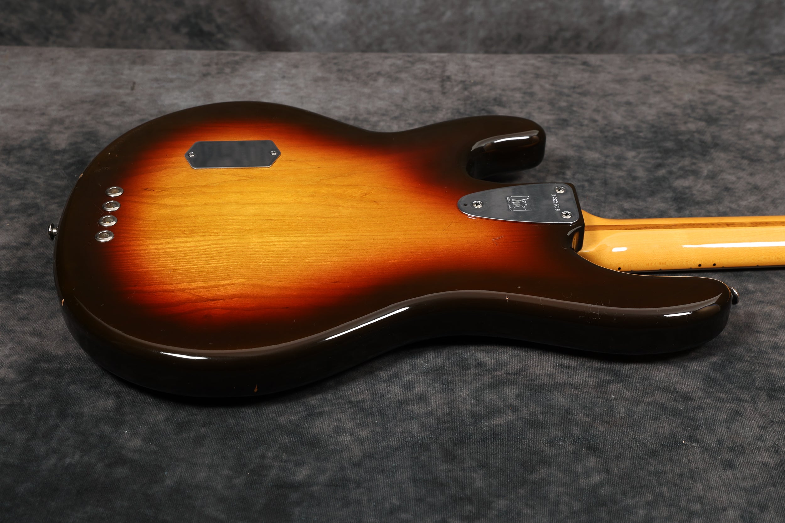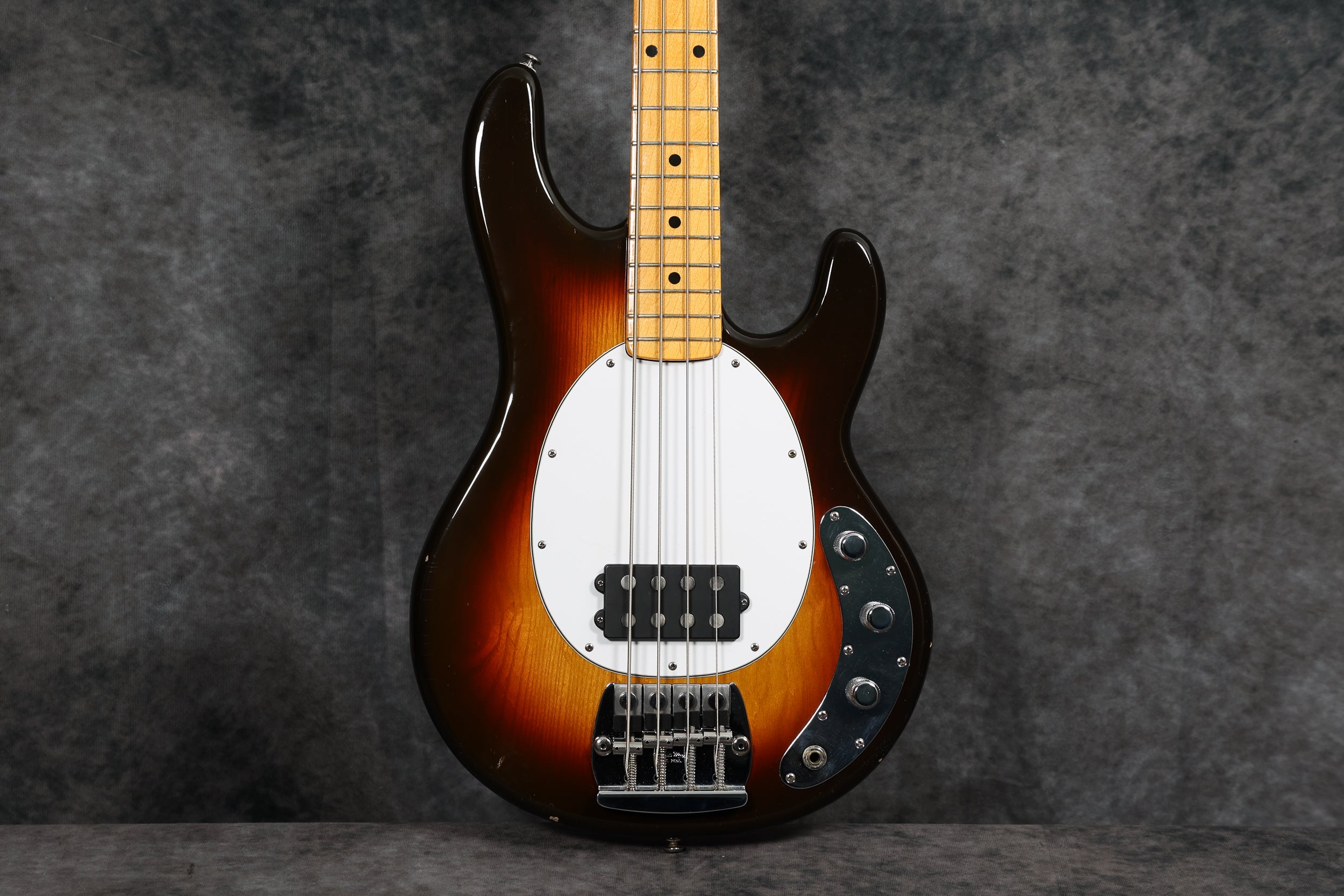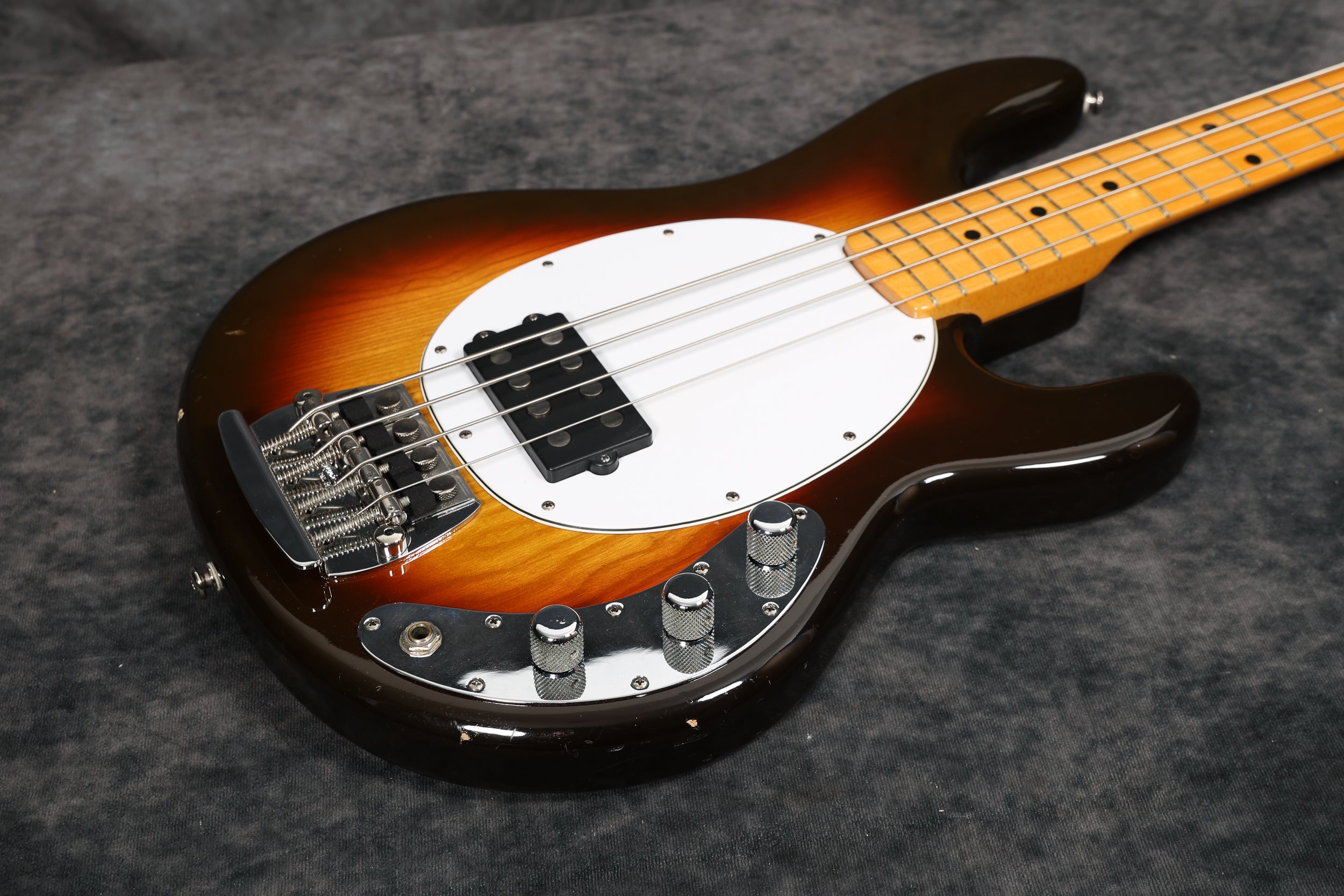 1977 Music Man Stingray in excellent condition. Sunburst finish, black pickguard, maple neck & fretboard. Equipped with a 2-band EQ, epoxy-coated preamp, long pole piece pickups and through-body stringing. Aside from the new mute sponge, it's all original, including the hard case.