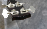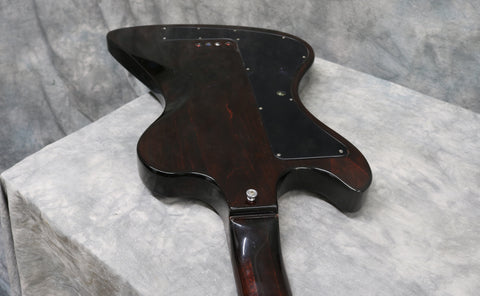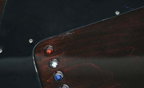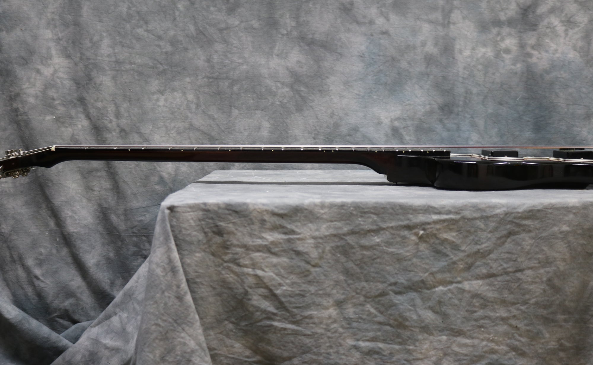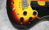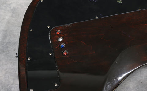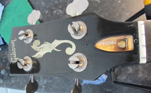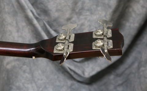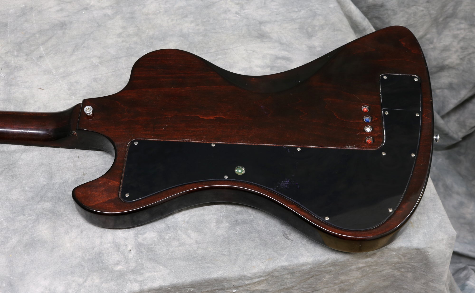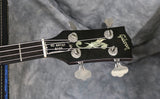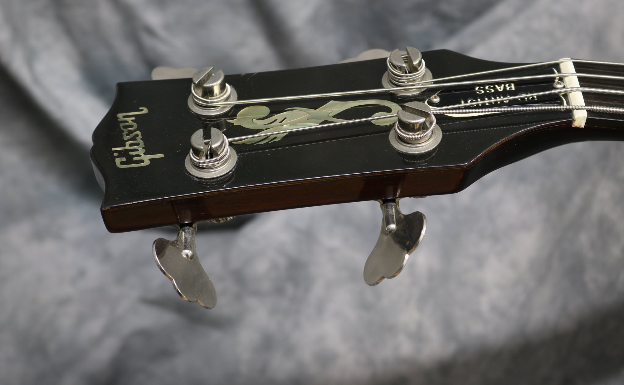 Maple set neck and body, custom designed active electronics with built-in compression/expansion, bright and neutral modes. 3-way pickup selector. 34 1/2 inch scale. Pearloid dot inlays and headstock motif. This bass is active with no passive mode. Electronics designed by Moog. Gibson humbucker pickups.