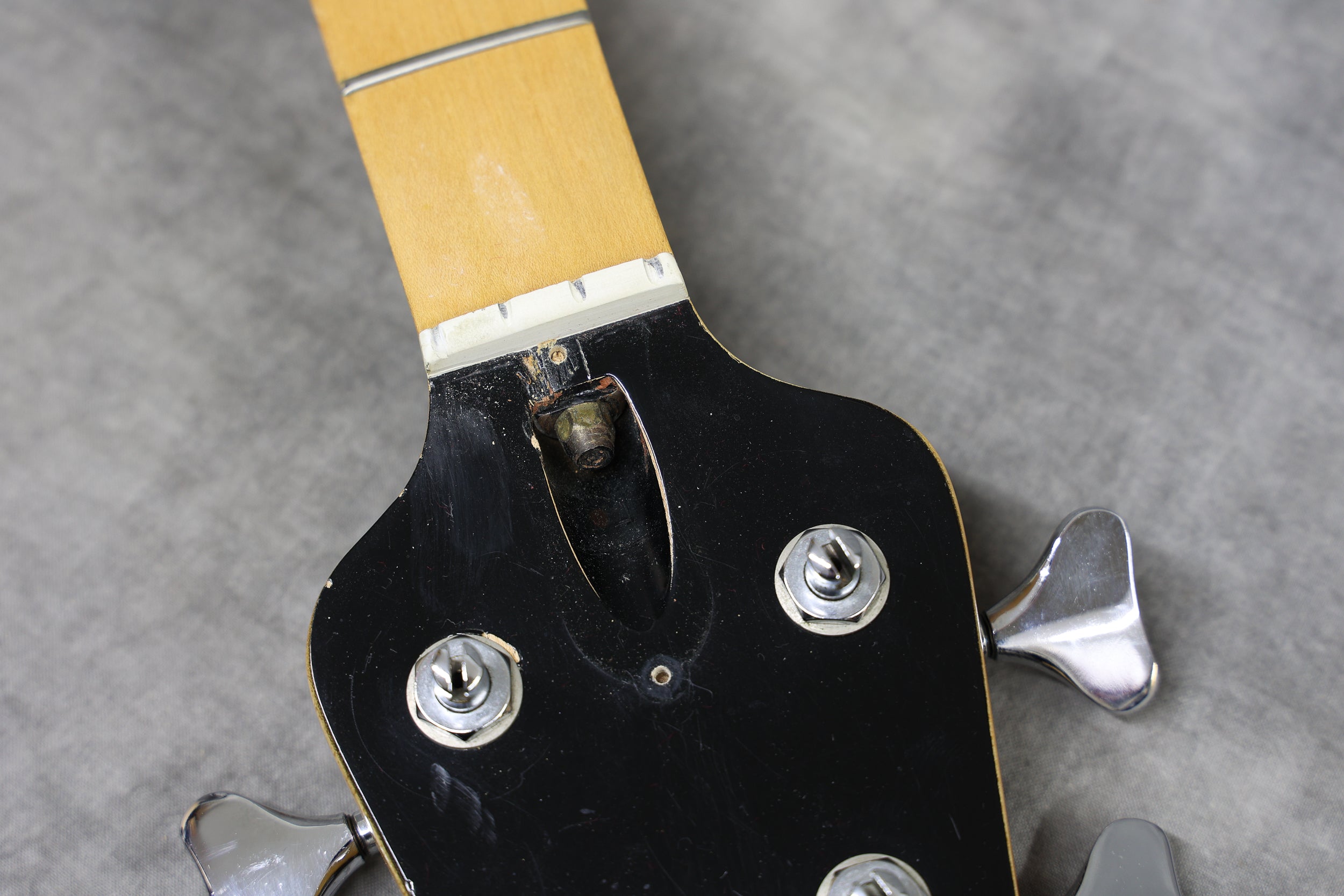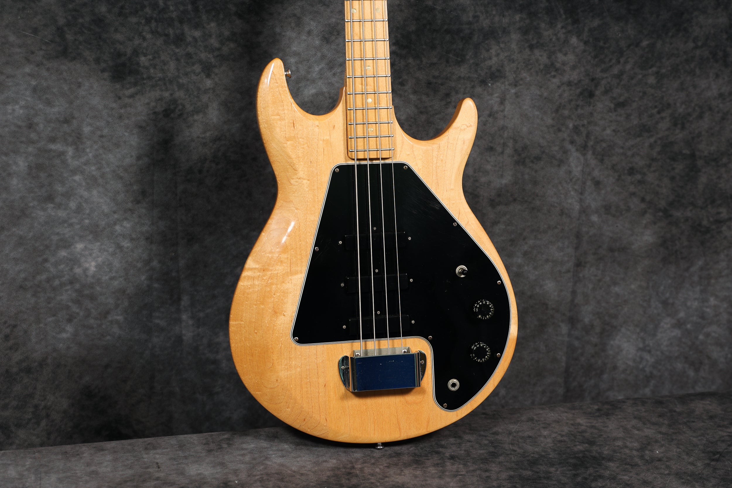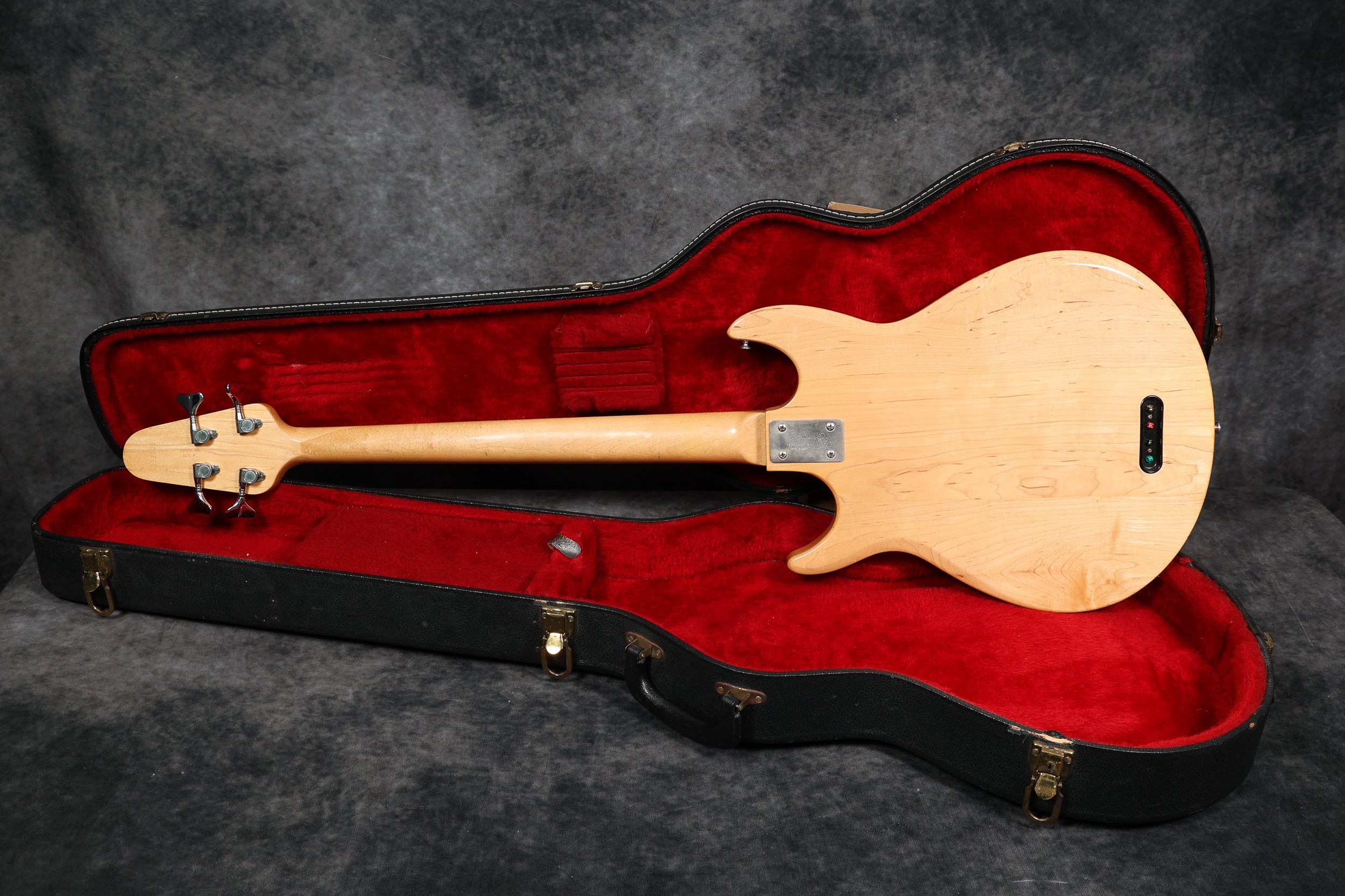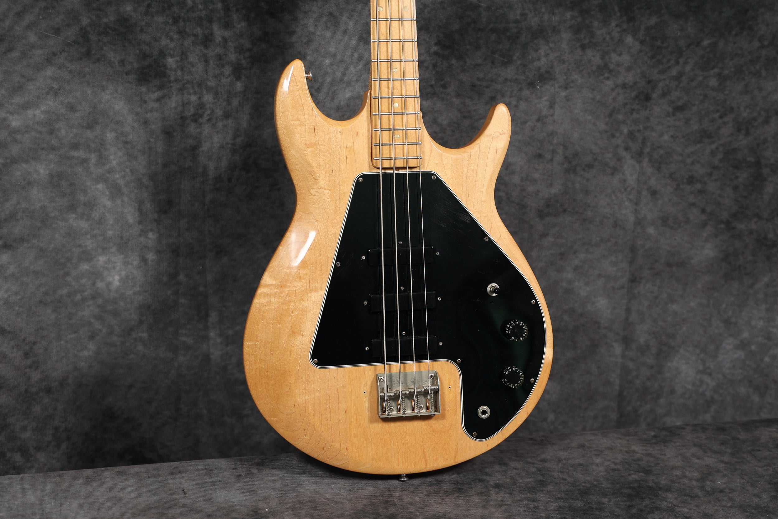 It has an arrow-shaped headstock inspired by the flying V. Contoured body edge vaguely echoes the SG, its offset horns were clearly reminiscent of other popular makes, as was its bolt-on neck (4 bolt). The strings go through the body allowing for greater sustain and this bass definitely has that, along with a superb tone.