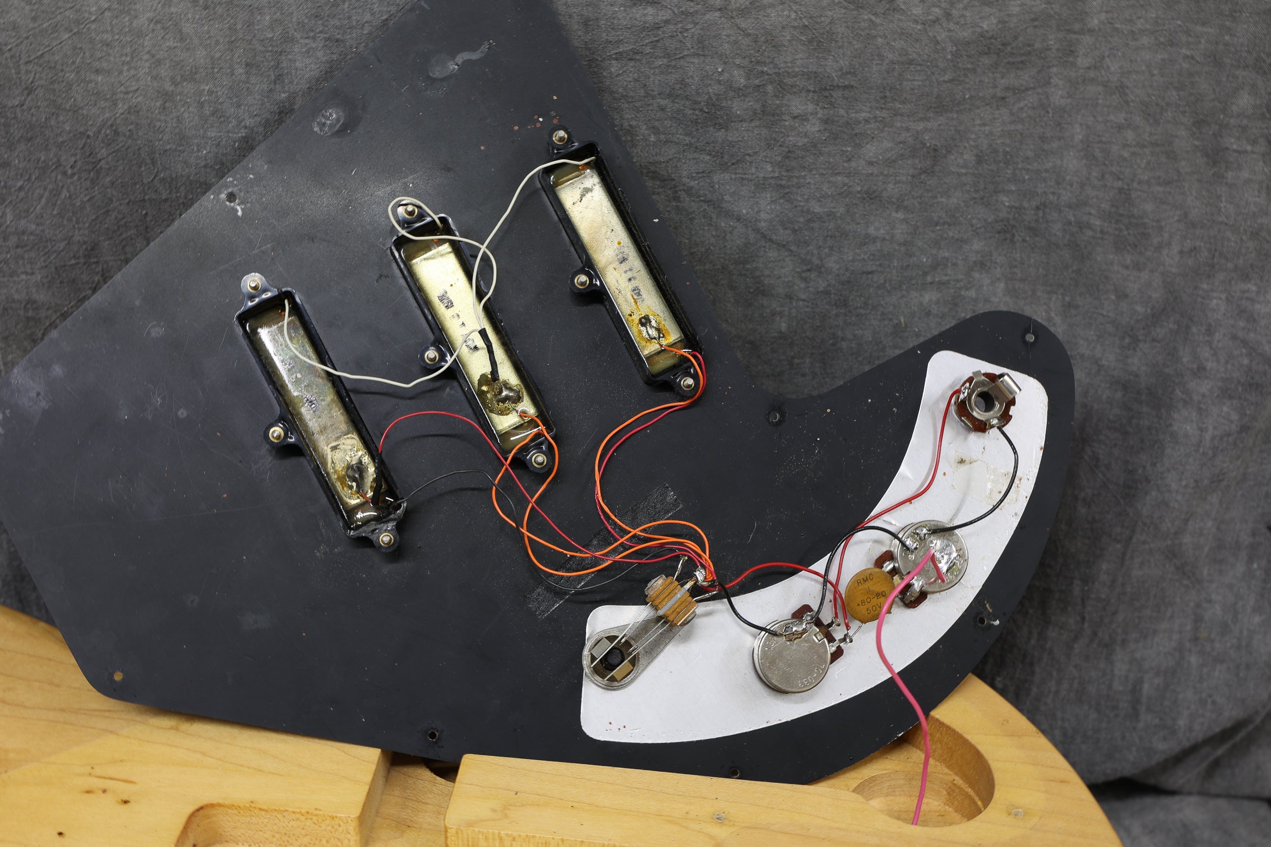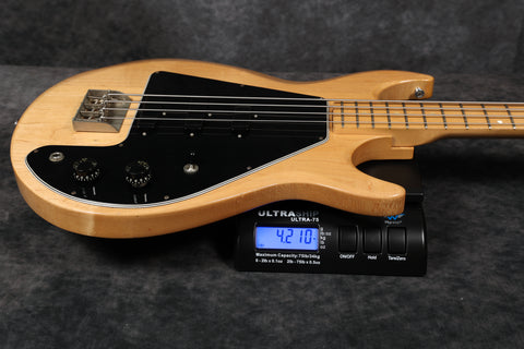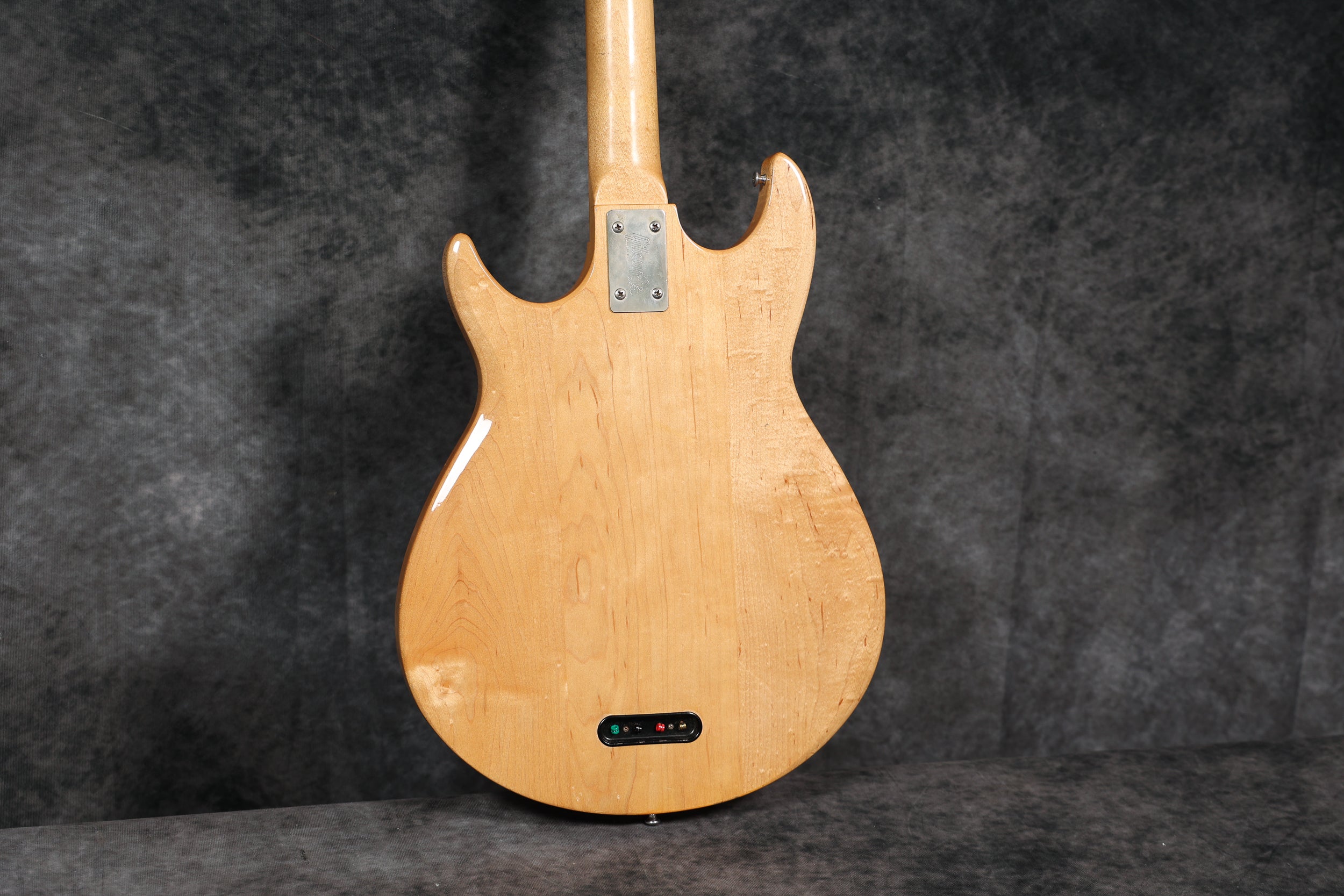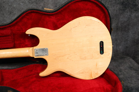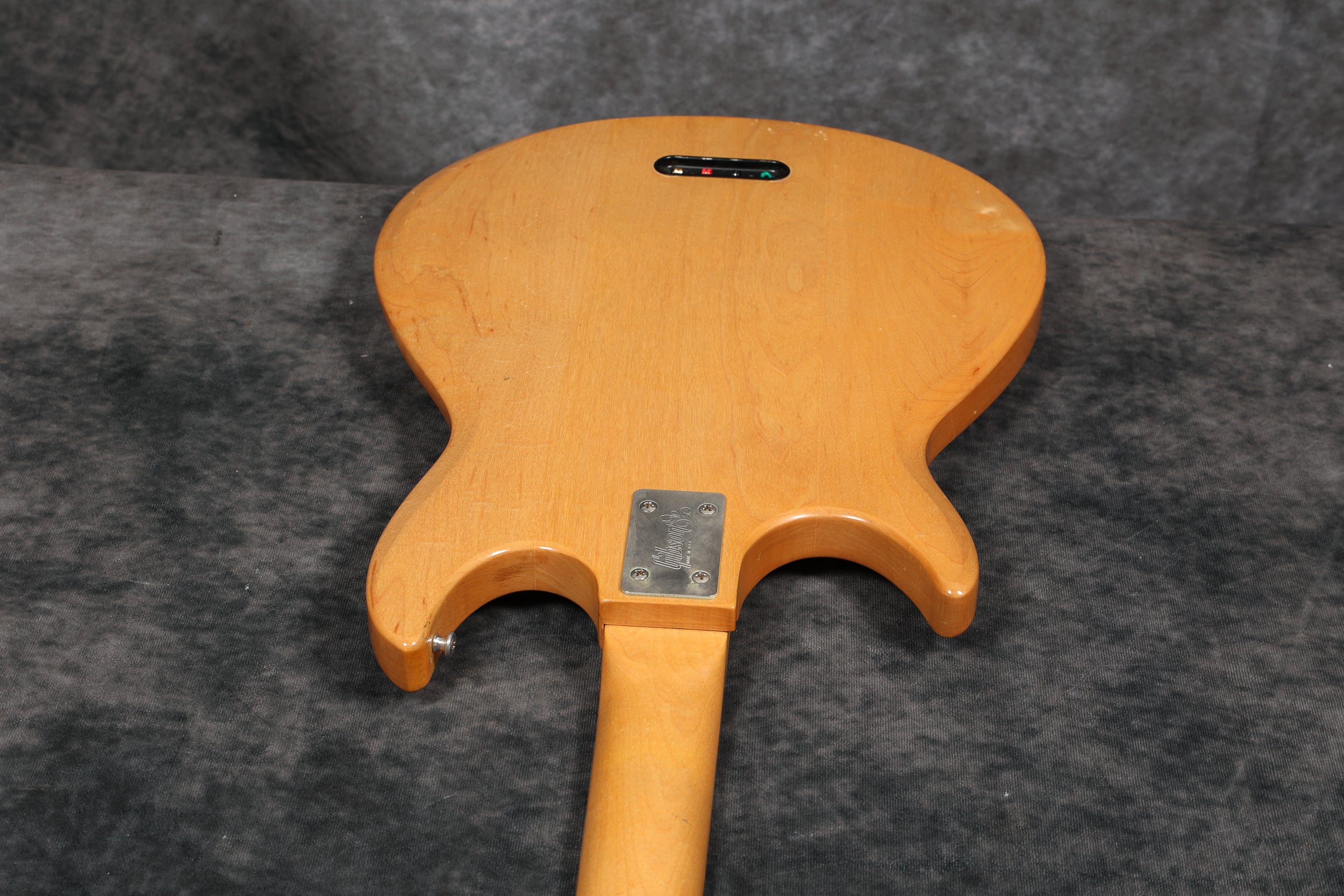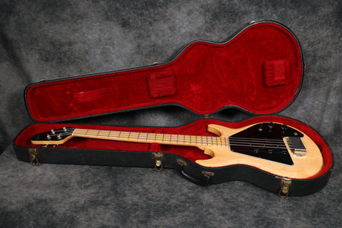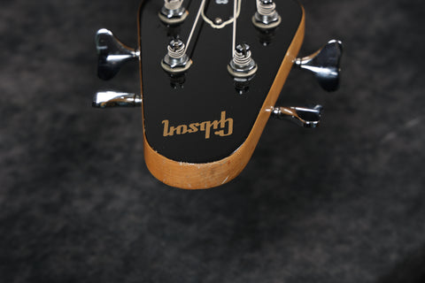 It has an arrow-shaped headstock inspired by the flying V. Contoured body edge vaguely echoes the SG, its offset horns were clearly reminiscent of other popular makes, as was its bolt-on neck (4 bolt). The strings go through the body allowing for greater sustain and this bass definitely has that, along with a superb tone.