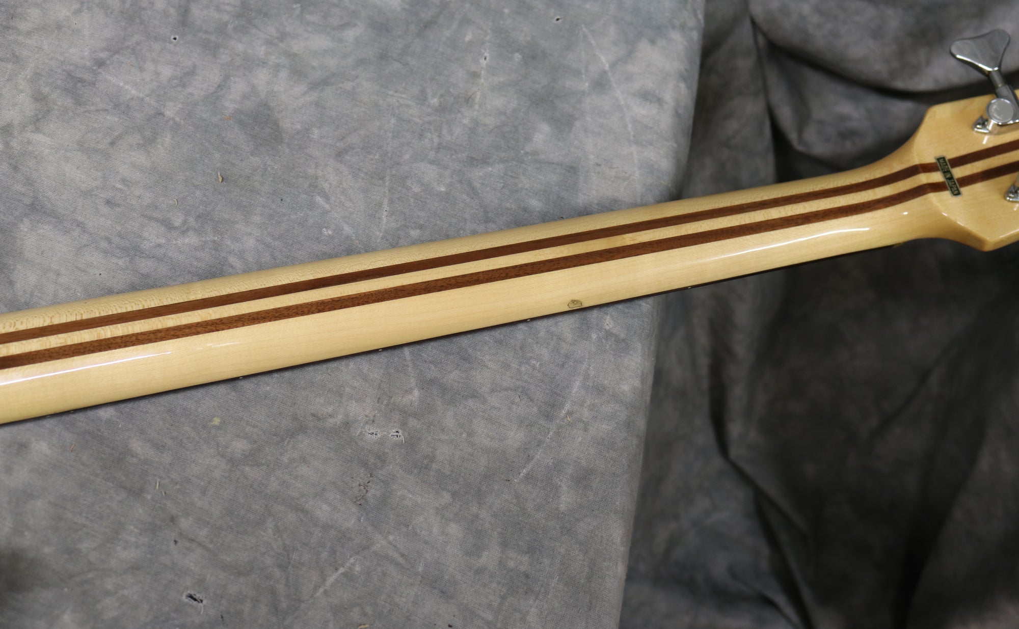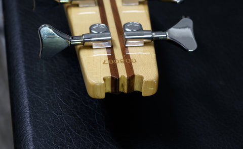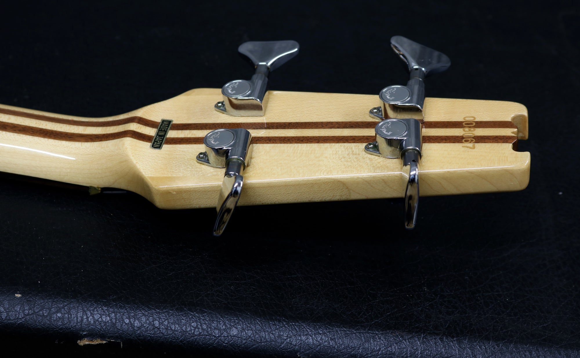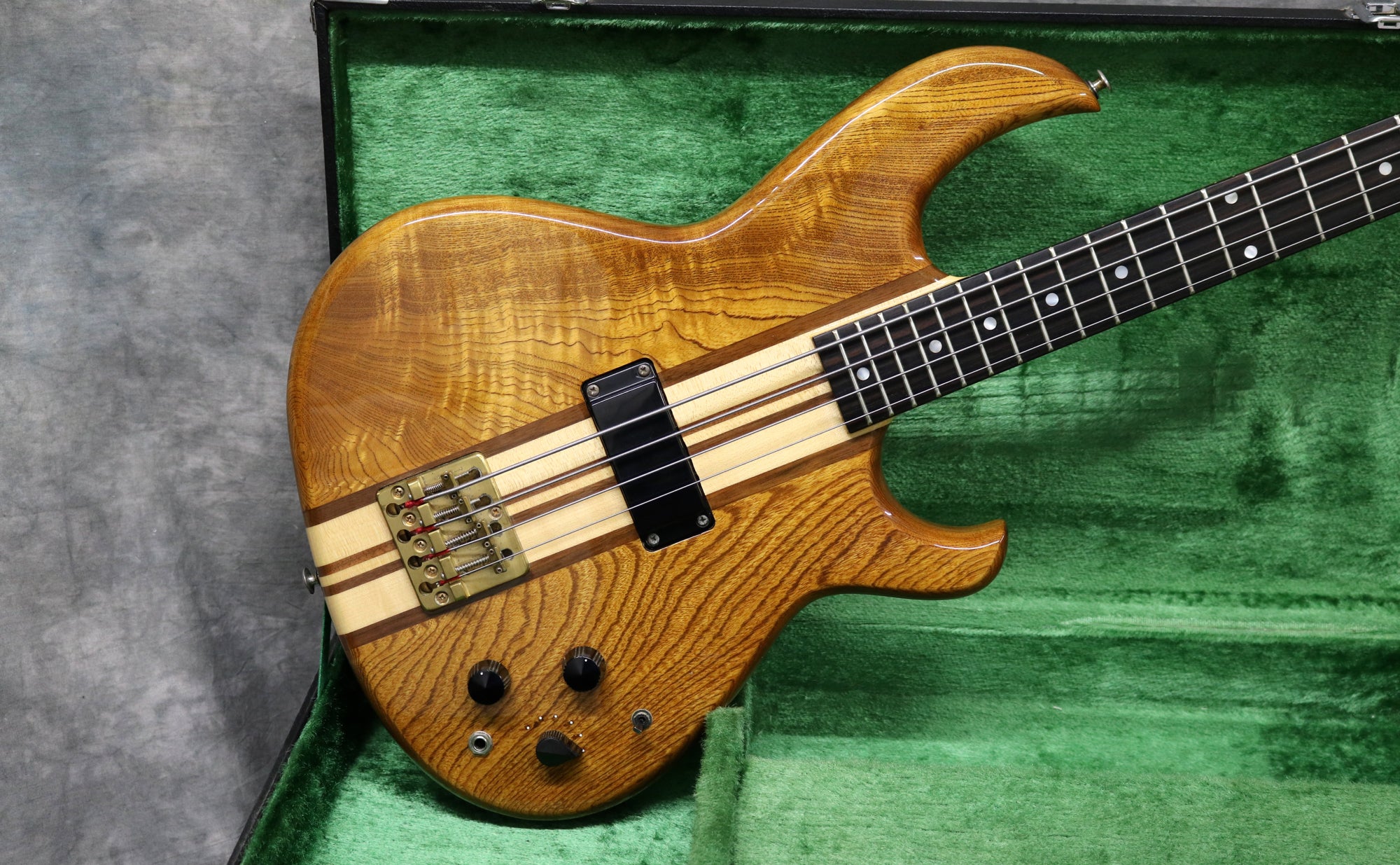 The is one of the early (77-80) Aria SB100 basses and has a 5 ply maple/walnut neck, brass nut and bridge, jacaranda fingerboard, 24 frets, Canadian ash body with an oak finish, single MB-1 double coil pickup, volume, tone, 6-position tone selector, active Noise Killer circuit.