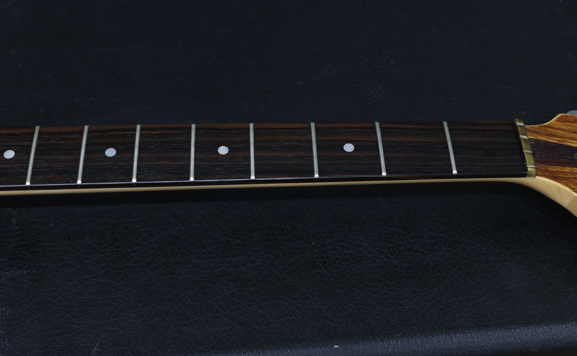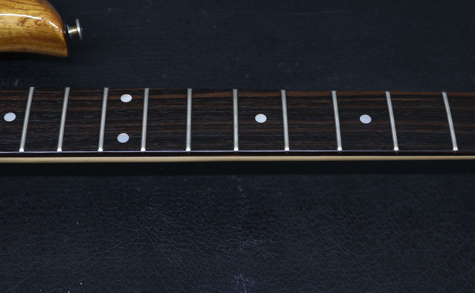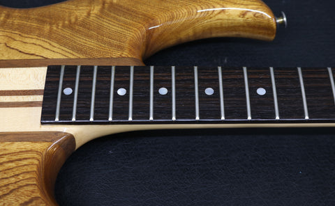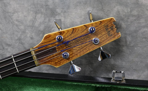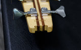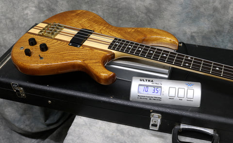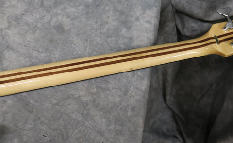 The is one of the early (77-80) Aria SB100 basses and has a 5 ply maple/walnut neck, brass nut and bridge, jacaranda fingerboard, 24 frets, Canadian ash body with an oak finish, single MB-1 double coil pickup, volume, tone, 6-position tone selector, active Noise Killer circuit.