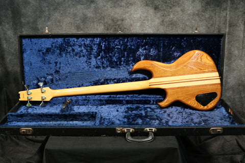 This is one of the early (77-80) Aria SB basses. It has a glued-in neck construction, a brass nut and bridge, a Jacaranda fingerboard, 24 frets, a Canadian ash body with an oak finish, and a single MB-1 double coil pickup. The main difference is that the SB700 is passive with simple controls: 1 x volume, 1 x Tone and a coil tap.