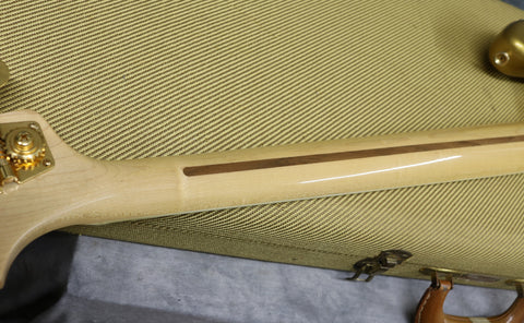 There are a few small nicks & dings around the edge of the body with a slightly larger patch of wear on the edge of the upper body contour. The neck and headstock are extremely clean as is the fretboard. The neck has binding & black side-dots. Maple fingerboard with black dot inlays. Frets are in great shape with very little wear & plenty of life in them. Headstock decals are very clean & gold Fender tuners are in perfect working condition. 1 1/2" nut width; 34" scale length. The neck is straight & truss rod is functioning.