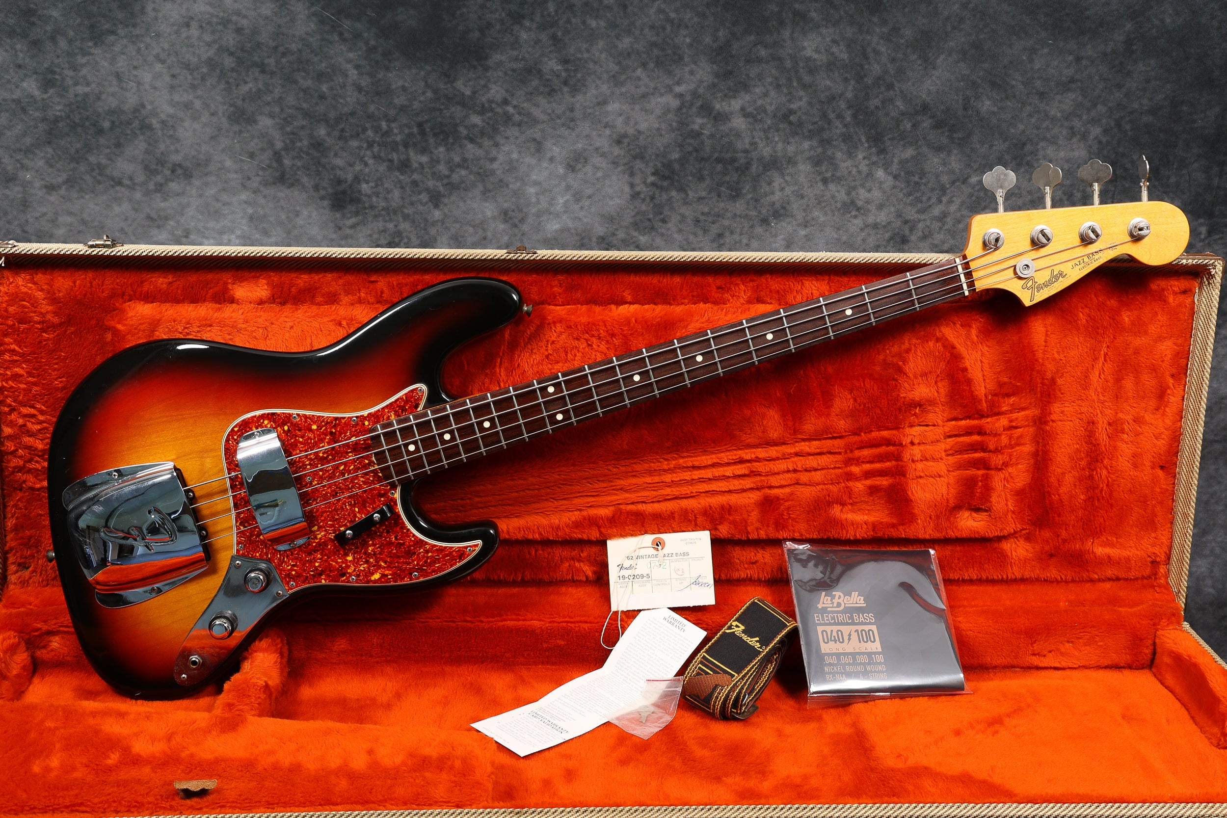 1983 Fender American Vintage Reissue '62 stack knob Jazz Bass, Fullerton factory 62 reissue. Excellent condition. All original, including the case. The original Fender strap, hang tag and warranty card are included.