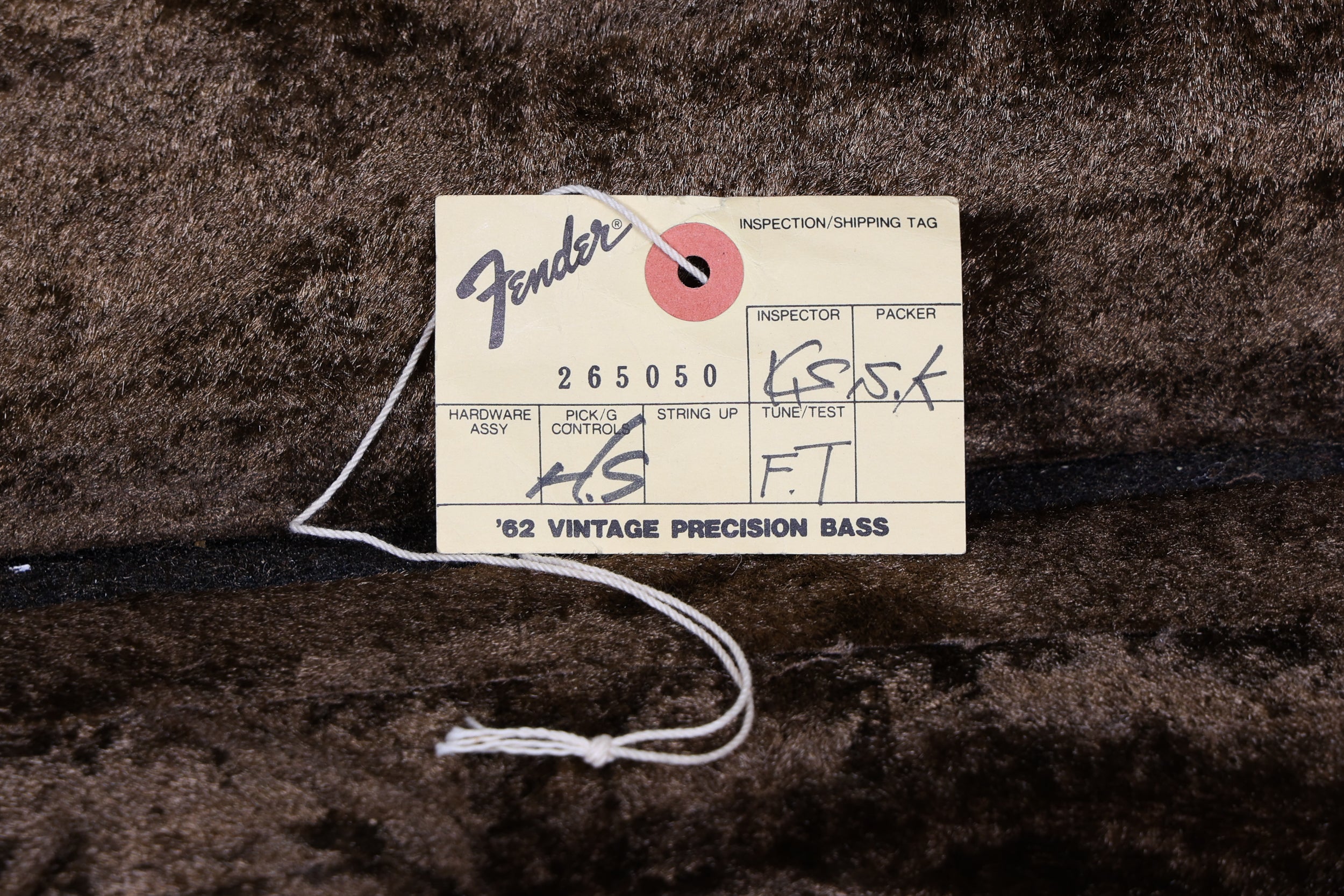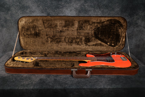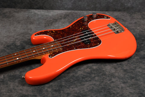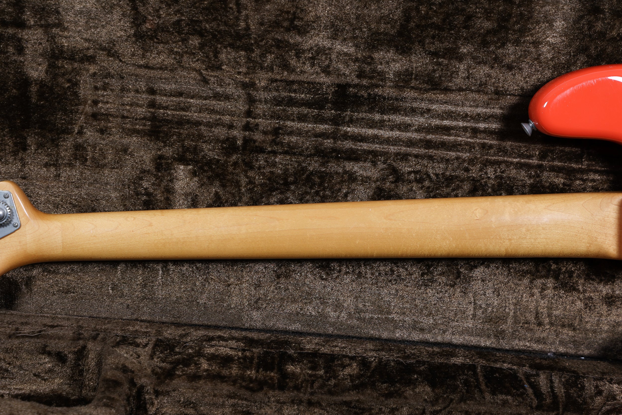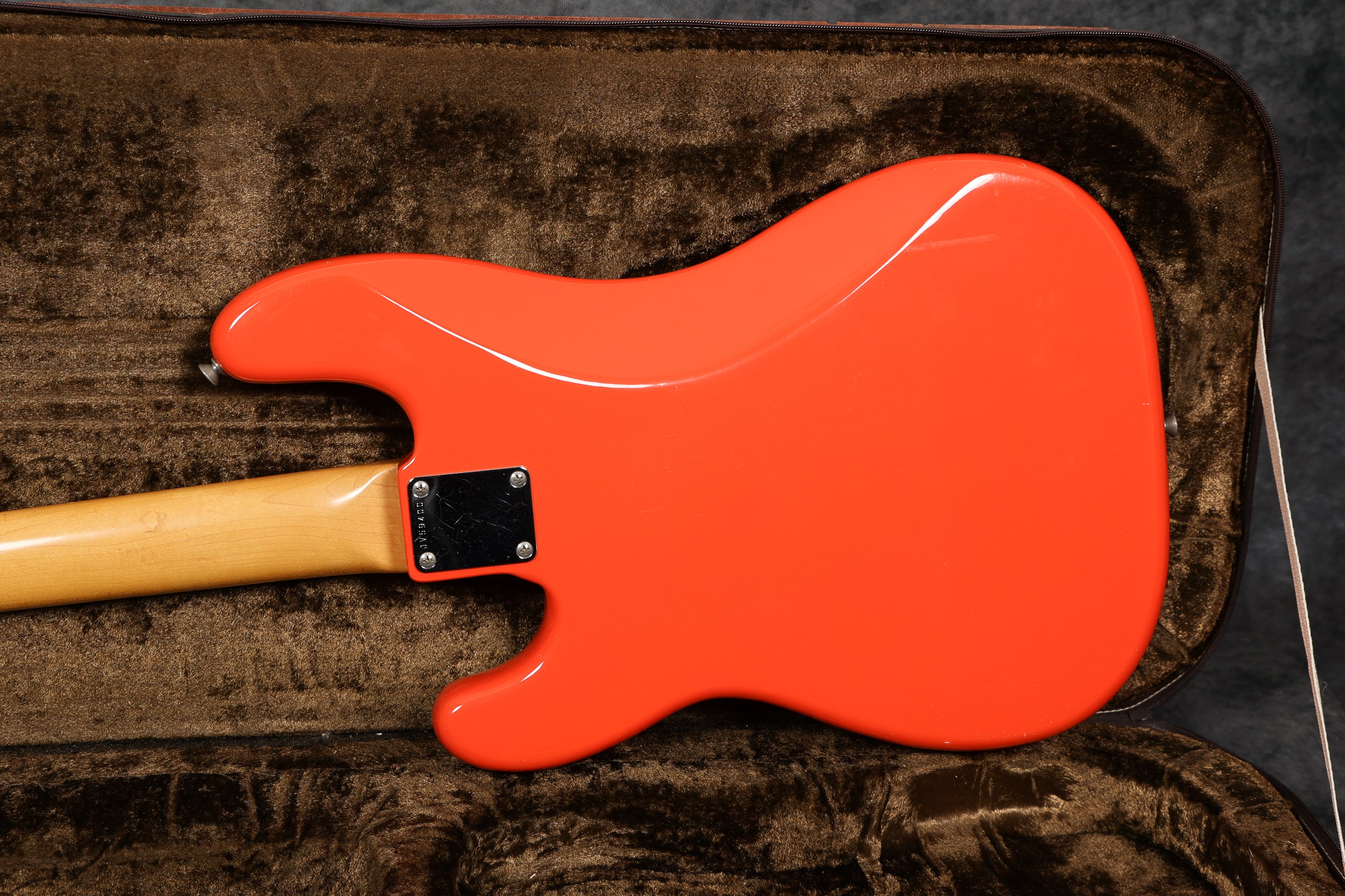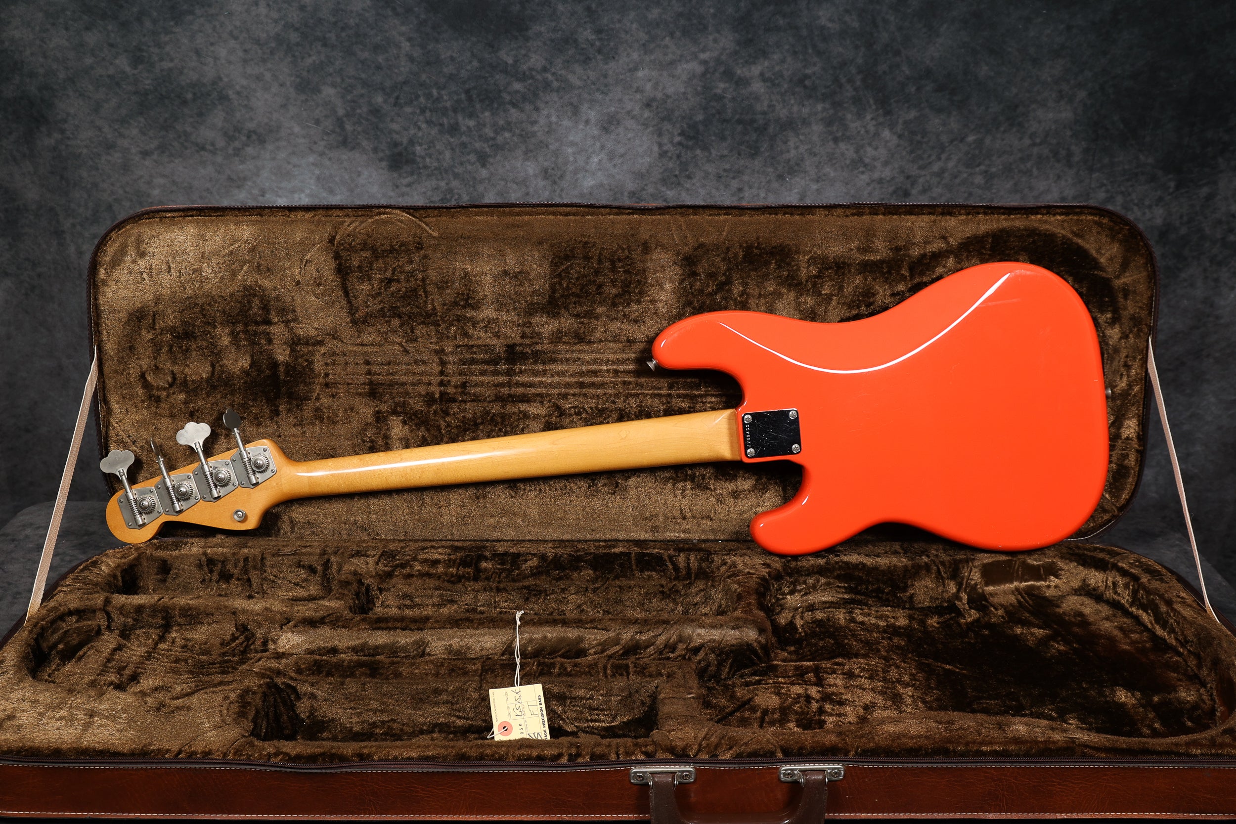 1983 Squier JV series, 62 reissue (Export model) Precision Bass in exceptionally good condition. Fiesta Red over an alder body, maple neck and rosewood fingerboard. This bass is all original. Hard case included. Serial: JV59400. Weight: 8 lbs 7 oz / 3.83 kg. Nut width: 43 mm. Depth at 1st fret: 22 mm.