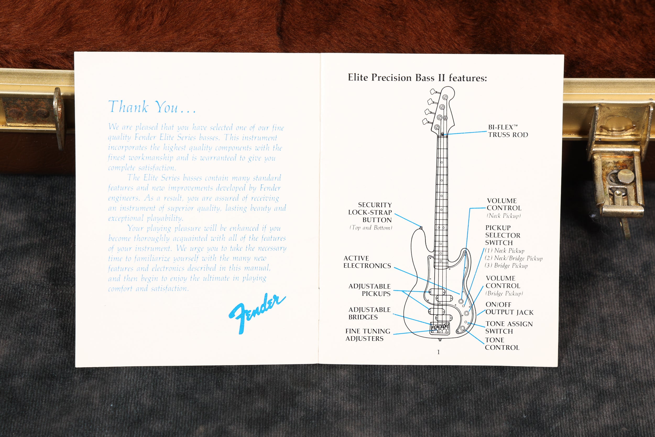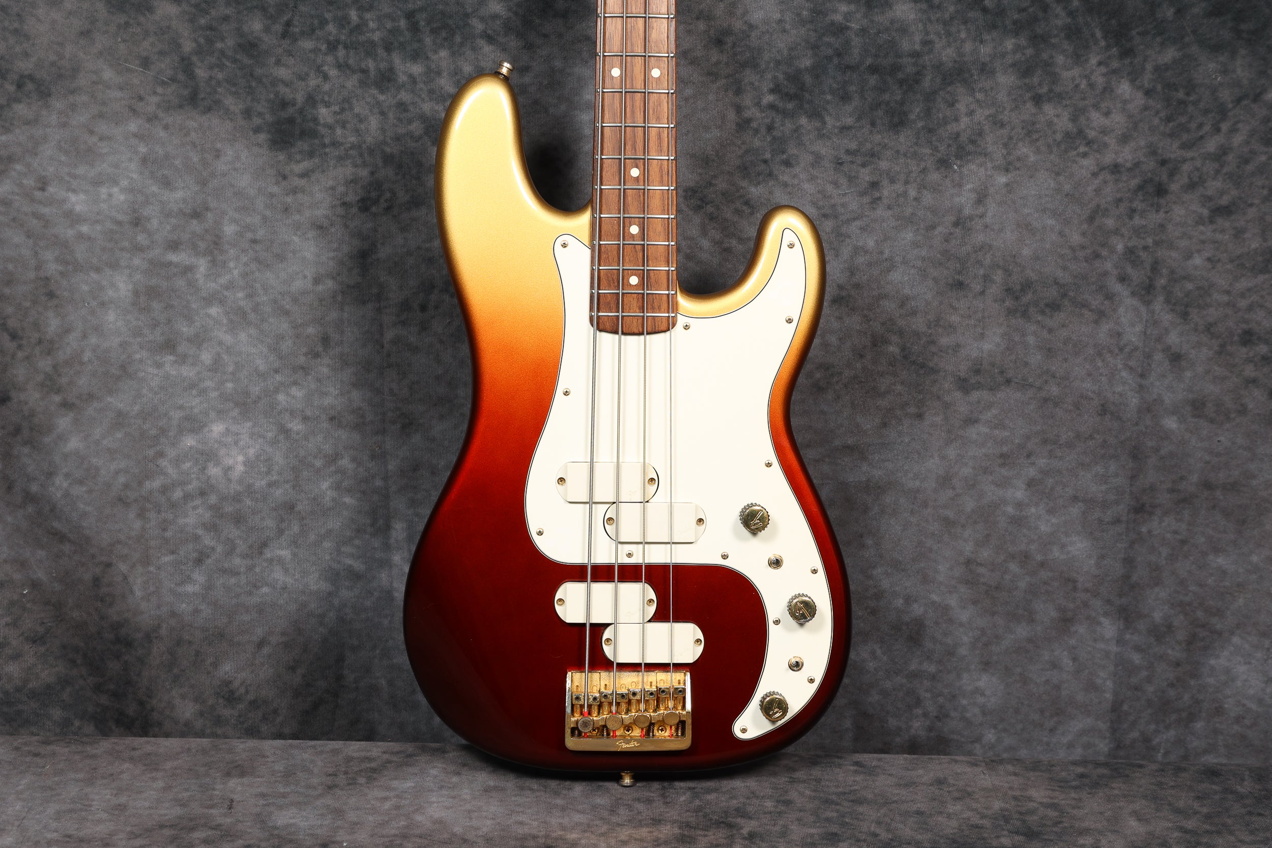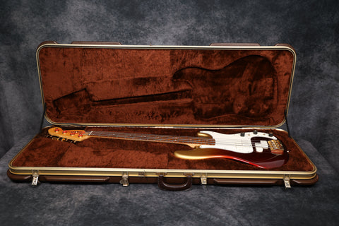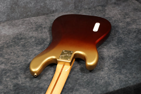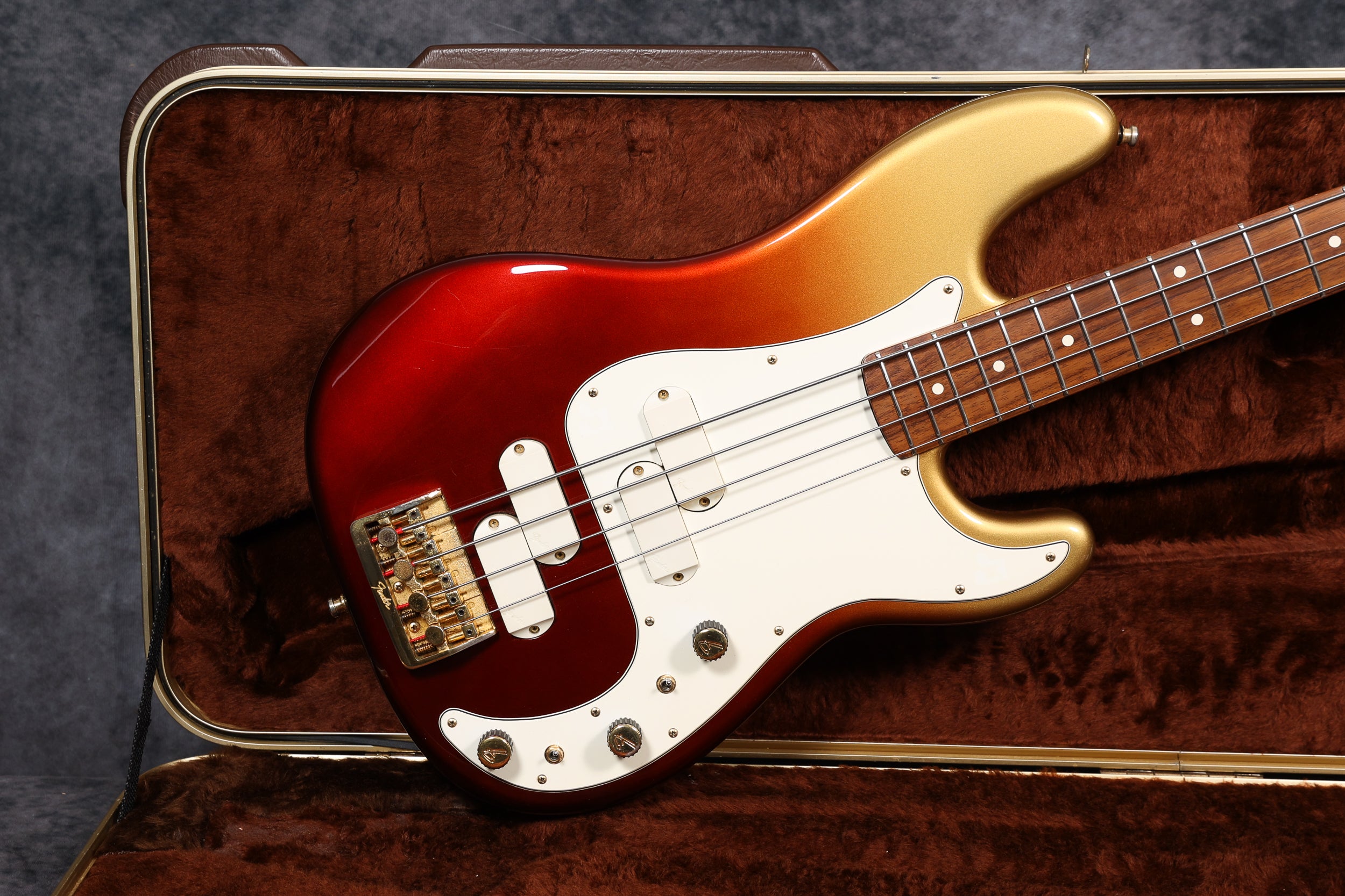 1984 Fender Gold Elite Precision Bass II in exceptionally good condition. It has a rare Bronze Stratoburst finish and is all original, including the case. It has a wide C-profile Maple neck with a beautiful rosewood fingerboard, which has a 7.25" radius. Although the neck is wide from side to side, it is quite slim front to back.
