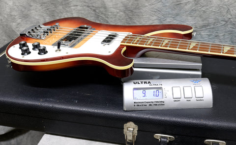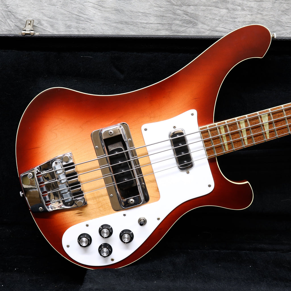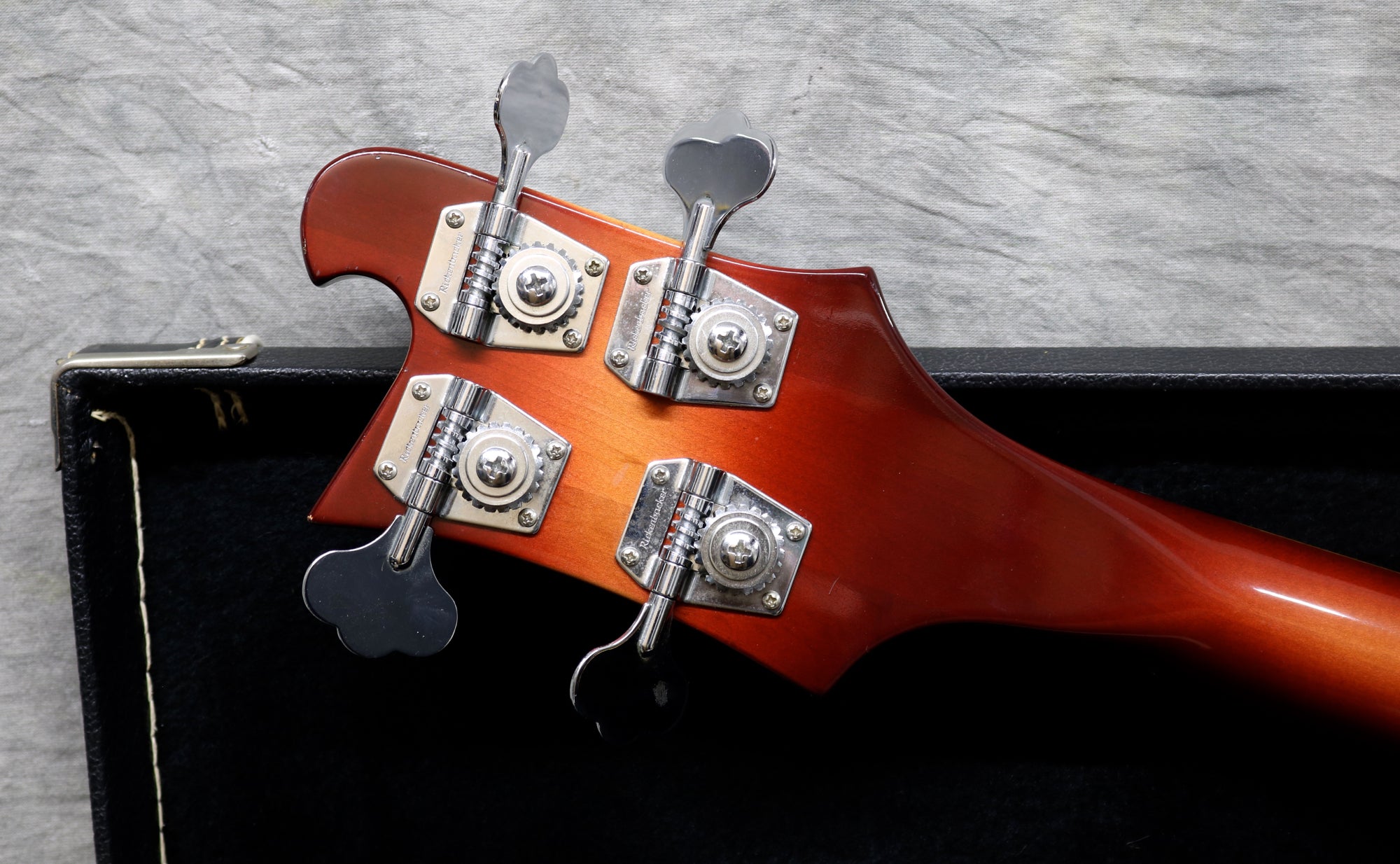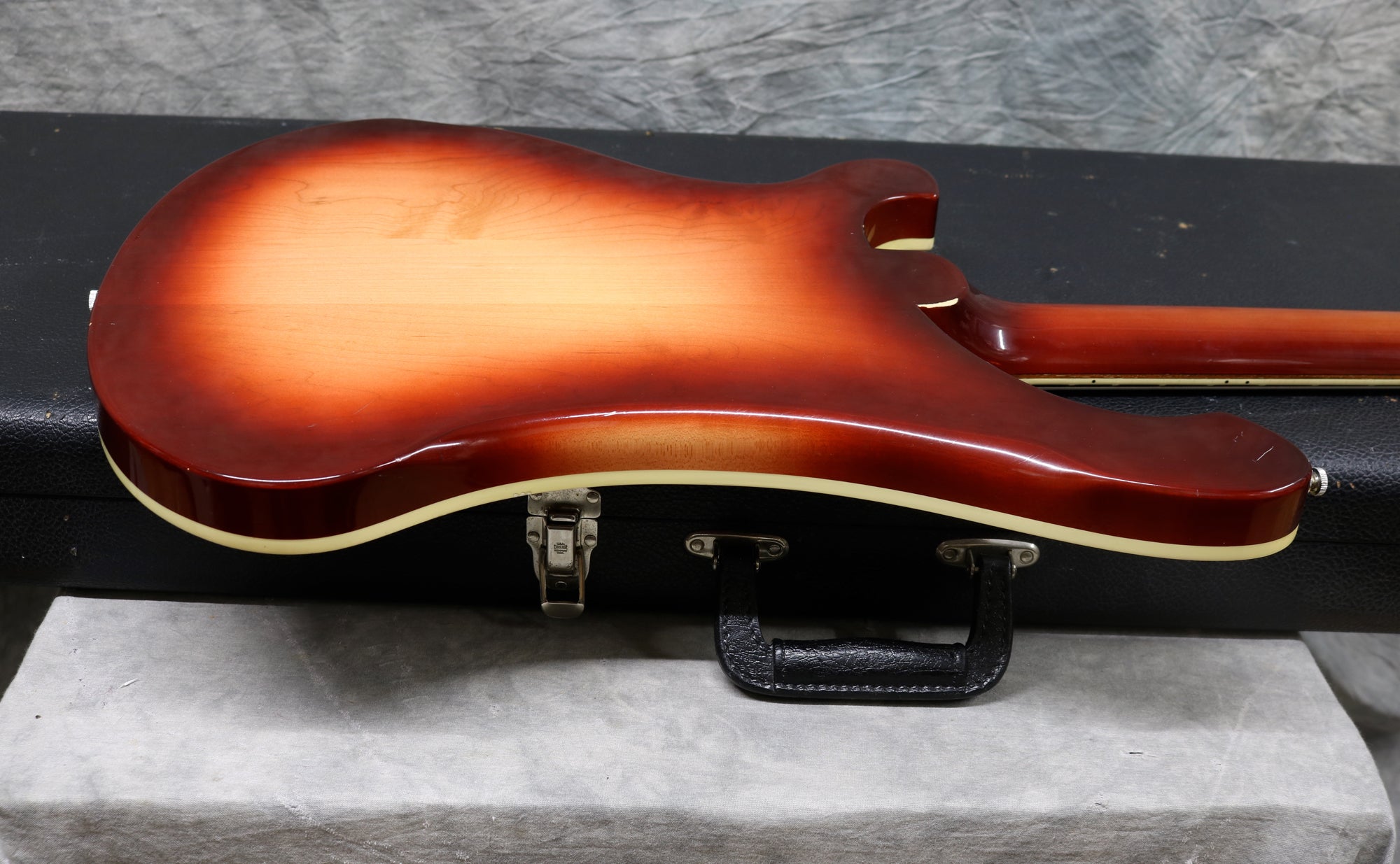 1987 Rickenbacker 4003 with a Fireglo finish in excellent + condition. It's missing the pickup cover but otherwise all original including the case. Serial L0 7121. It plays and sounds great and the action is low. The finish on the body and neck are in excellent condition. There are a few very small dings in the finish and some very light buckle rash. Otherwise extremely clean for a 33-year-old instrument. All-round lovely bass.