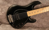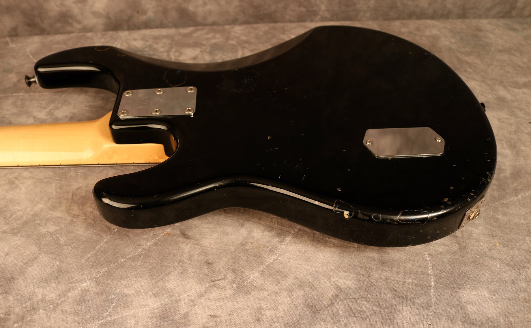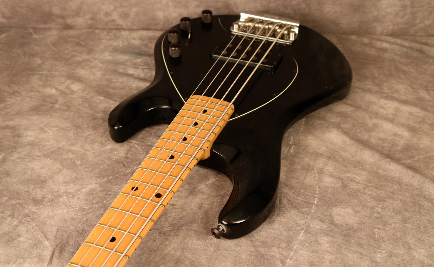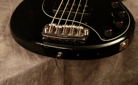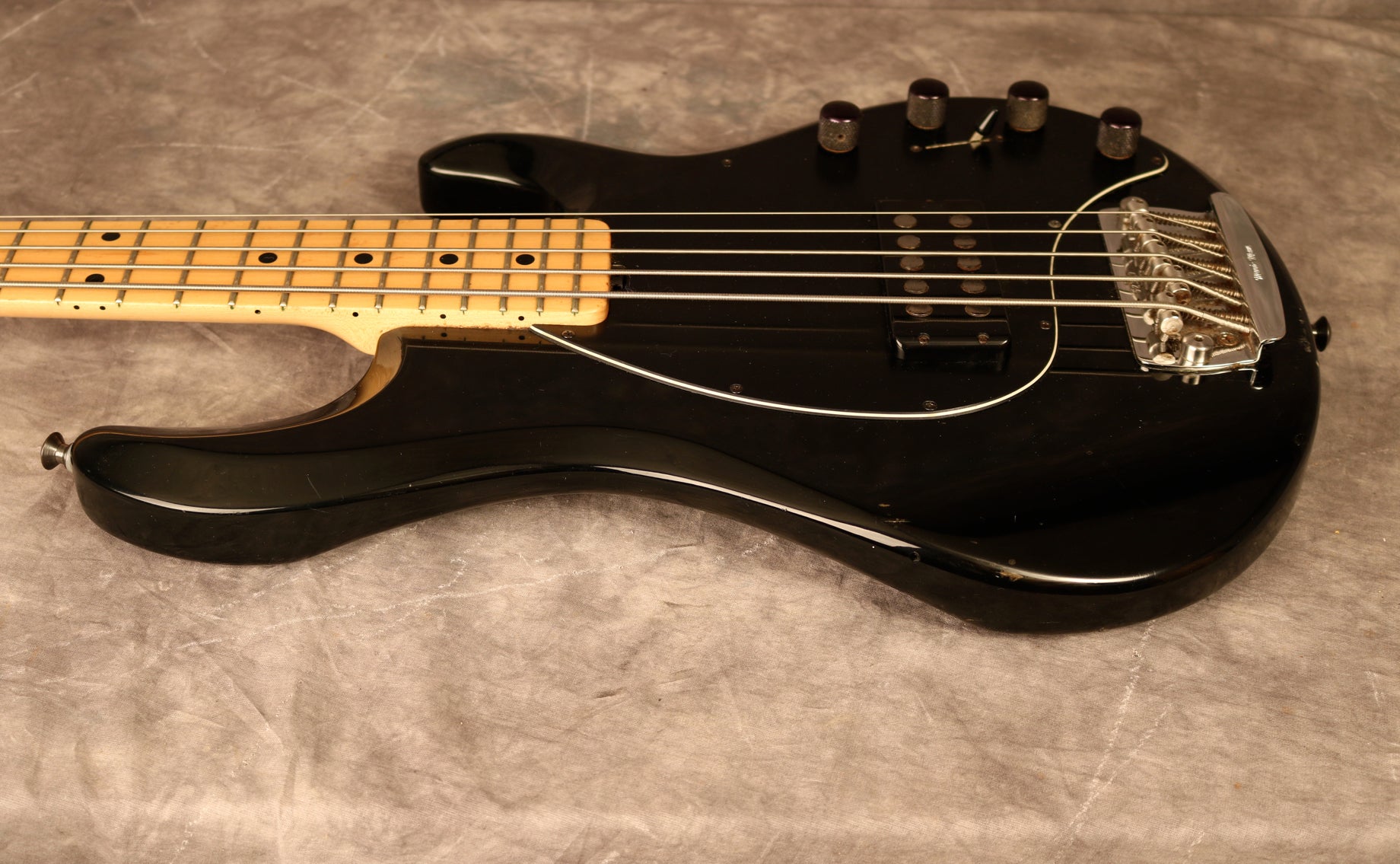 1991 Music Man Stingray 5 bass in good condition. Black finish. 3 band EQ, 3-way pickup selector (coils 1&2 in series/coil 1/ coils 1&2 parallel) Black pickguard. There's a few dings and patches of wear to body and headstock. The frets also show a little wear.