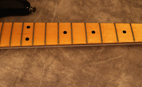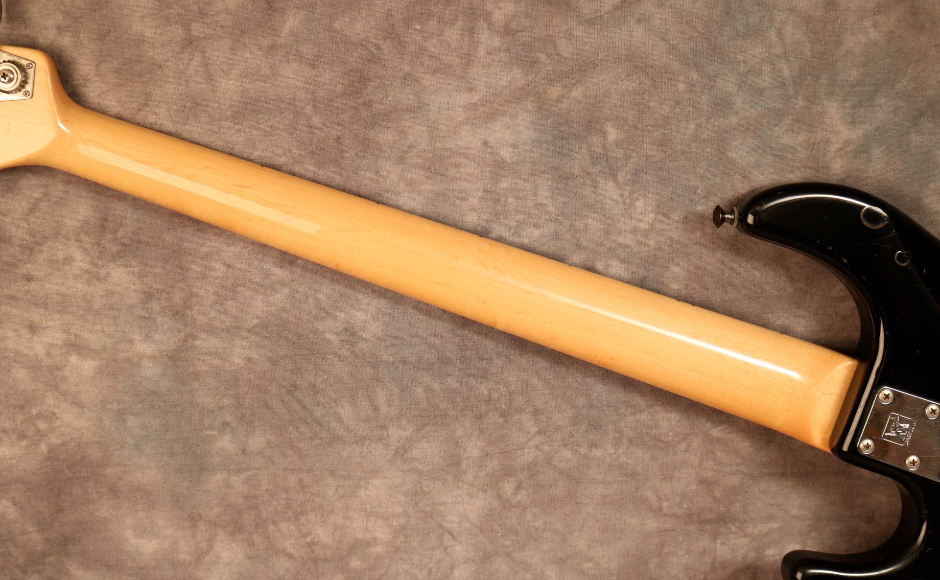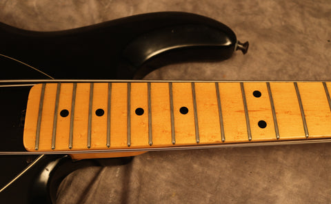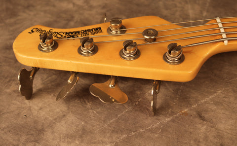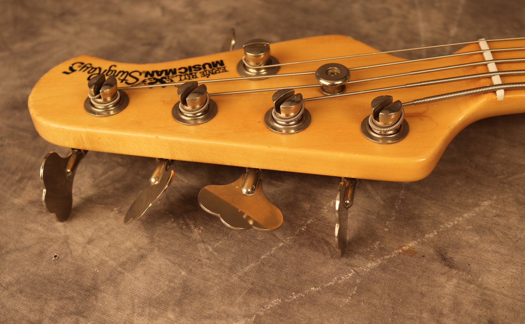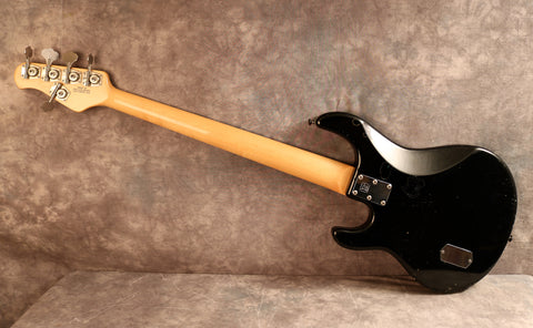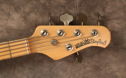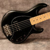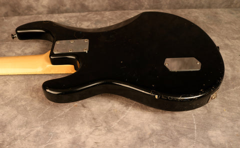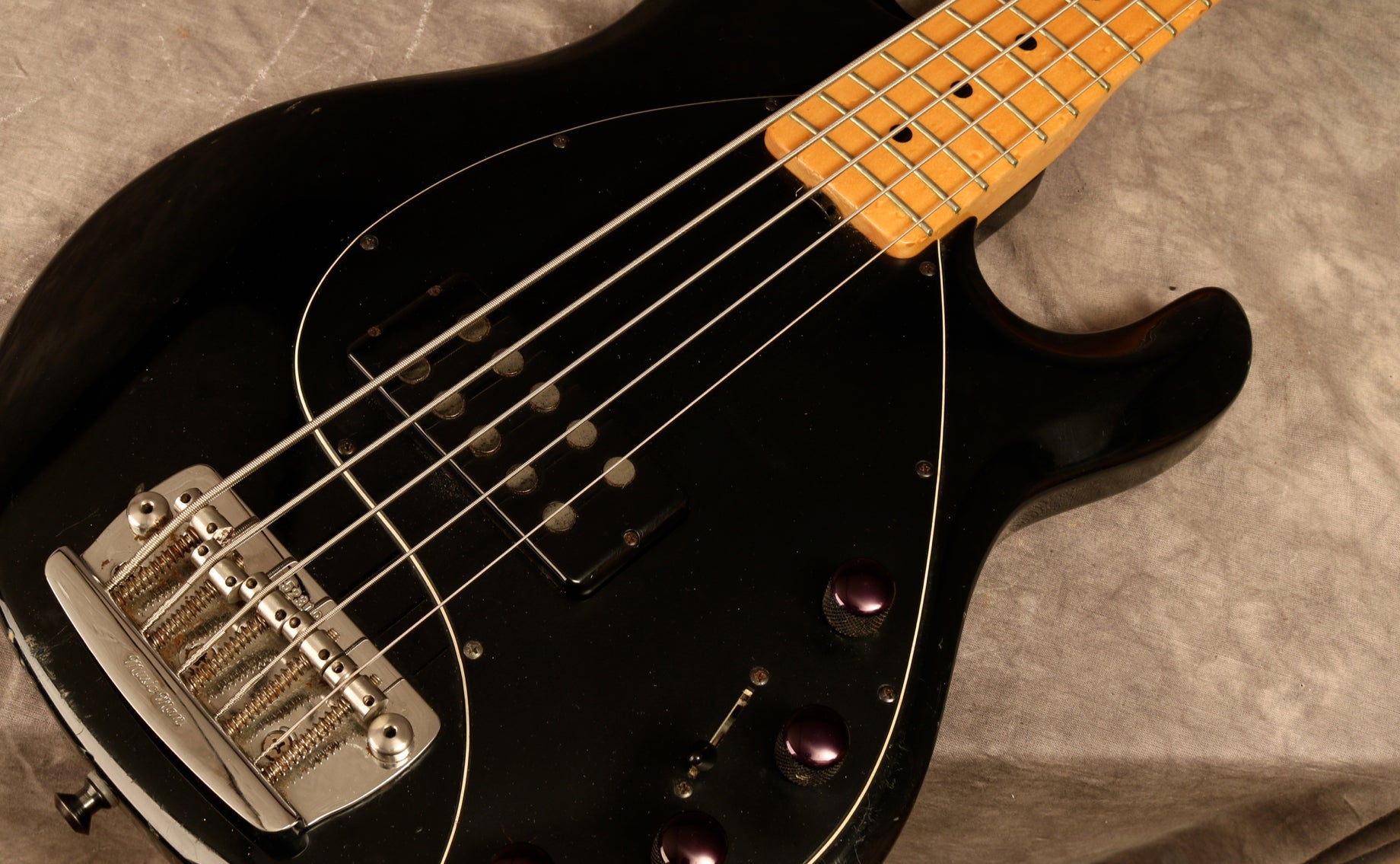 1991 Music Man Stingray 5 bass in good condition. Black finish. 3 band EQ, 3-way pickup selector (coils 1&2 in series/coil 1/ coils 1&2 parallel) Black pickguard. There's a few dings and patches of wear to body and headstock. The frets also show a little wear.