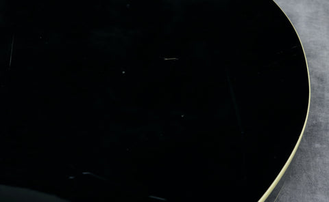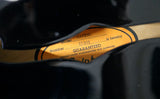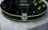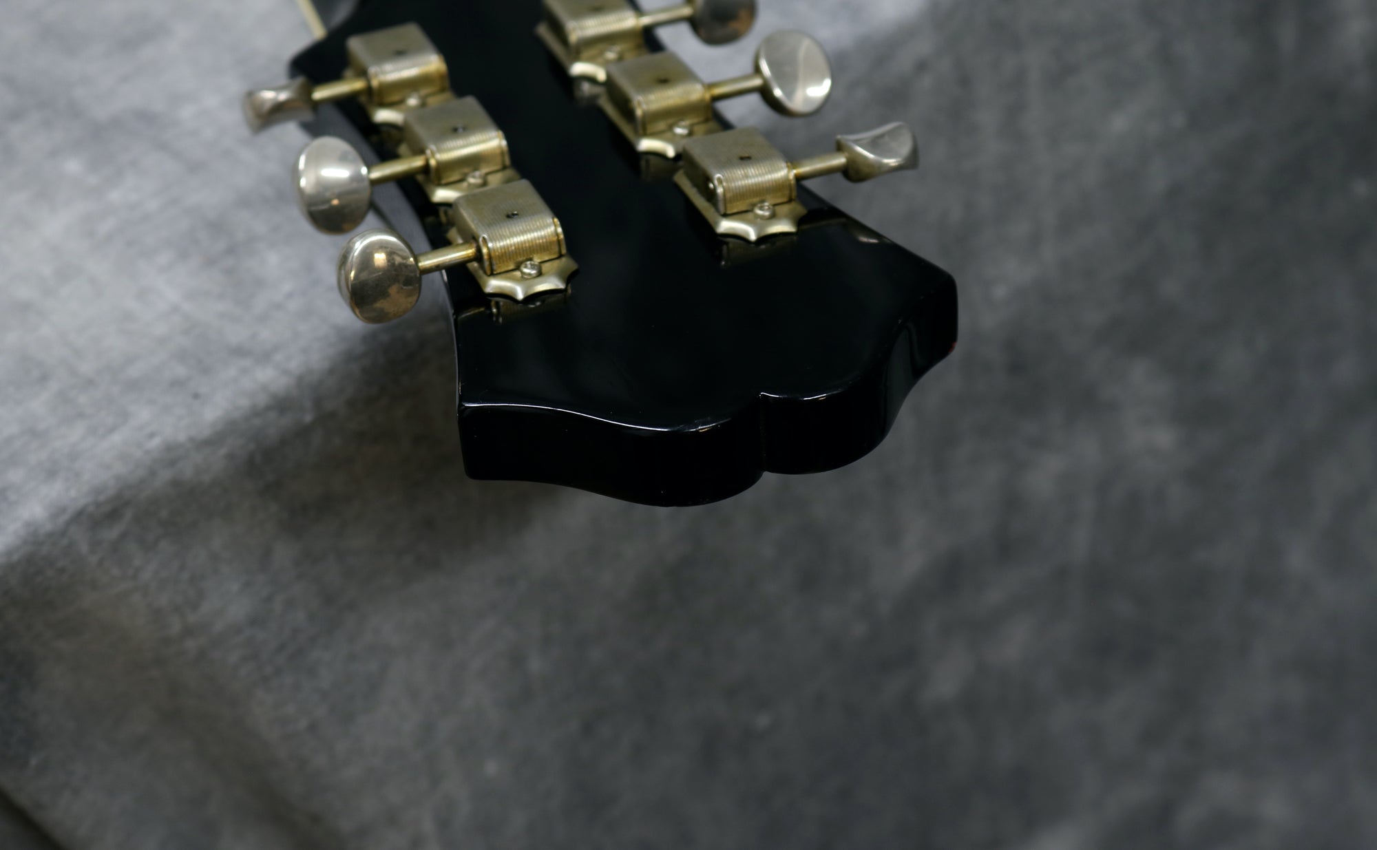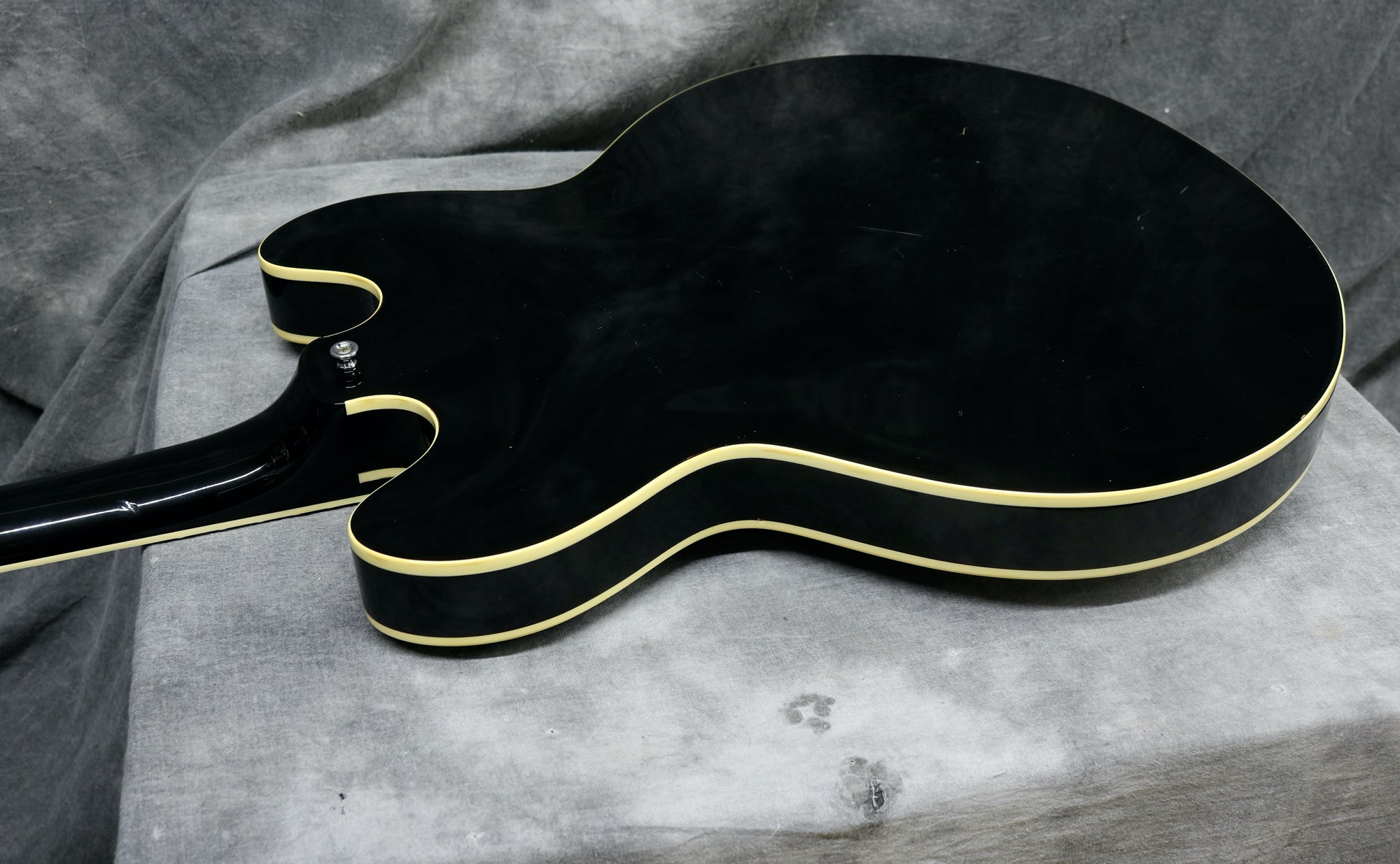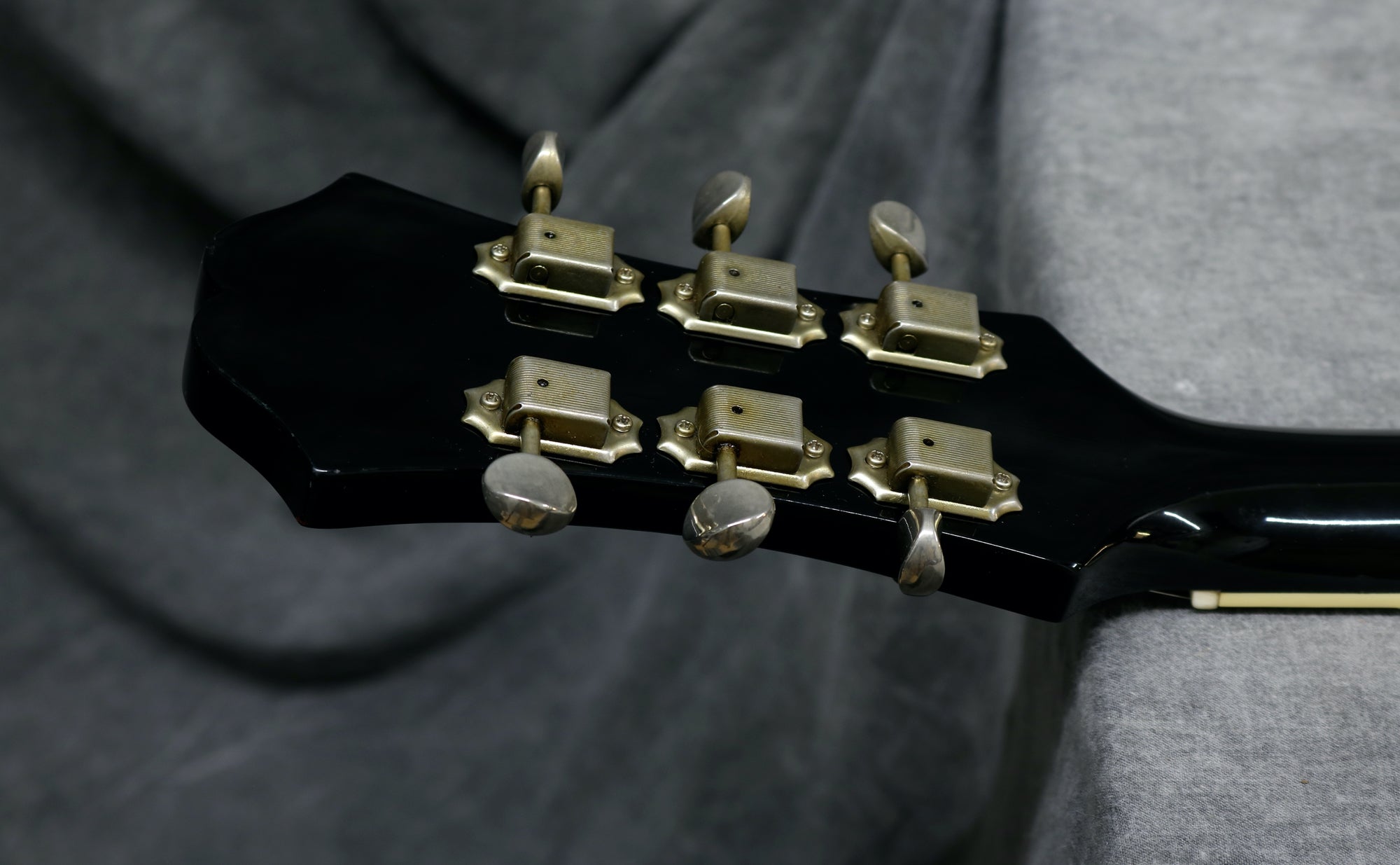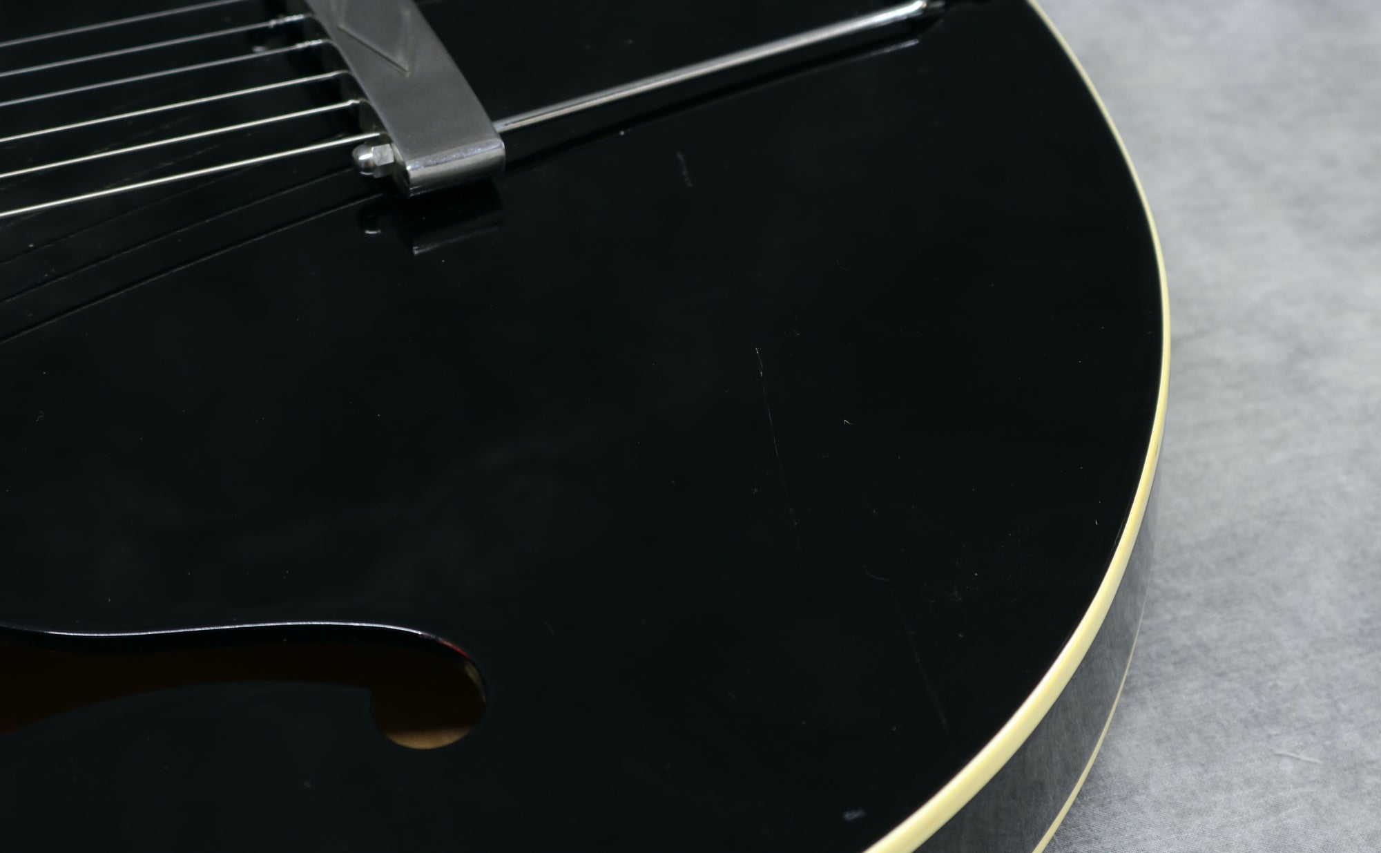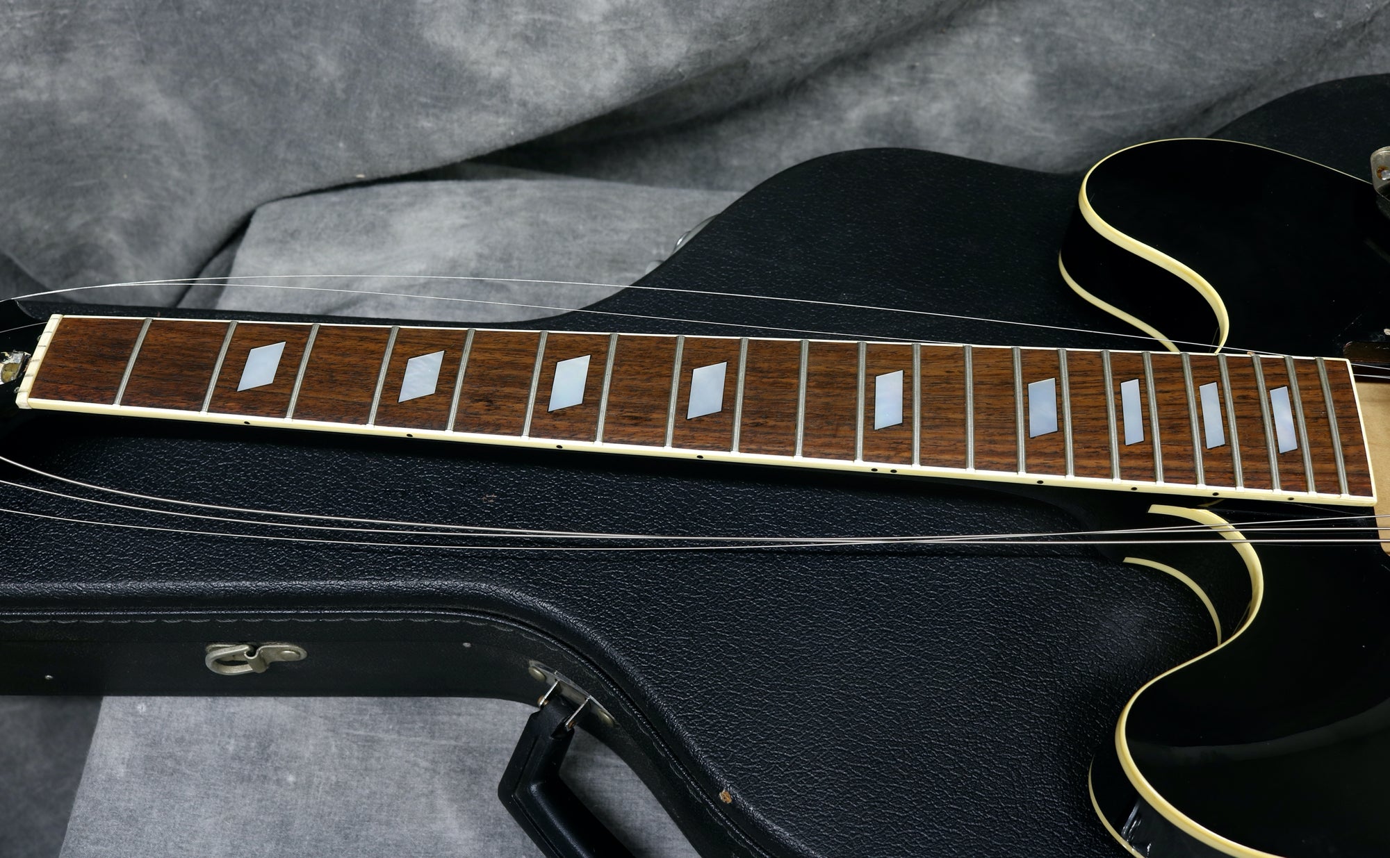 The black gloss finish has a few light scratches and a small dings, the nickel hardware has surface patina. This guitar has been fully checked over & set up in our workshop with a fresh set of strings and is an all-round excellent sounding and playing guitar. Set up with a low action allowing for very smooth movement around the fretboard. It has a big rich tone both plugged in and acoustically. It weighs 6 lbs 8.5 oz. Nut width 40.2 mm, depth at 1st fret 20.2 mm, at 12th 23.1 mm.