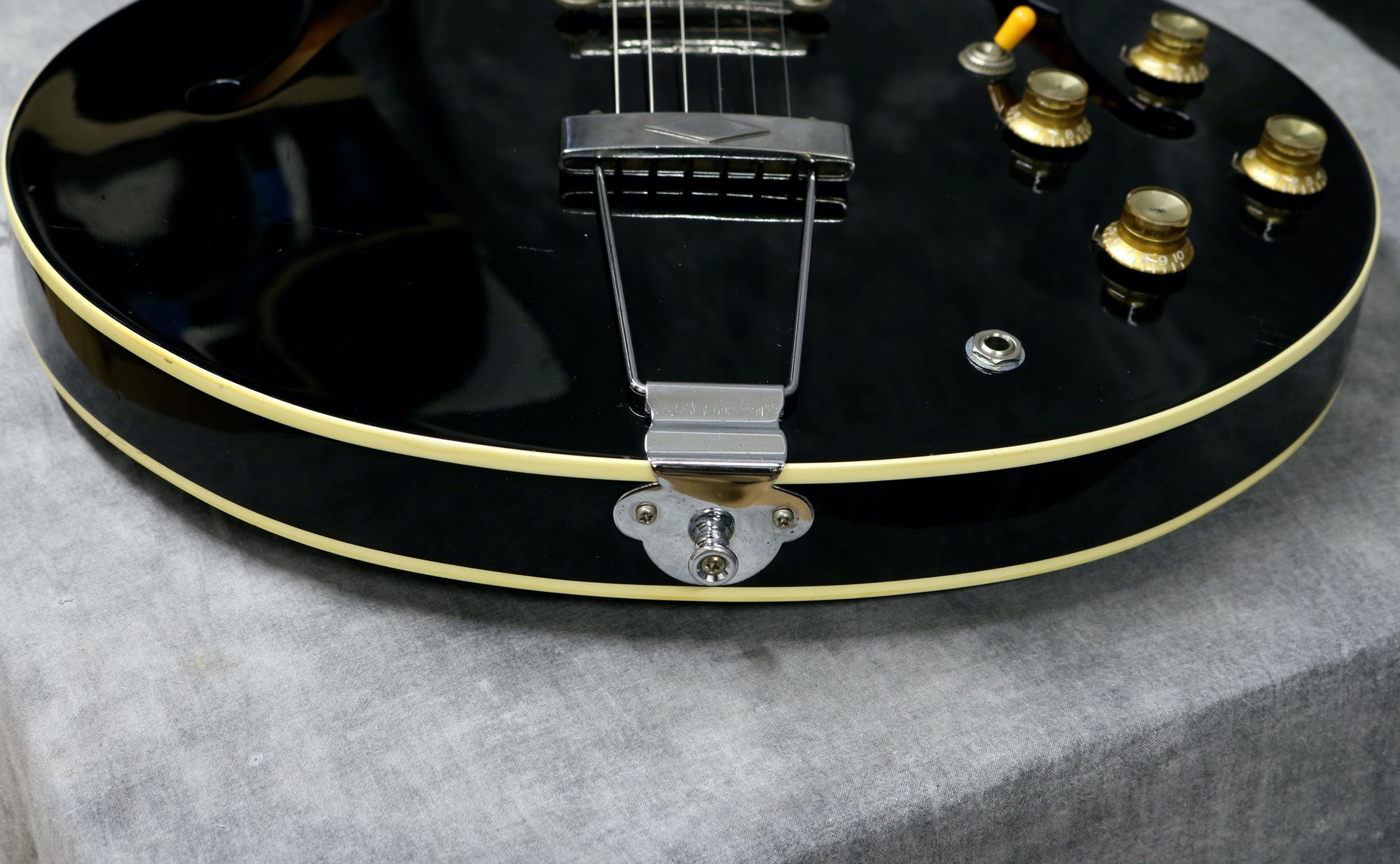 It has a maple neck with a slender and fast C shaped profile. The rosewood fretboard has medium jumbo fretwire. The frets are in great shape with very little sign of wear and the headstock has Kluson Deluxe-style nickel tuners. It has a nickel ABR-1 bridge which has the correct "Made in Japan" text on the underside, and the orange oval label visible through the F hole has the correct five digit serial for Terada production (3 for 1993, 5 for Casino, and a trio of digits for production number).