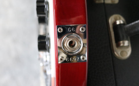 All hardware and electronics are in fine working order. The truss rods are fully functioning and the action has been set nice and low in our workshop with a set of round-wound strings. Serial G6 6697. Weight 9lbs 13.5oz. Nut width 44.75 mm. Depth at 1st fret 22.5 mm.