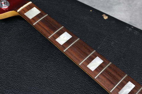 There are a few very small marks and tiny dings to the finish on the body but nothing major. They're so small it was hard to picture them. ( I have tried with one example to give an indication) The frets are in great shape with virtually no wear. The truss rod is fully functional. There is a patch of discolouration in the finish on the back of the neck behind the 1st fret. This seems to have come from a reaction to the neck support in the case.