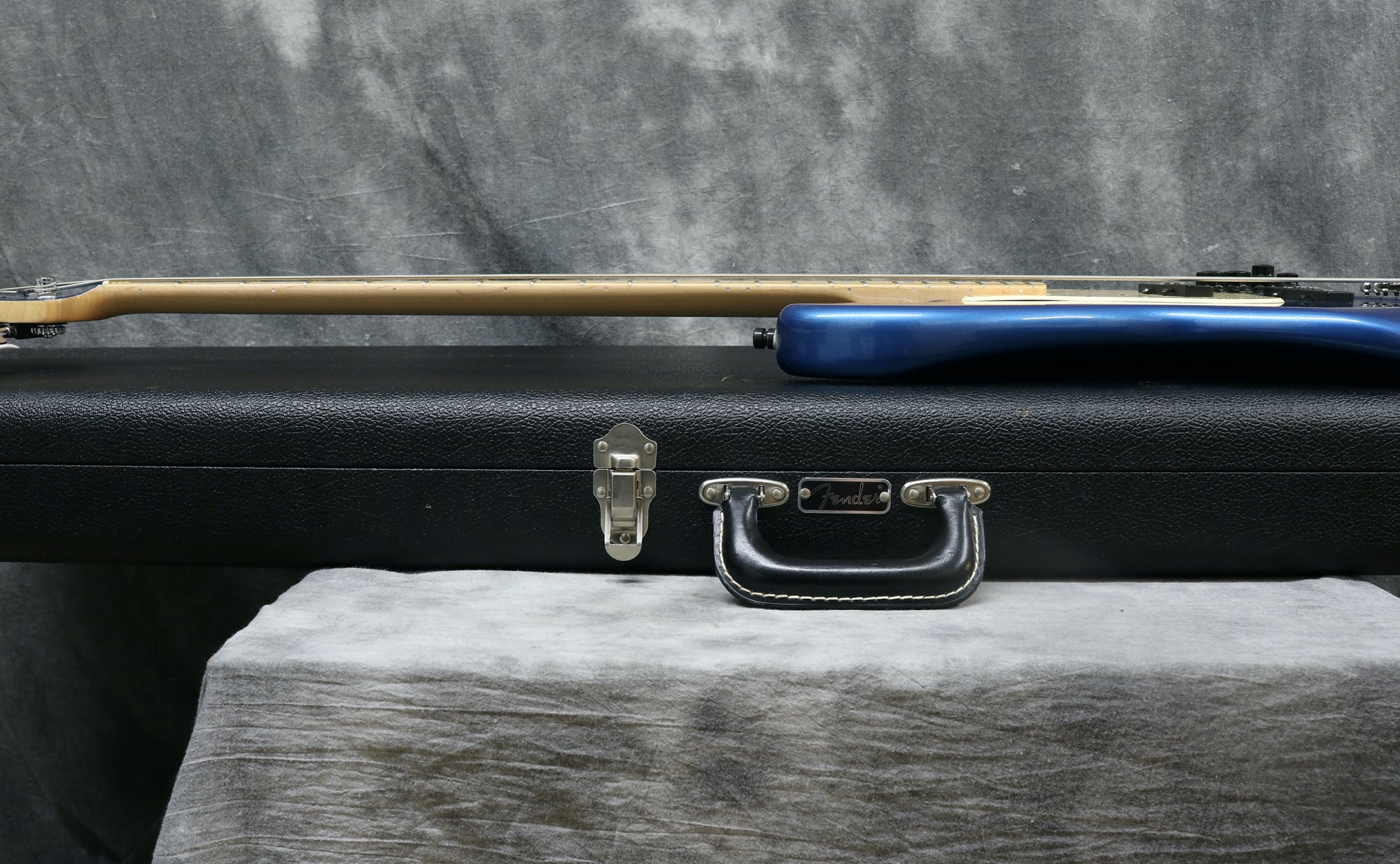 It has a few very tiny scuffs and marks in the finish but nothing major. There are 2 screw holes in the body by the bridge from someone previously fitting a bridge cover. It has the original case, with 2 extra pickguards, the COA, polish cloth and custom care pack. It also comes with a vintage style leather Fender strap and strap locks. The frets have virtually no wear. The tone is superb, this bass really sings.