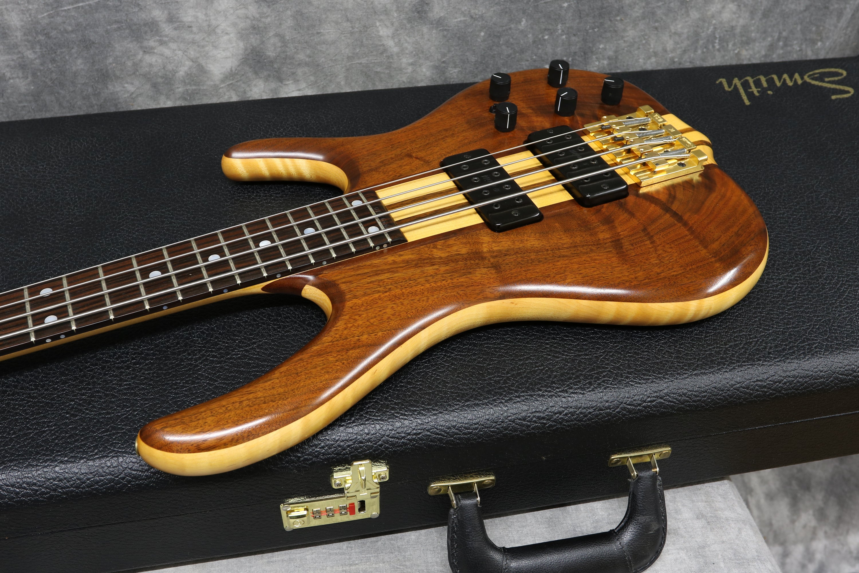Figured walnut top and back with matching headstock. The core between top and back is Tiger Maple as are the body feature strips. The neck is made from 5-piece laminated hardrock maple with shedua strips and heel features. Madagascar Ebony fingerboard. Mother of Pearl top & side Dots, Smith Humbucker pick-ups, 3 Band EQ 18v Preamp. Smith Gold hardware & Dunlop strap-locks.