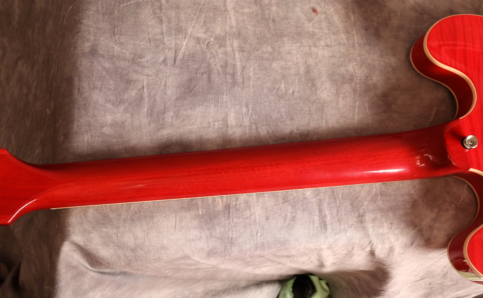 2014 Gibson Memphis ES335 Dot neck reissue. Serial number 10644713. Model number ESDT CHNHI. Nitro gloss Cherry finish with a beautifully figured top, back and sides. Mahogany neck with a Rosewood fretboard and dot position inlays. It has Nickel hardware and Grover machine heads. Classic 1959 ES 335 body style with Mickey Mouse ears.
