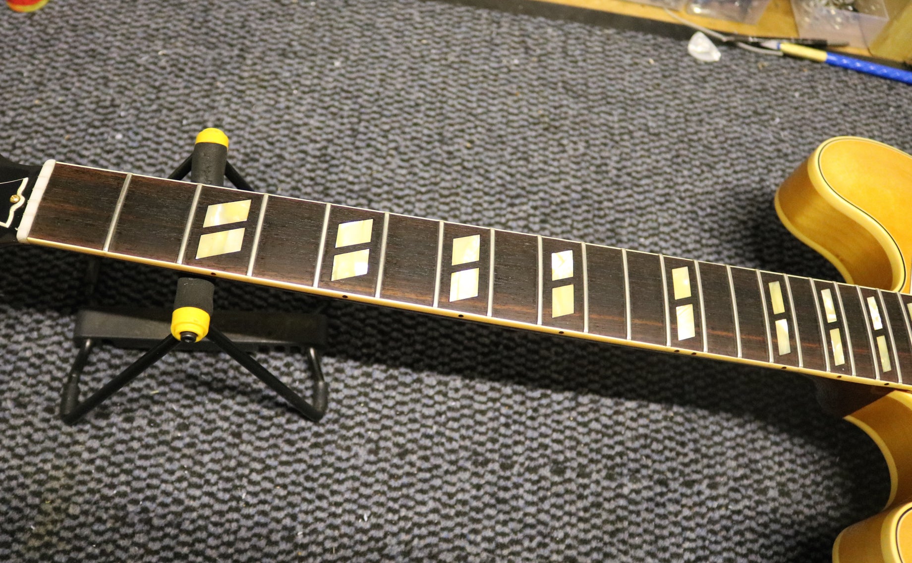 This guitar has been set up by our technician with a fresh set of Ernie ball 11-48 strings. Nut width 43.25 mm, depth at 1st fret 22.25 mm. Weight 8lbs 4oz.